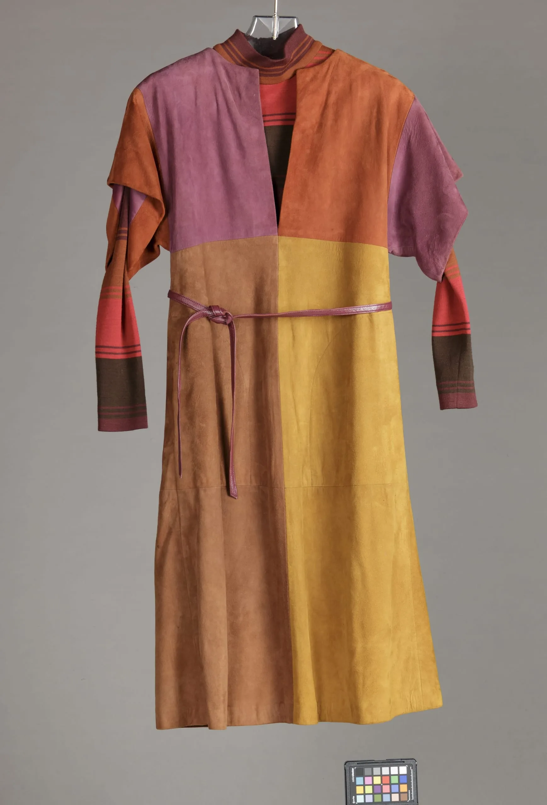 - Overdress: suede; Dress: wool knit; Belt: leather