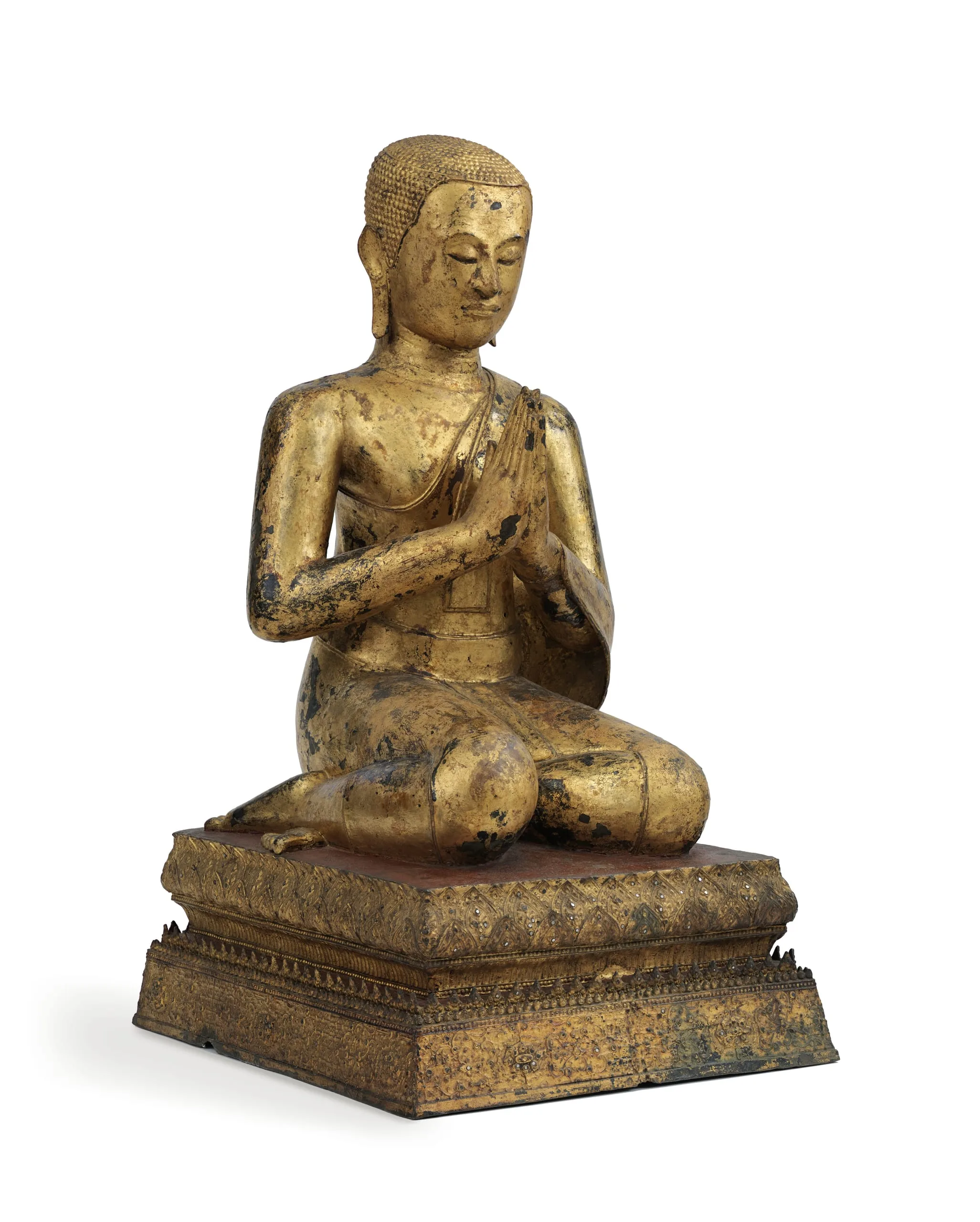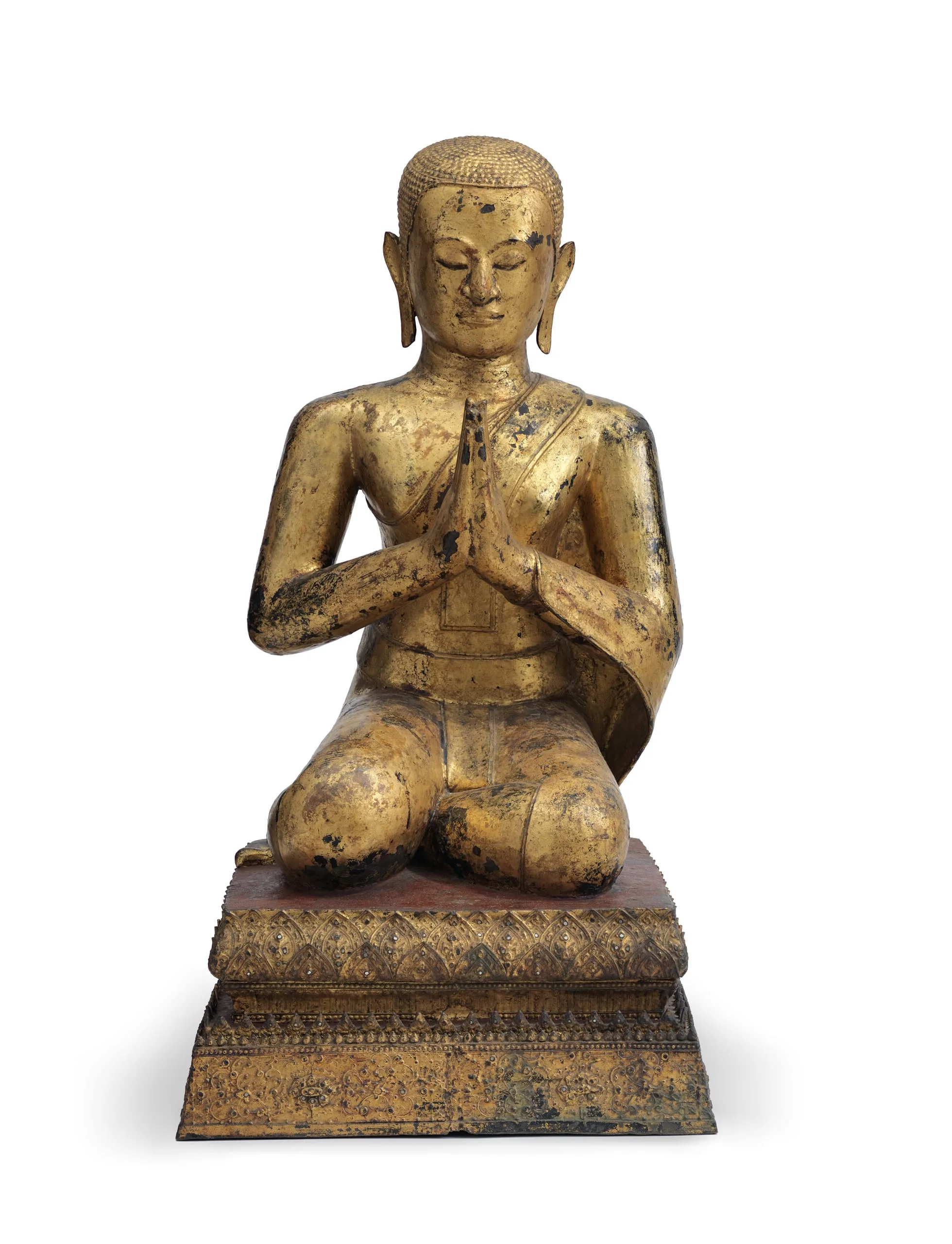 This gilt copper alloy representation of a kneeling monk, and its mate M.2003.231.1, were created to be placed on each side of the main image of Buddha Shakyamuni in a Buddhist temple. This compositional triad was popular in Southeast Asia (see M.86.342.2 and M.90.57). As determined by the direction of the monk’s lower legs, this sculpture was intended to be placed to the proper right of the Buddha. He is likely intended to represent Shariputra, one of his two principal disciple monks. The second monk, Maudgalyayana, would have been on the proper left side.