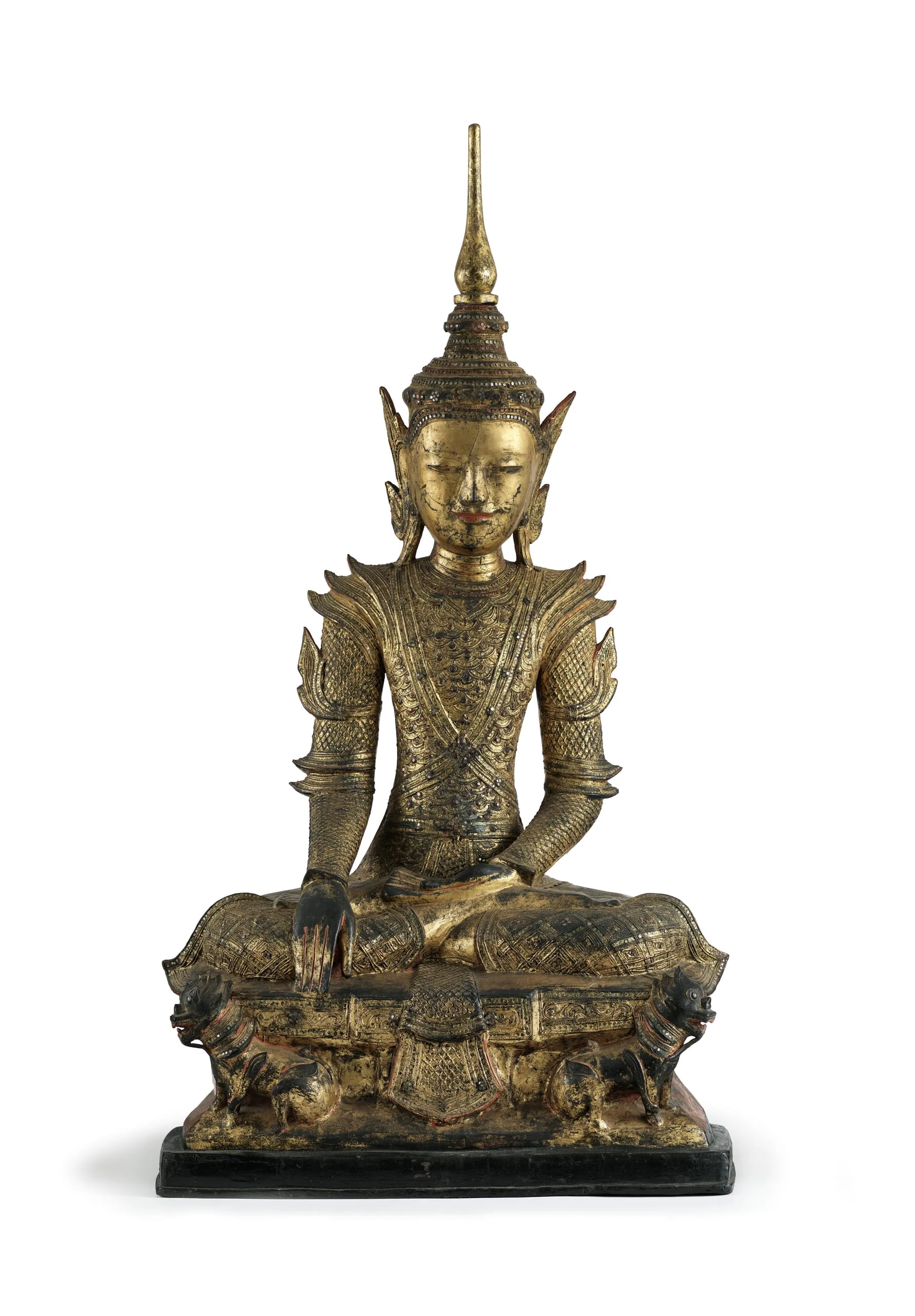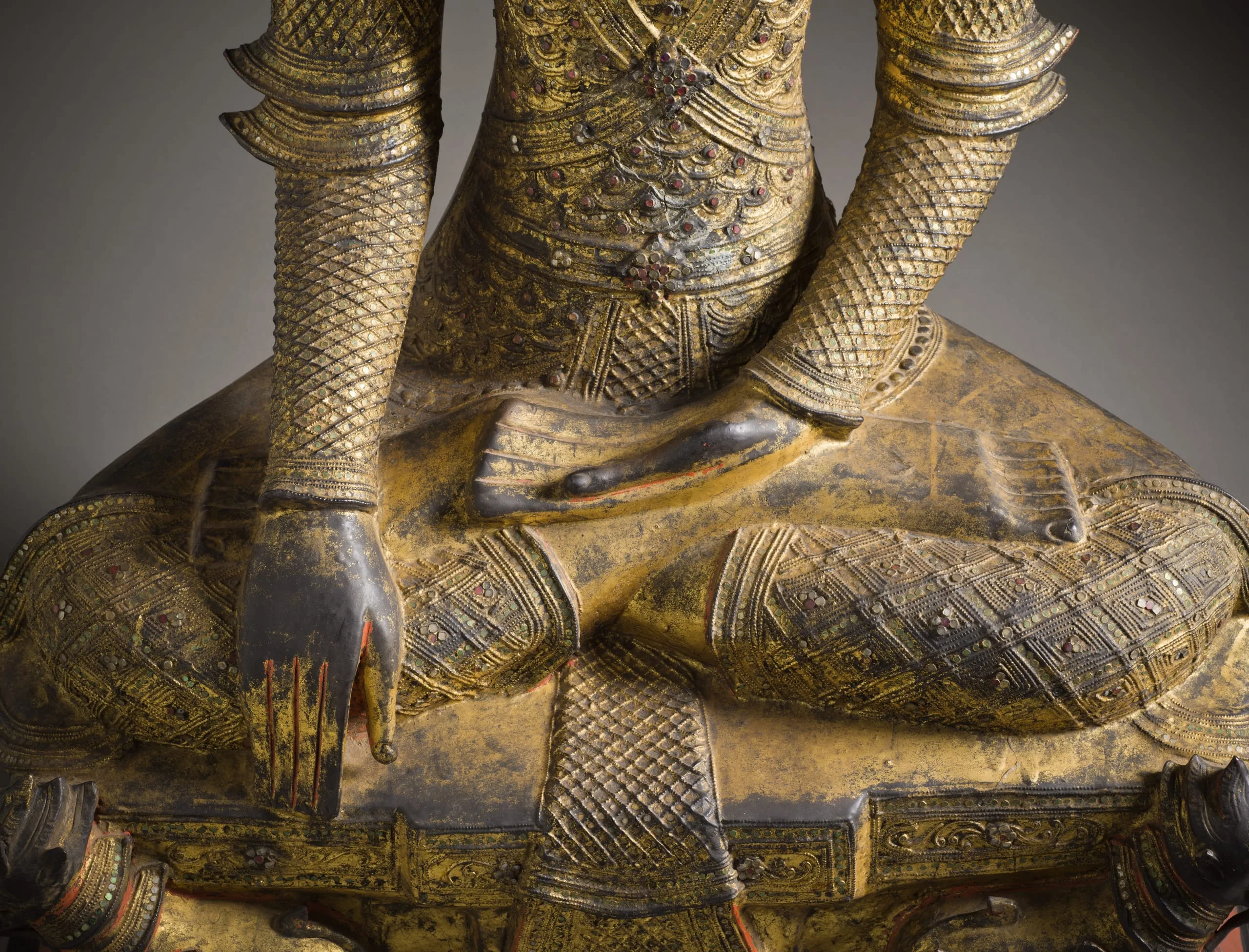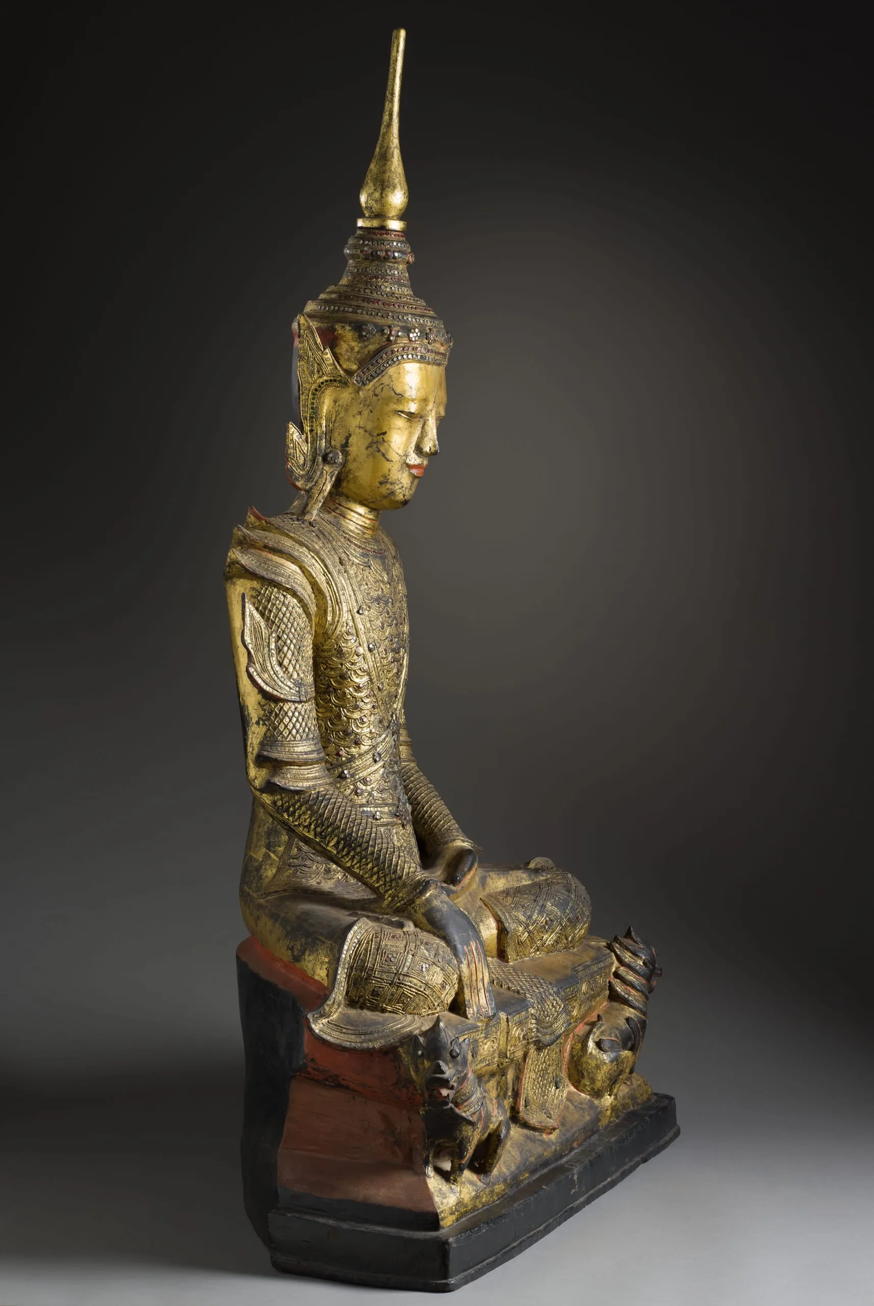 This large Burmese image of Buddha Shakyamuni attributed to the 18th-19th-century was made using the hollow dry lacquer technique that originated in China and was well established in Burma by the 18th century. A core image or armature is first modelled in clay on a wooden base. It is then overlaid with strips of cloth impregnated with lacquer sap. They are then covered by a wash of fine ash and water, and a putty of lacquer sap and teak sawdust (thayo). The image is further molded and shaped, with final details finished separately and then attached. Once the outer layers of lacquer are dry, the inner clay core is removed. Finally, the outer image is sealed, coated with a refined lacquer mixture, polished, and gilded. The Buddha can sit on a lion throne, as here, or on a hexagonal pedestal.