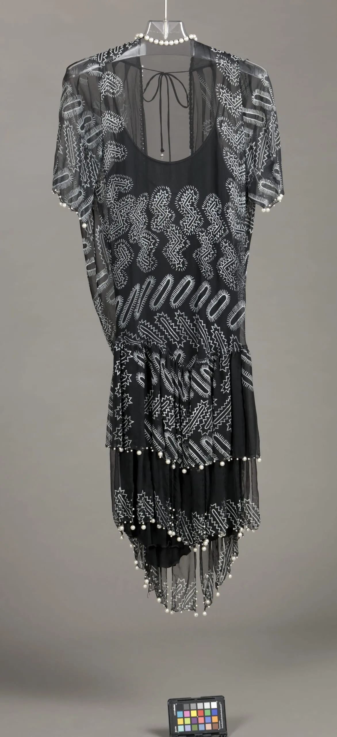 - Dress: Silk plain weave (chiffon), screenprinted, faux pearls; Underdress: Silk knit (jersey), rayon satin, plastic beads