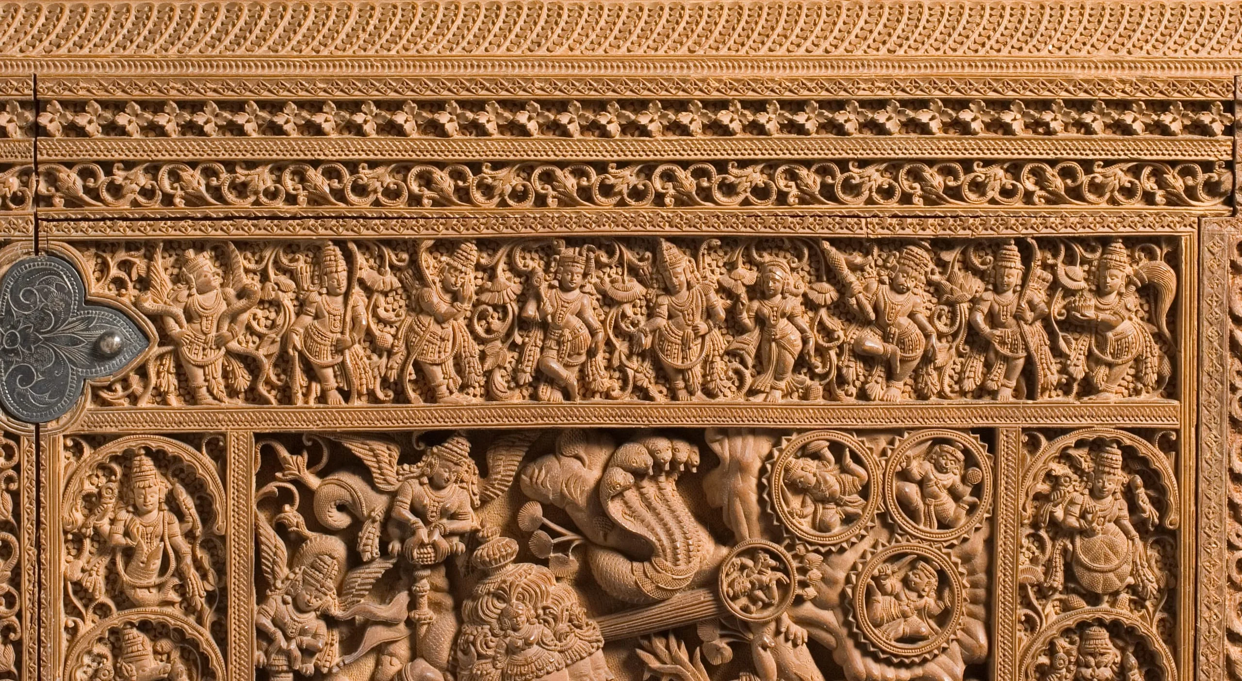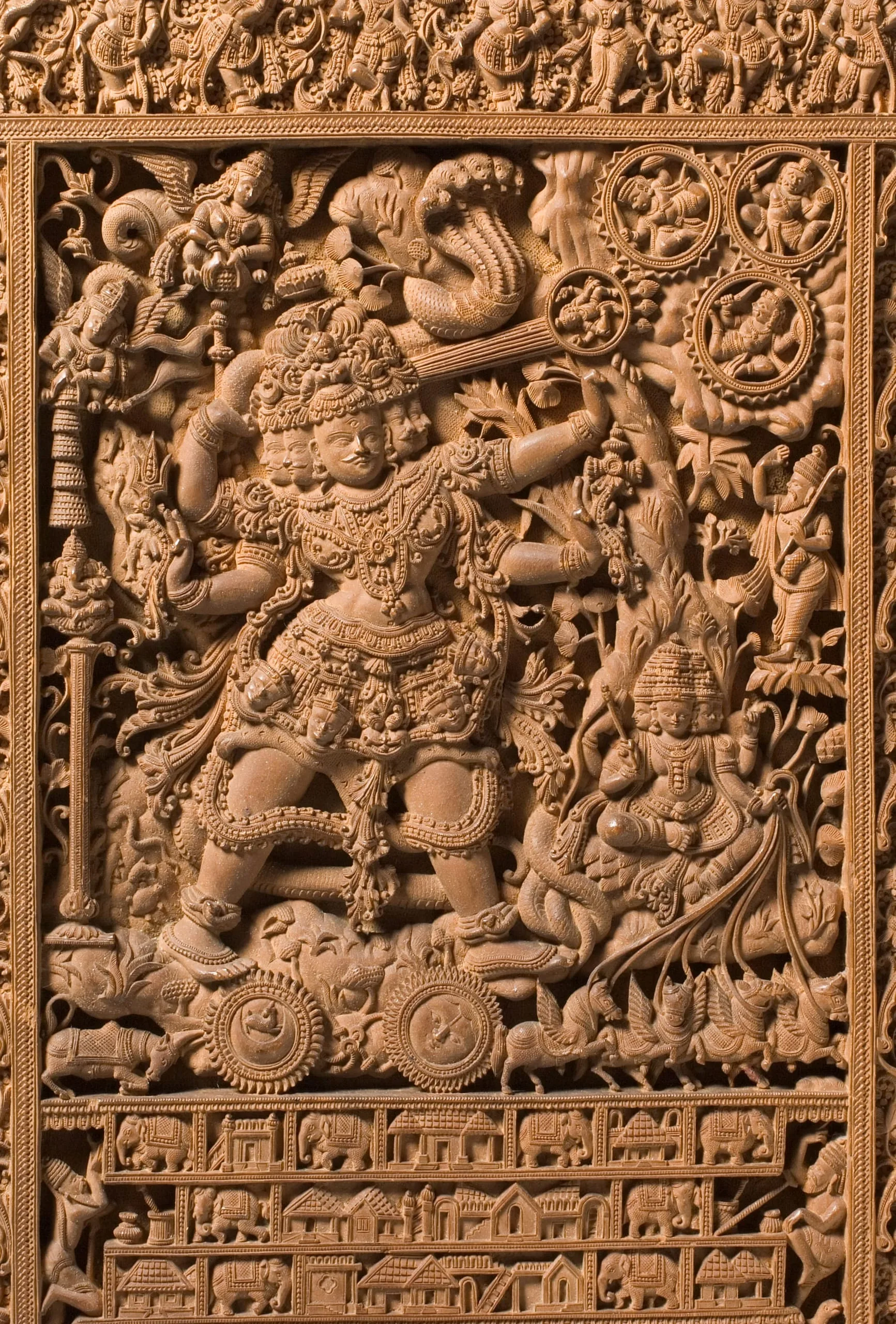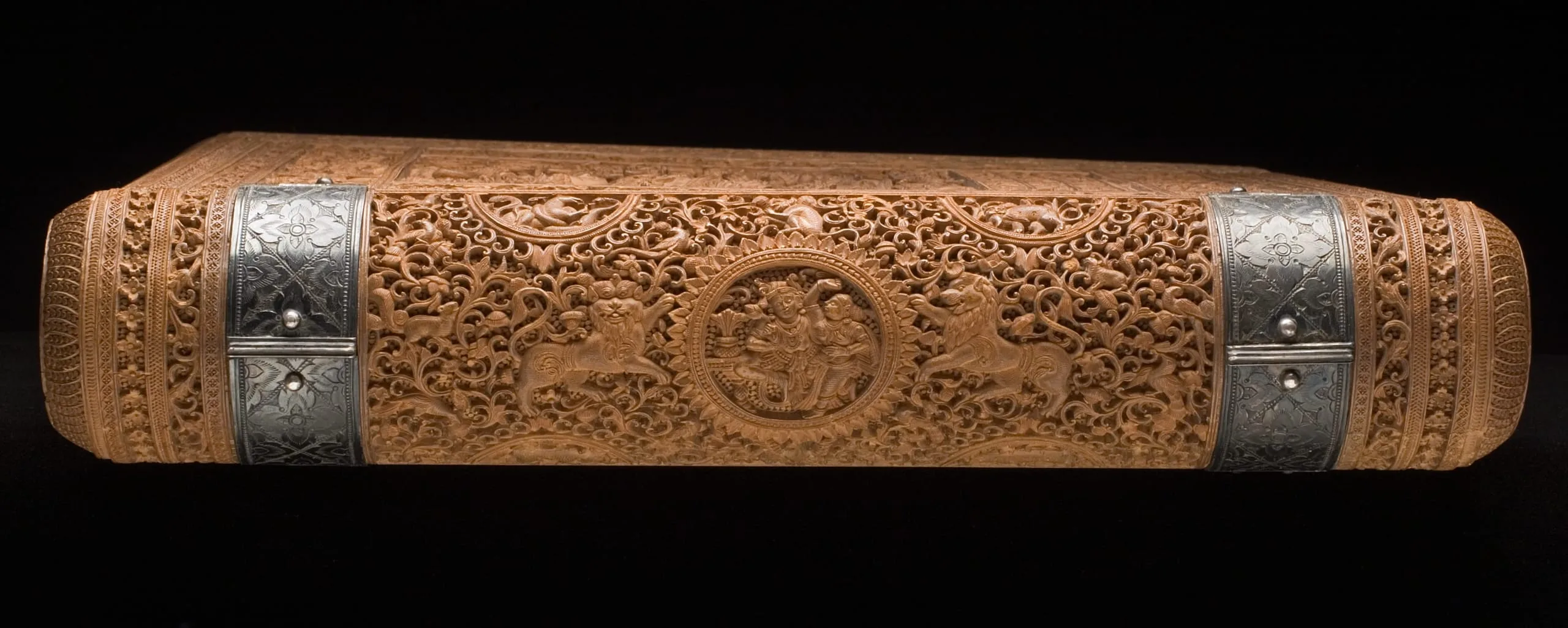 Complexly carved of fragrant sandalwood, the central panel of this album cover depicts the Hindu god Shiva in his major iconic form of Tripurantaka, the Destroyer of the Three Cities of the Demons. Shiva shoots an arrow at three demonic warriors in circular fortifications in the upper right corner. His bow is a tree and his bowstring is a serpent. Shiva stands in a celestial chariot with the sun and moon as its wheels. The chariot is drawn by four horses representing the four Vedas, the four sacred books of proto-Hindu mythology. His charioteer is Brahma, the four-headed priestly Hindu god of creation. Shiva’s bull mount is in the lower left corner. Beneath the main scene are three architectural registers representing the golden city of the demons. It was located under the ocean, which is symbolized by the tiny head, tail, and feet of a tortoise at its base. This principal tableau is flanked by the twelve avatars of Vishnu and, across the top, are heroes of the ancient Indian epics, the Ramayana and Mahabharata. The cover’s spine is adorned with Vishnu and his wife Lakshmi heralded by rampant lions. Baby Krishna is in a central medallion on the otherwise undecorated back cover.