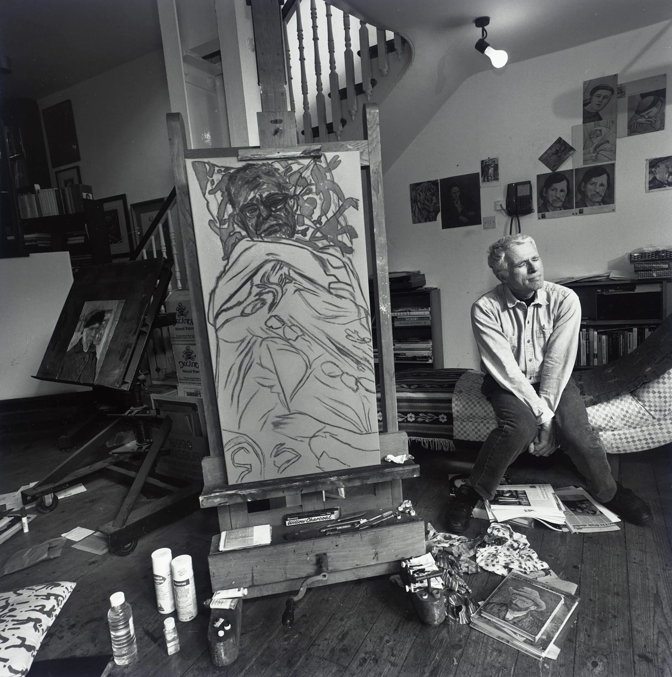 Black and white photograph of a gray-haired man seated on a studio floor beside a large easel holding an in-progress charcoal portrait, surrounded by art supplies
