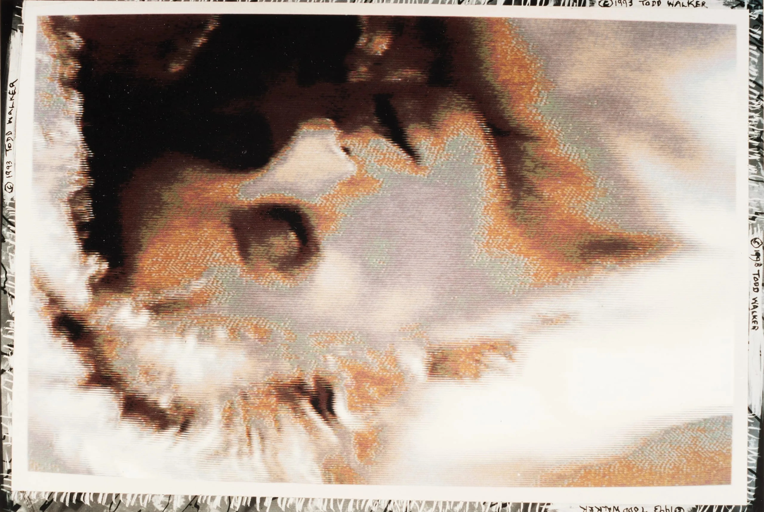 Horizontal print with halftone texture showing a close-up, abstracted human face in tawny orange, gray, and white tones, dissolving into frayed edges against black