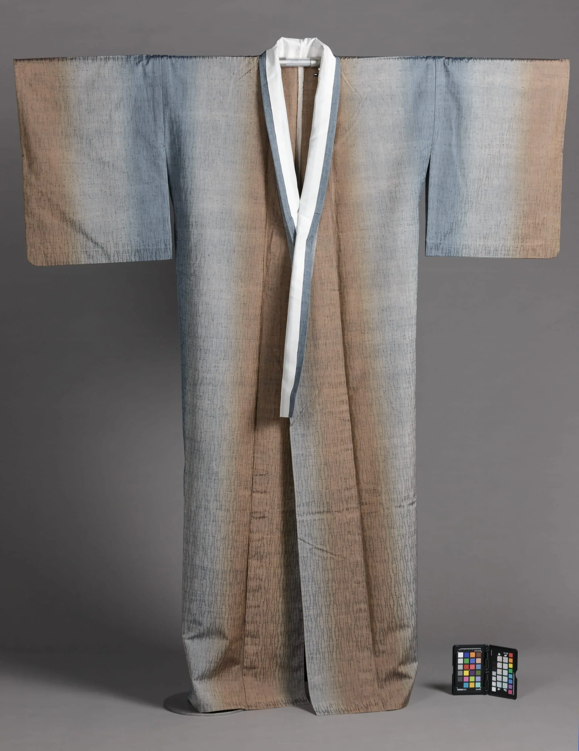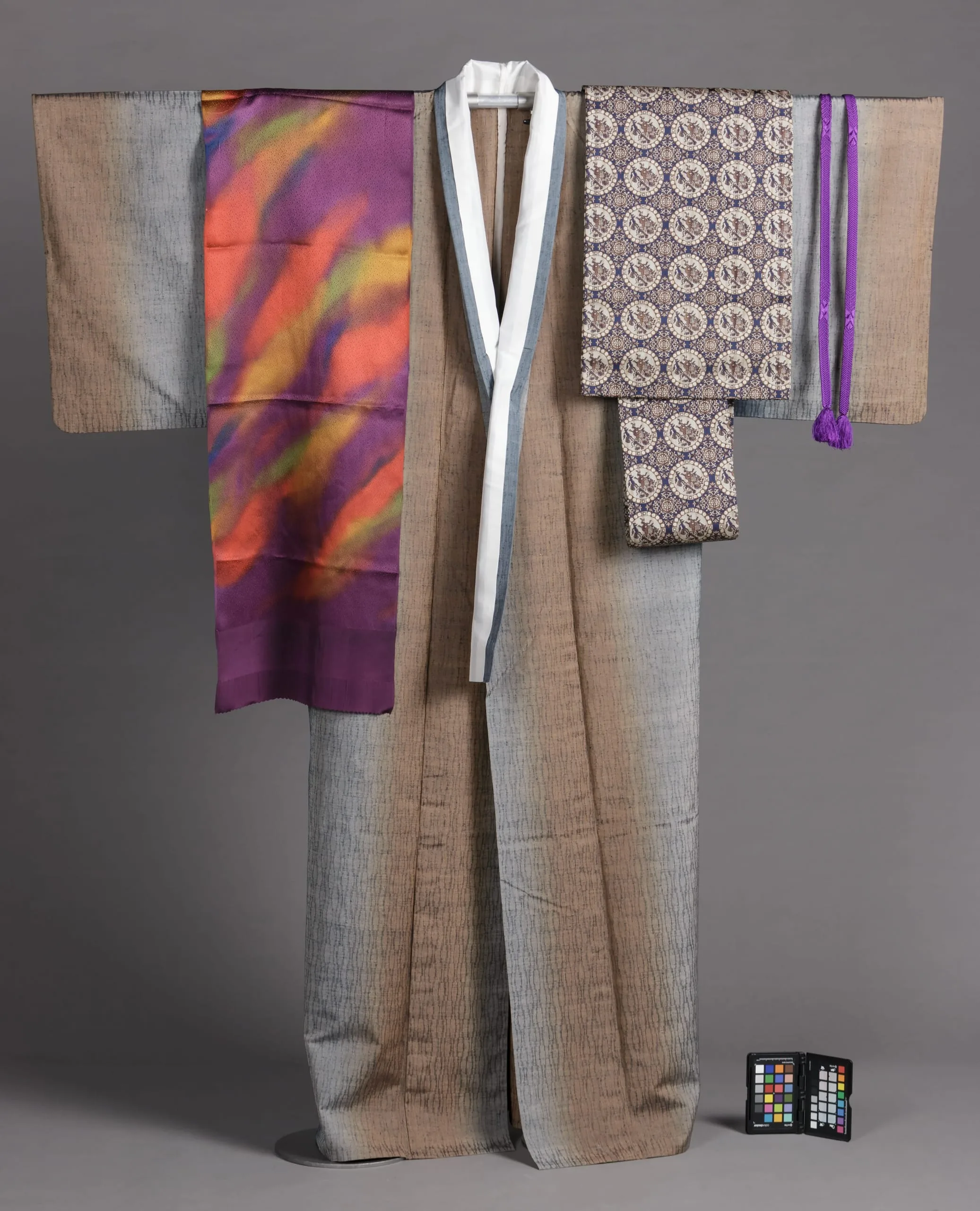 - Kimono: Silk damask; Obi: Silk warp-faced compound plain weave with warp patterning and metallic-plated-synthetic-slit film-wrapped-silk supplementary weft patterning; Sash: Silk damask, brush dyed; Cord: Silk, braided (kumihimo)
