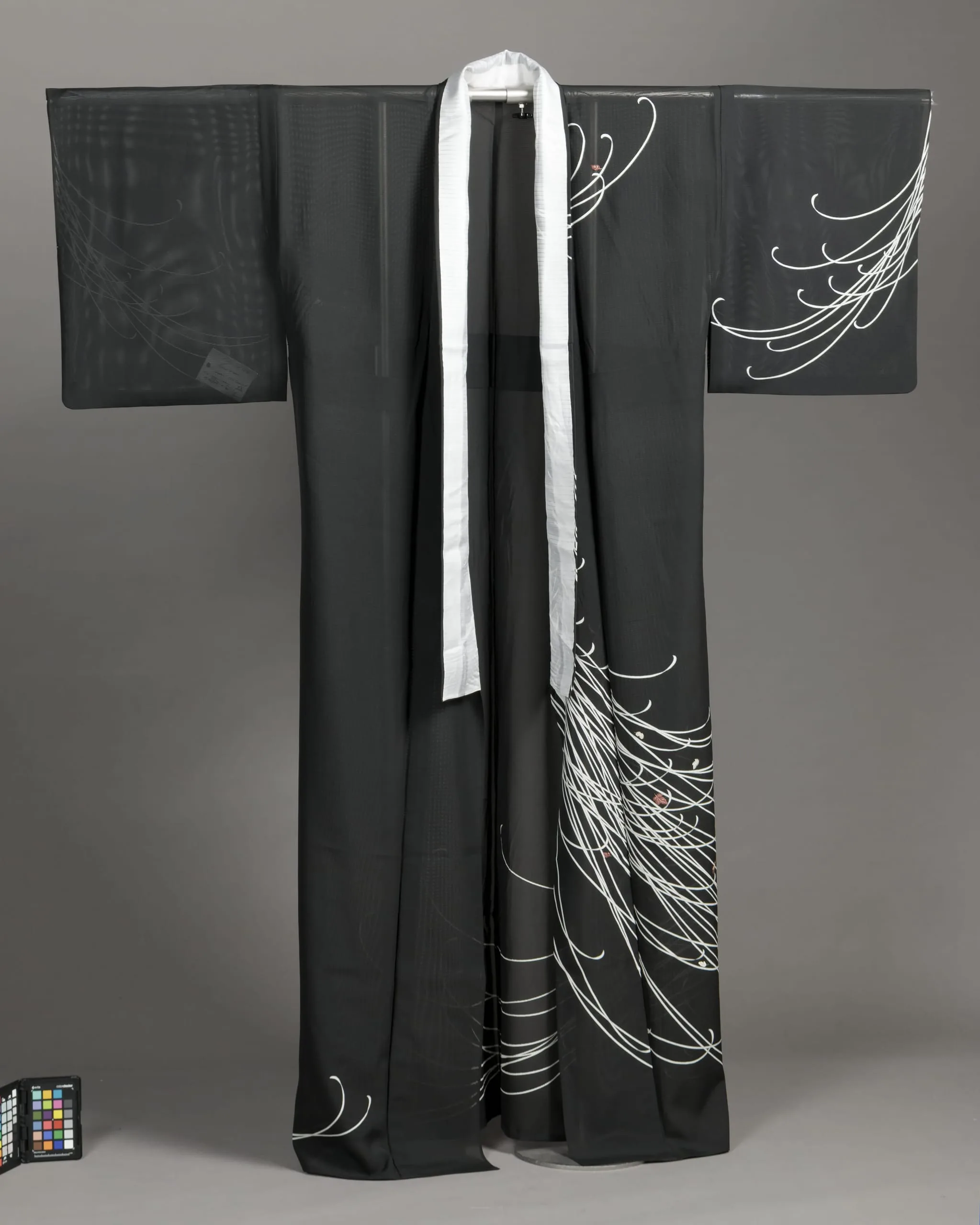 - Kimono: Silk gauze-weave (ro), paste-resist dyed (yūzen), with silver leave (surihaku) and silk and gilt-paper-wrapped silk embroidery