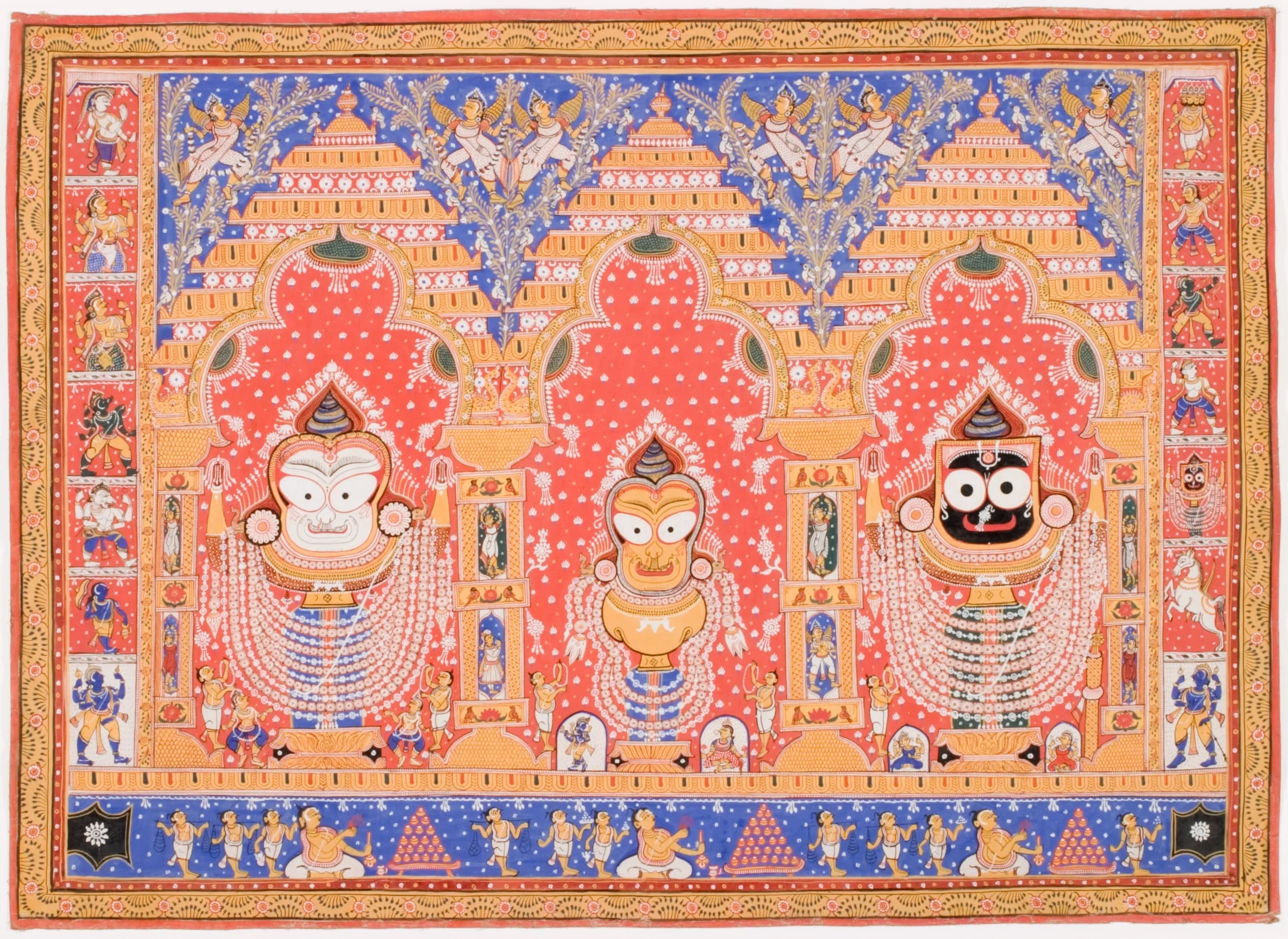 This finely detailed painting from the environs of the renowned Jagannatha temple in Puri, Odisha (formerly Orissa) depicts Krishna as Jagannatha, a special iconic form idiosyncratic to Puri. The dark-skinned Jagannatha is on the viewer’s right, his sister Subhadra is in the center, and his brother Balabhadra (better also known as Balarama) is on the left. The stylized deities have oversize eyes and wear conch shell crowns, floral garlands, and profuse jewelry, including distinctively shaped triple tiger-claw pendants. They are flanked by diminutive figures of priests offering garlands. The holy trinity is shown enshrined in a tripartite shrine, which represents the great temple of Puri itself. Celestial nymphs (apsarasas) carrying garlands fly above the temple. The shrine pillars are embellished with cartouches inset with auspicious women and two male figures making salutatory gestures. At the base of Jagannatha are two small images of four-armed goddesses. At the base of Subhadra are small images of Krishna fluting and his consort Radha. Krishna’s avatars and several divine figures are depicted in vertical registers flanking the central panel. Along the bottom Hindu priests perform rituals with food offerings.