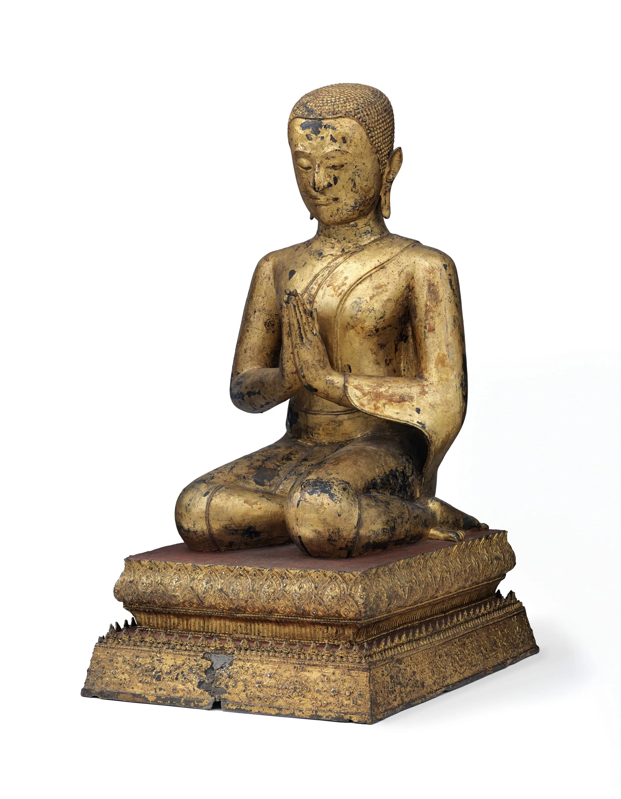 This gilt copper alloy representation of a kneeling monk, and its mate M.2003.231.2, were created to be placed on each side of the main image of Buddha Shakyamuni in a Buddhist temple. This compositional triad was popular in Southeast Asia, for example, see M.86.342.2 and M.90.57. As determined by the direction of the monk’s lower legs, this sculpture was intended to be placed to the proper left of the Buddha. He is likely intended to represent Maudgalyayana, one of his two principal disciple monks. The second monk, Shariputra, would have been on the proper right side.
