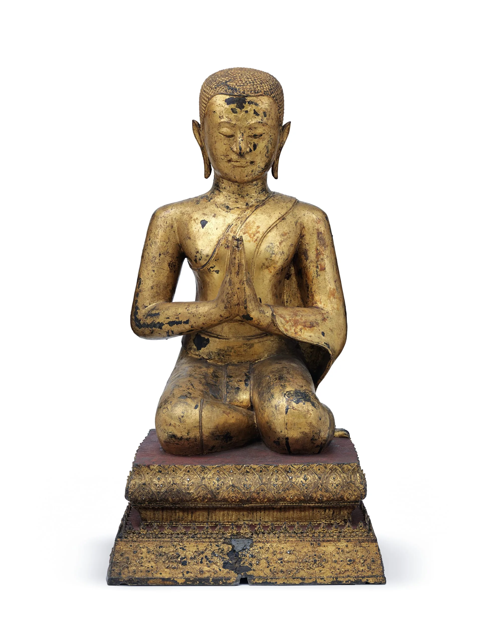 The monk has shorn hair and empty elongated earlobes, both symbolic of his renunciation of the material world when he joined the monastery. His robe is worn over his left shoulder only. He holds his hands together in the gesture of adoration (anjali mudra). He sits on a lotus base atop a multitiered pedestal adorned with floral motifs.