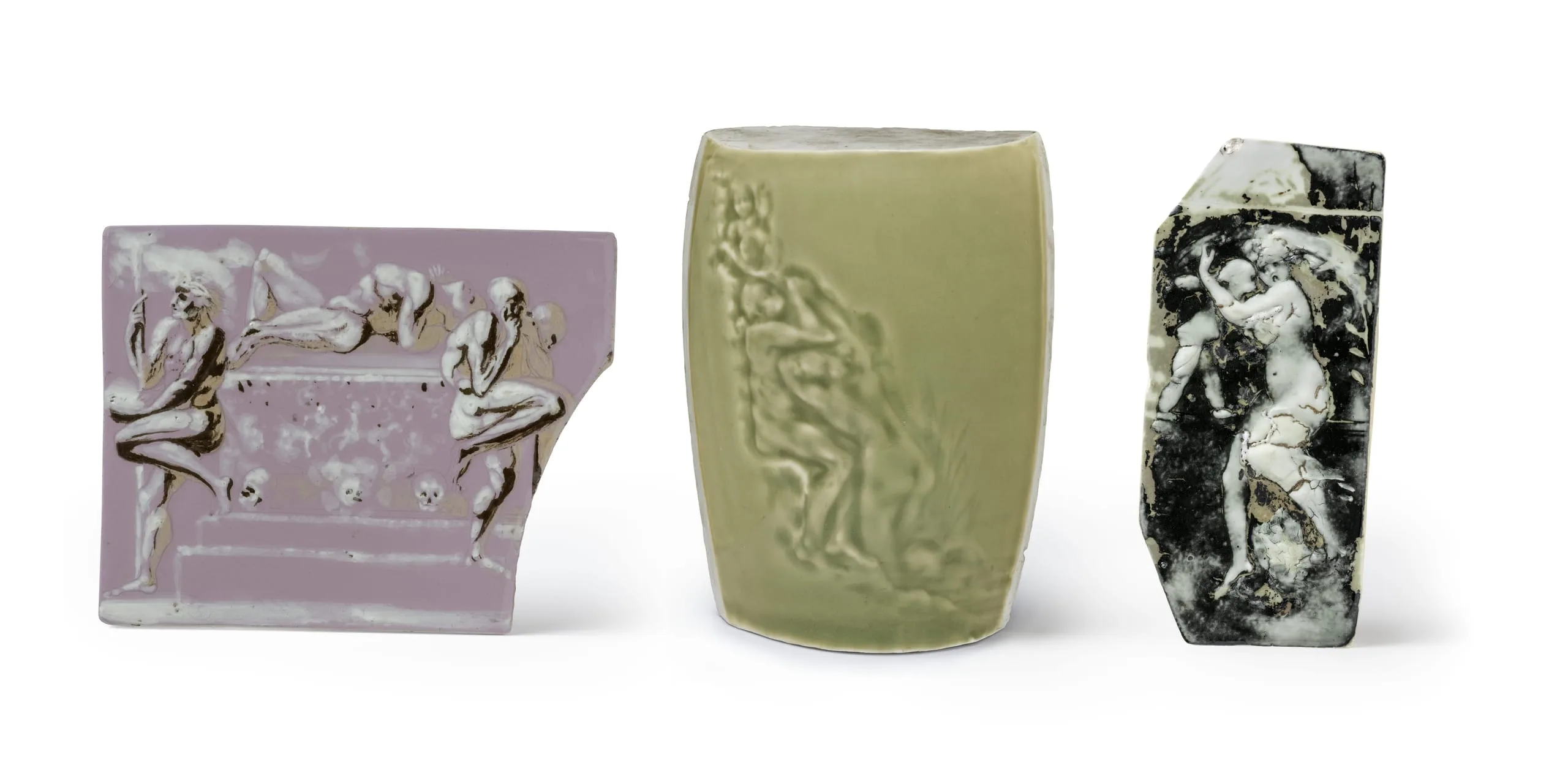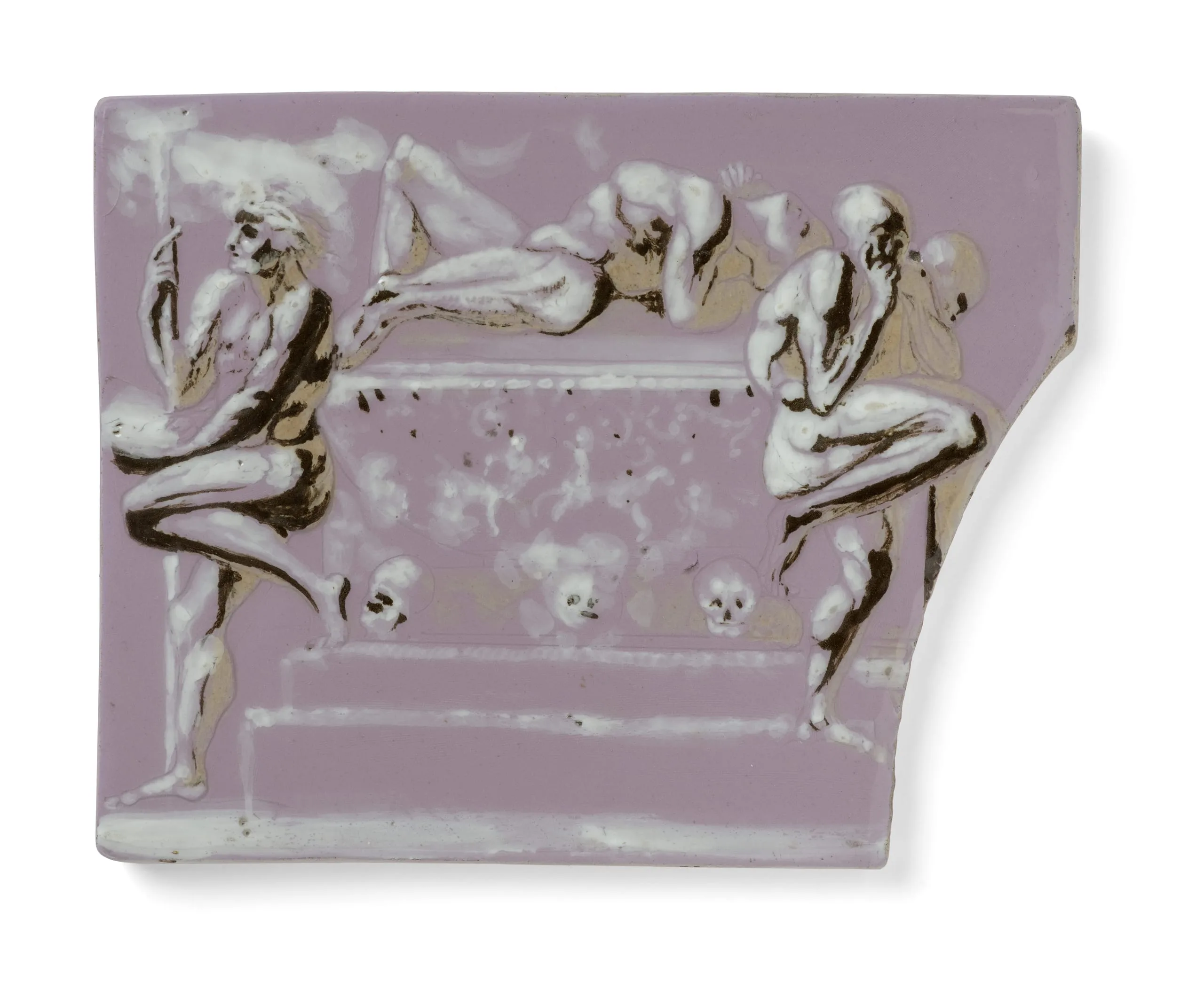 - Glazed hard-paste porcelain; chameleon (pink/gray) and black, white and tan glazes