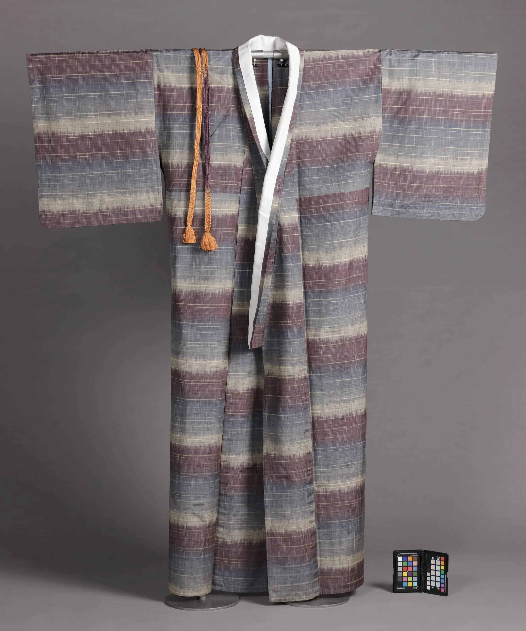 - Kimono: Silk plain weave (tsumugi) with tie-resist dyed warps (tate-gasuri); Cord: Silk and gilt-paper-wrapped-silk thread, braided (kumihimo)