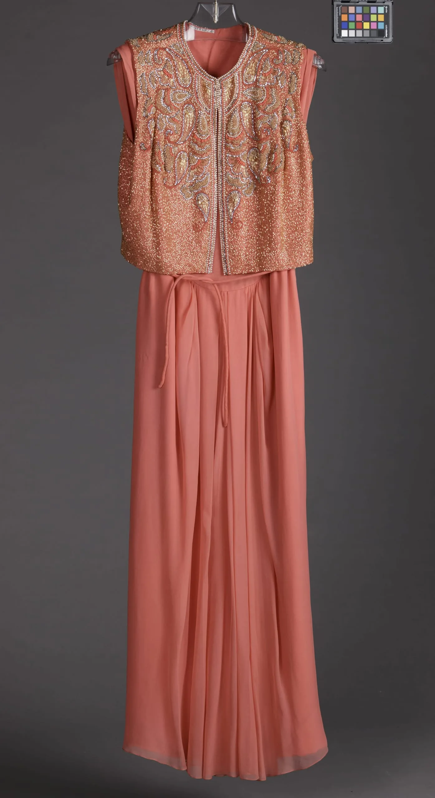 Vest: silk plain weave (crepe chiffon) with faux pearls, glass beads, crystals, and plastic beads