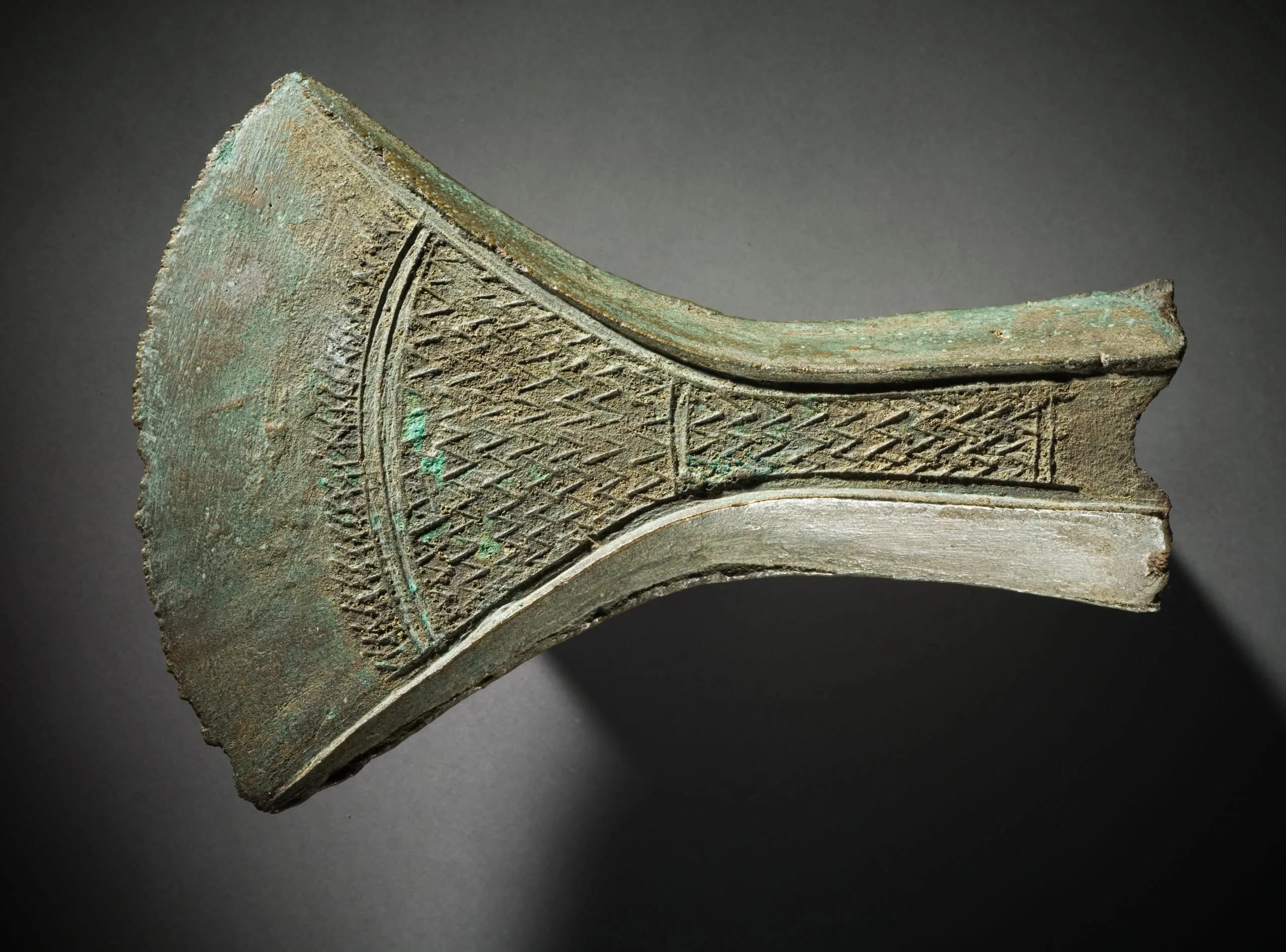 Bronze axe head with fan-shaped blade, covered in incised crosshatch and zigzag surface decoration, with dark olive and verdigris green patina