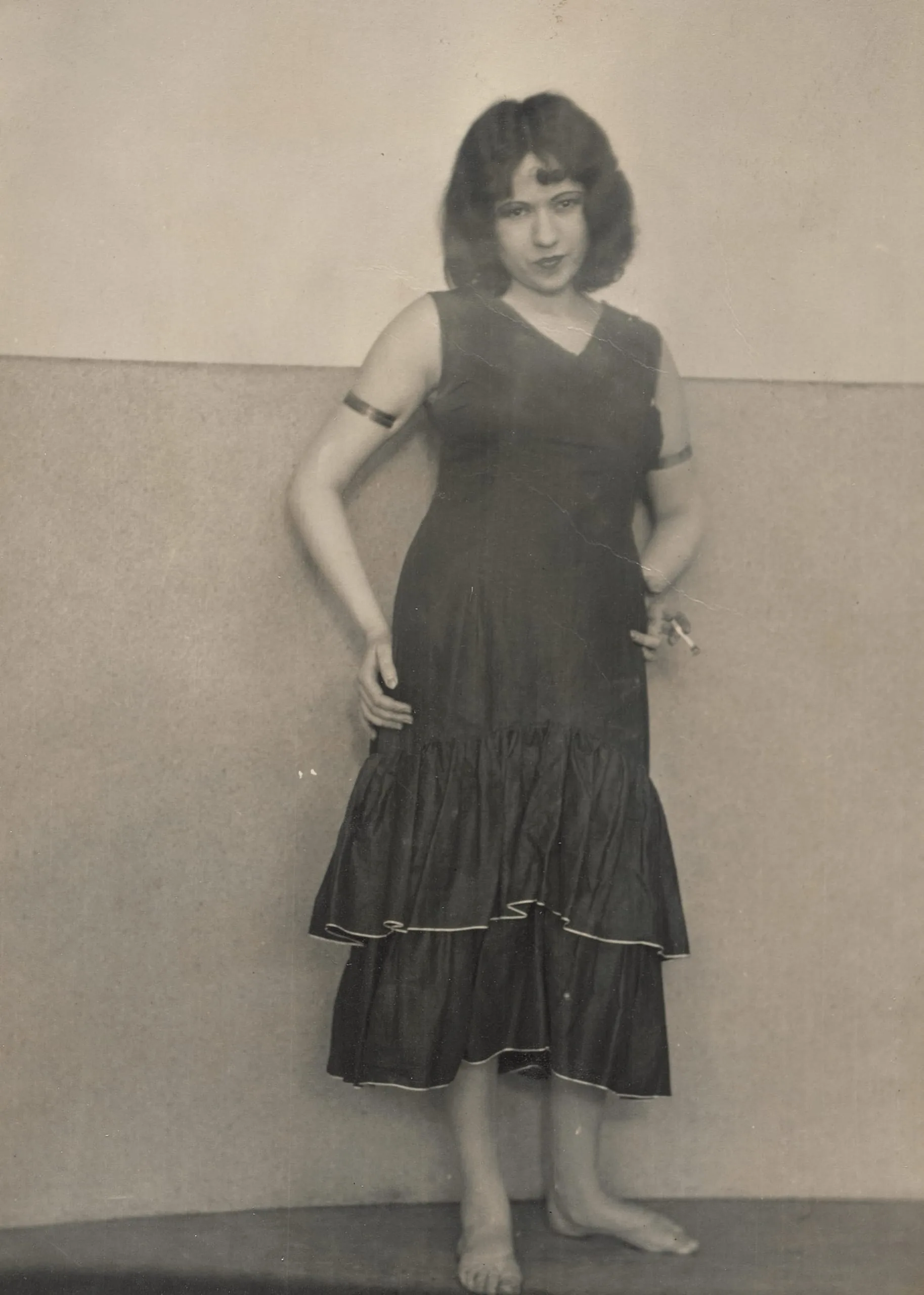 Sepia-toned full-length portrait photograph, young woman standing barefoot in a dark ruffled dress, holding a cigarette, looking directly at the camera