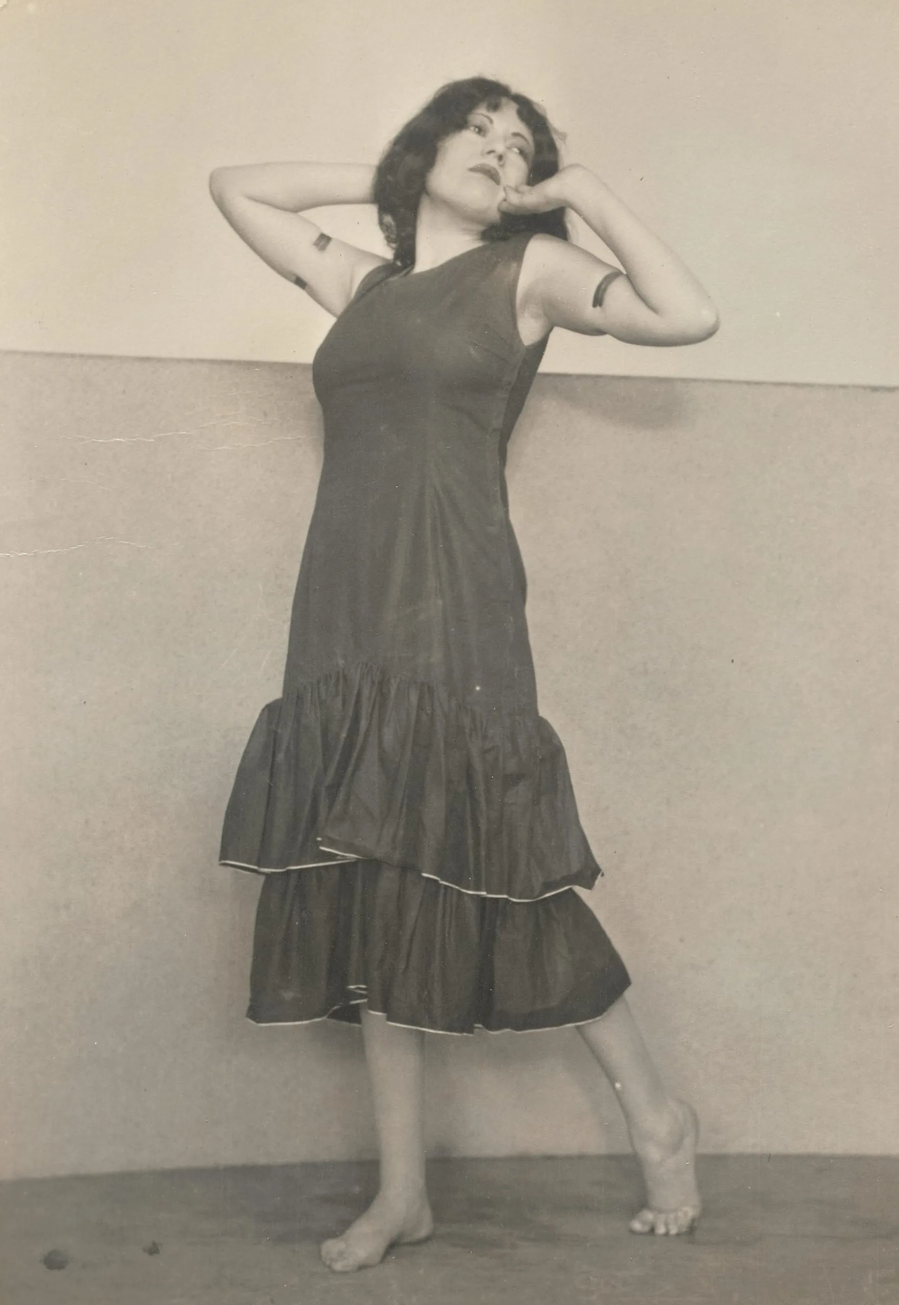 Sepia-toned full-length photograph of a barefoot woman in a sleeveless, tiered-ruffle dress, head tilted back, arms raised near her face, standing against a two-toned wall