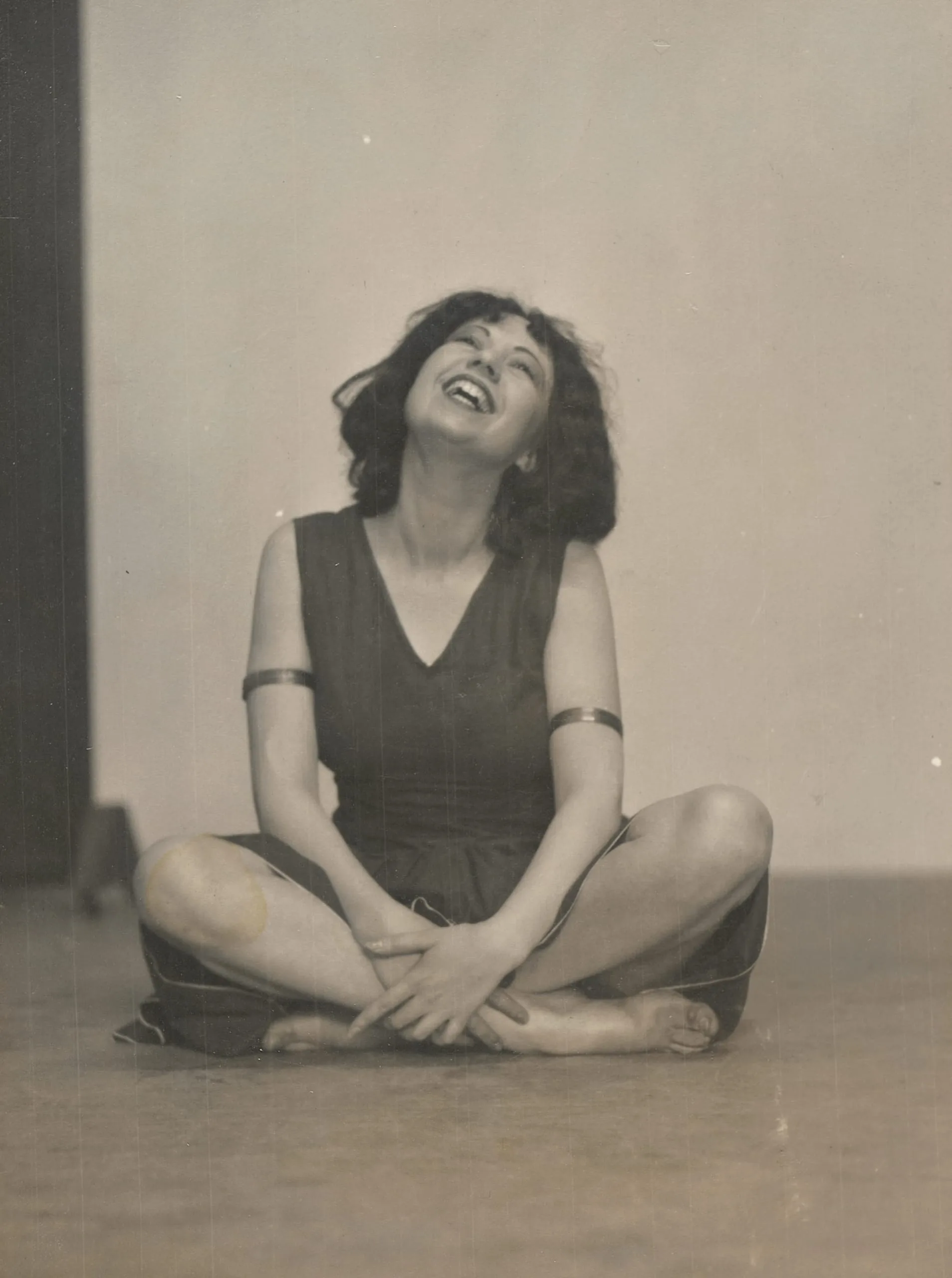 Sepia-toned photograph of a barefoot woman in a sleeveless dark tunic sitting cross-legged on a wooden floor, head thrown back, mouth open wide, hands clasped over her ankles