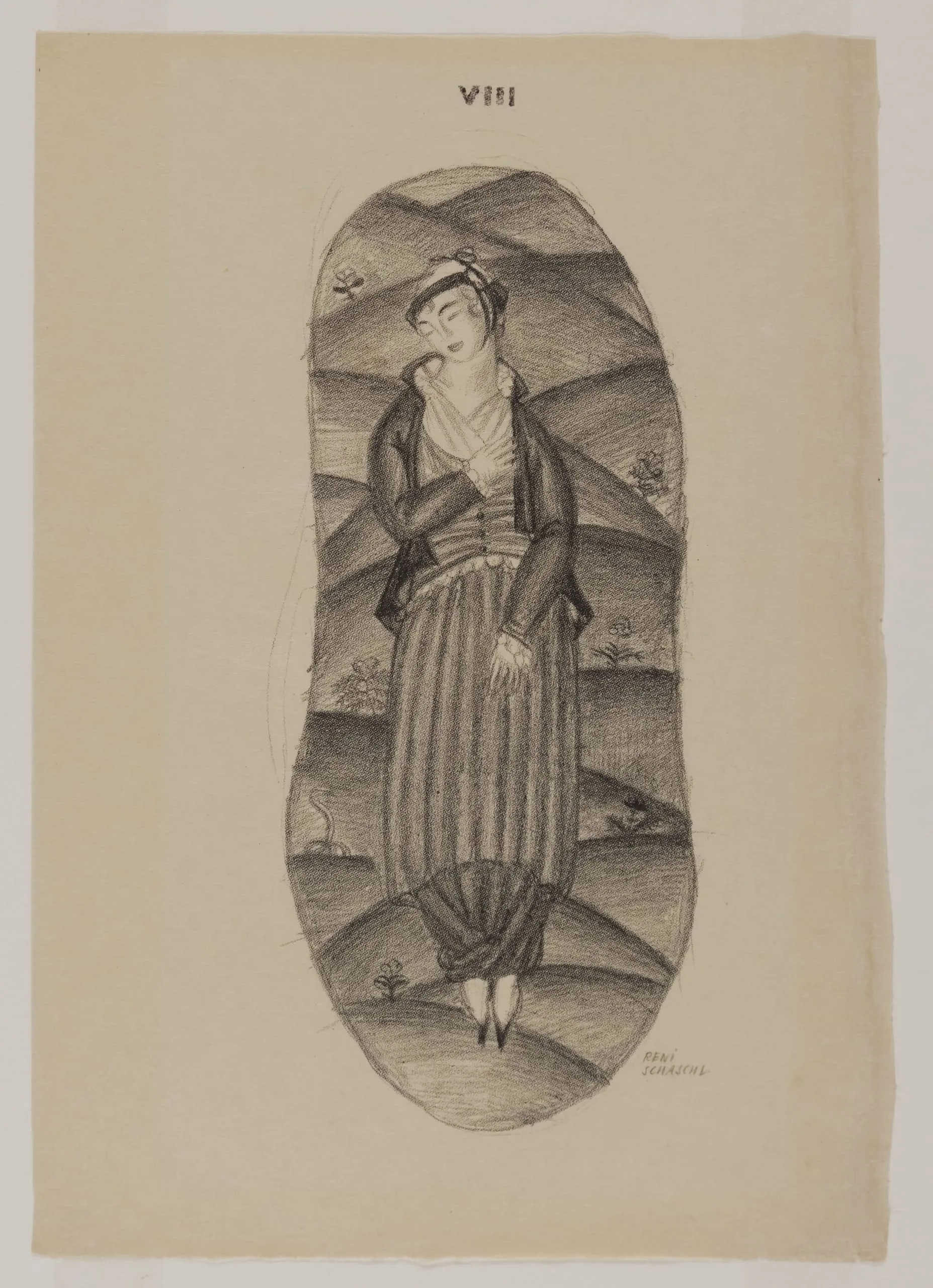 Graphite drawing on tan paper, full-length figure of a woman in striped wide-legged trousers and dark jacket, contained within a tall oval frame with a hilly landscape