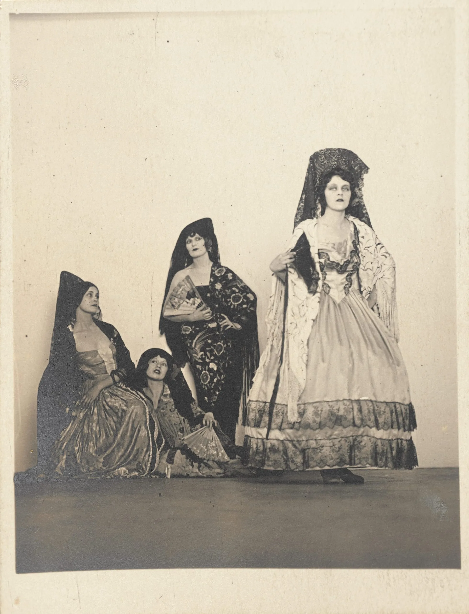 Black and white photograph of four women in Spanish-style theatrical costumes, including mantillas, fringed shawls, and full-skirted gowns, posed together against a plain background