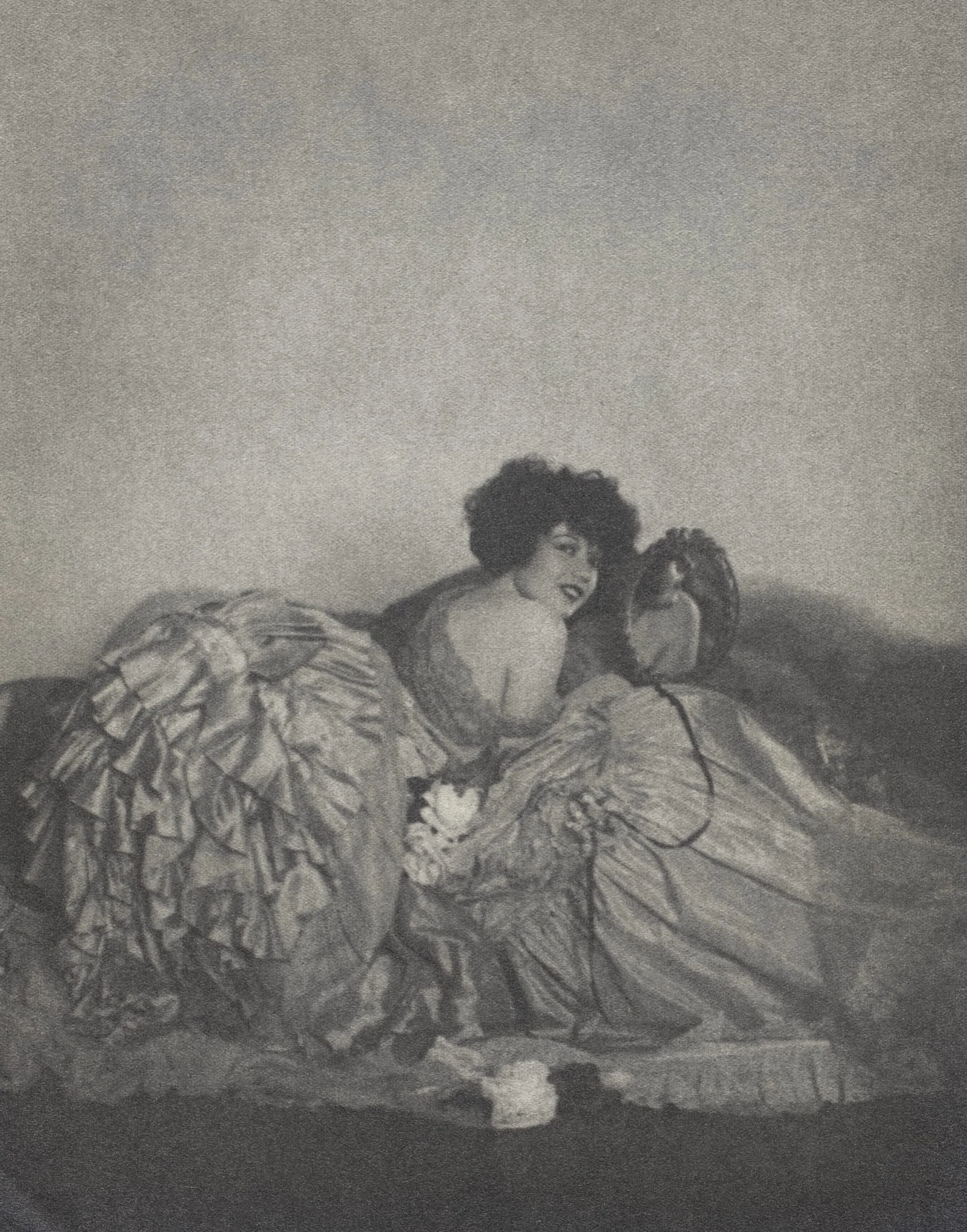 Black and white photograph of a pale-skinned woman in a voluminous off-the-shoulder ruffled gown reclining on a dark chaise, looking upward to her left