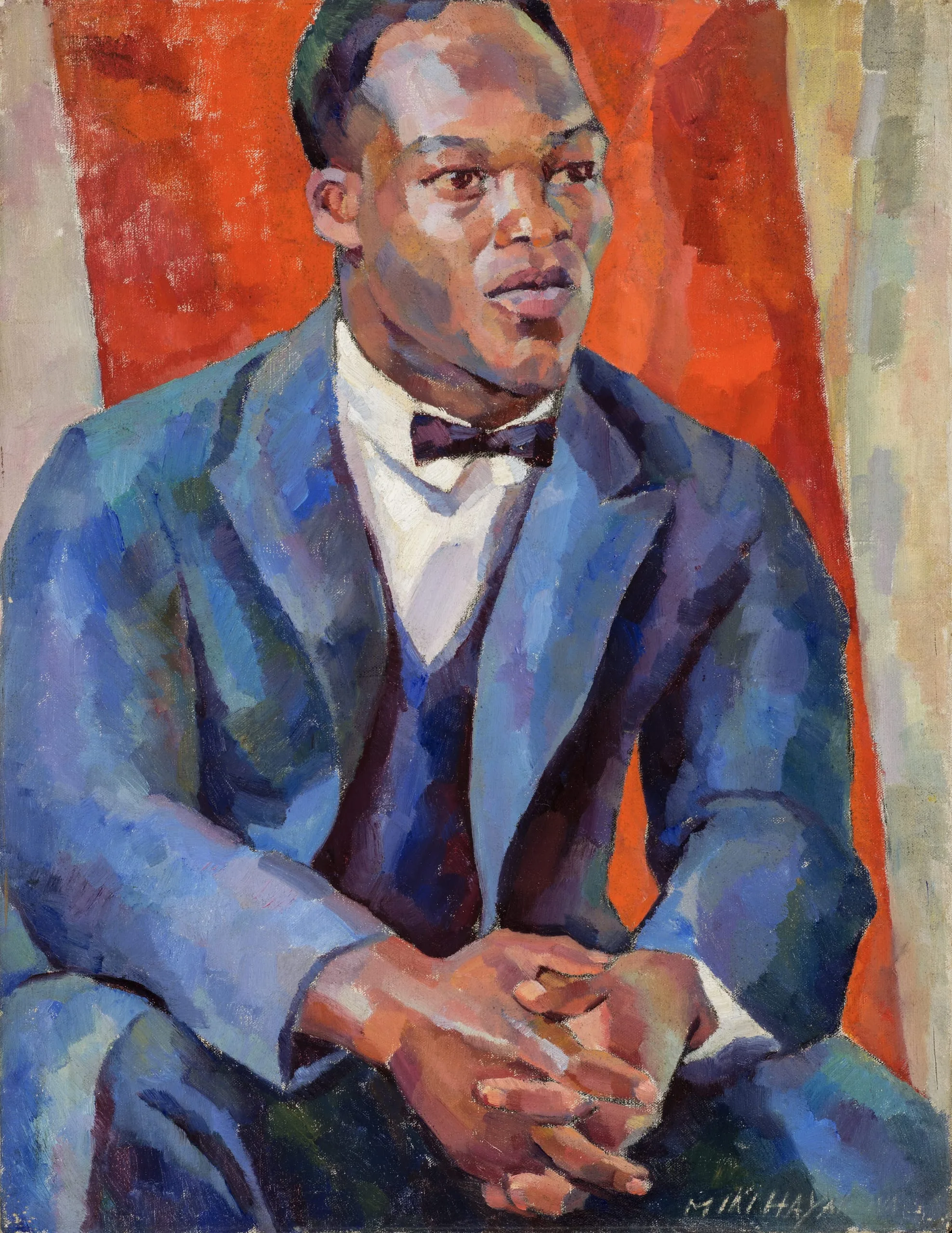 Miki Hayakawa illustrates the closeness of and fluidity between various ethnic neighborhoods in 1920s San Francisco in this portrait. Hayakawa, who had recently arrived from Japan, painted studio figures, such as this model, in the first artists’ cooperative in the country. This painting highlights her use of bright colors and simplified handling of paint strokes—a technique of early American modernism that was inspired by the work of Paul Cézanne.