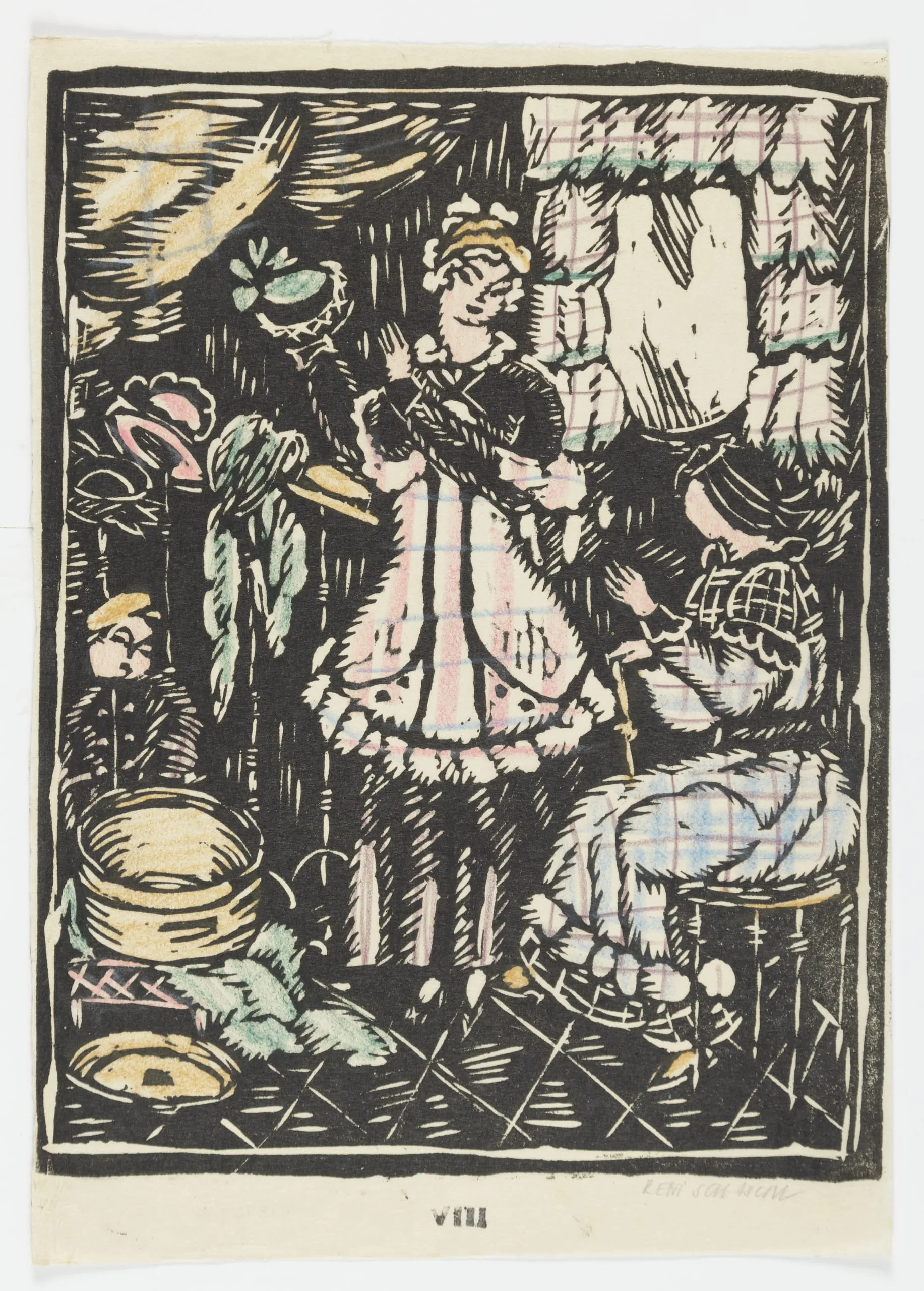 Hand-colored woodcut print with thick black lines depicting three figures in a crowded interior, with baskets, drapery, and floral forms in pink, green, and yellow