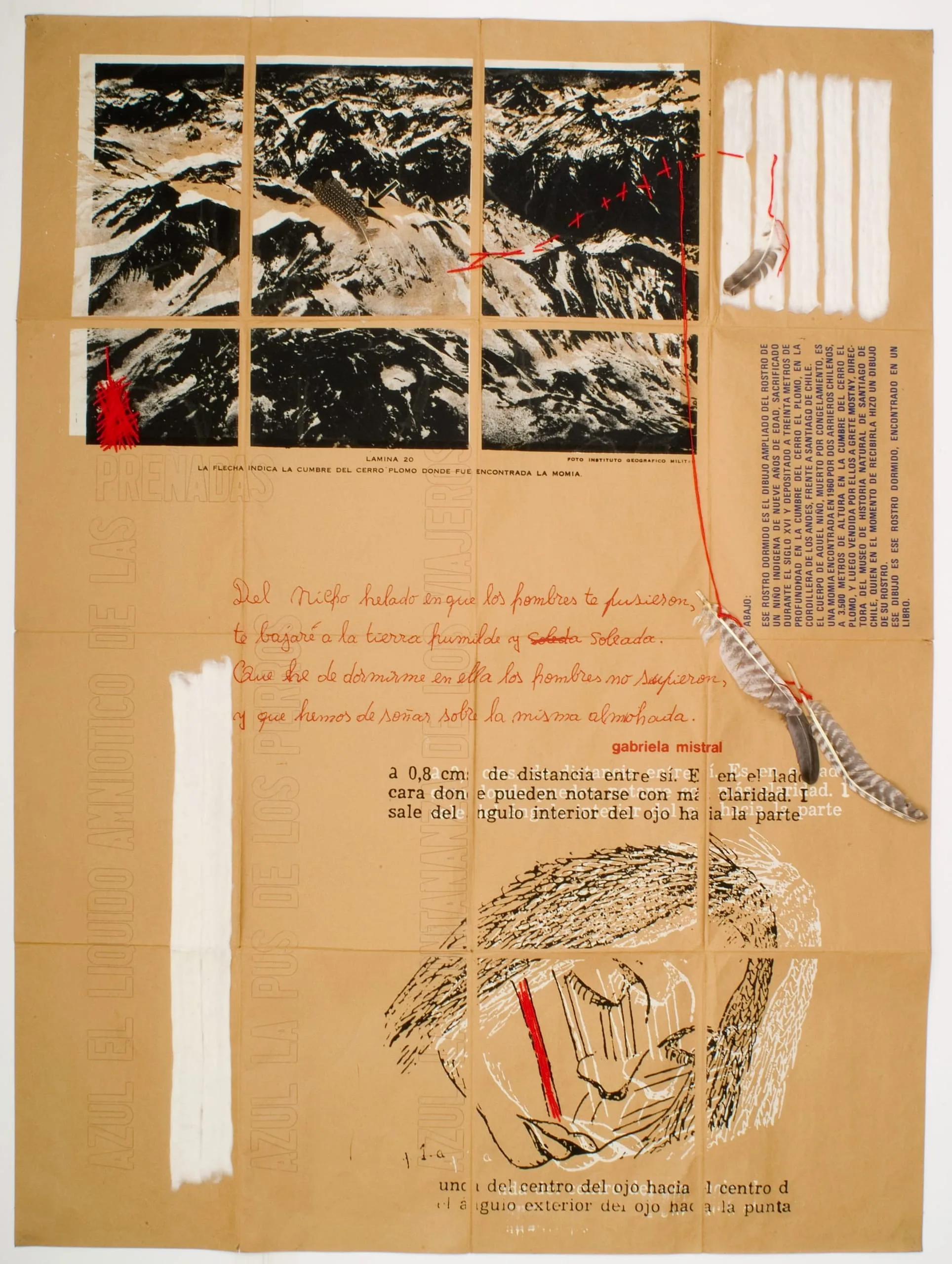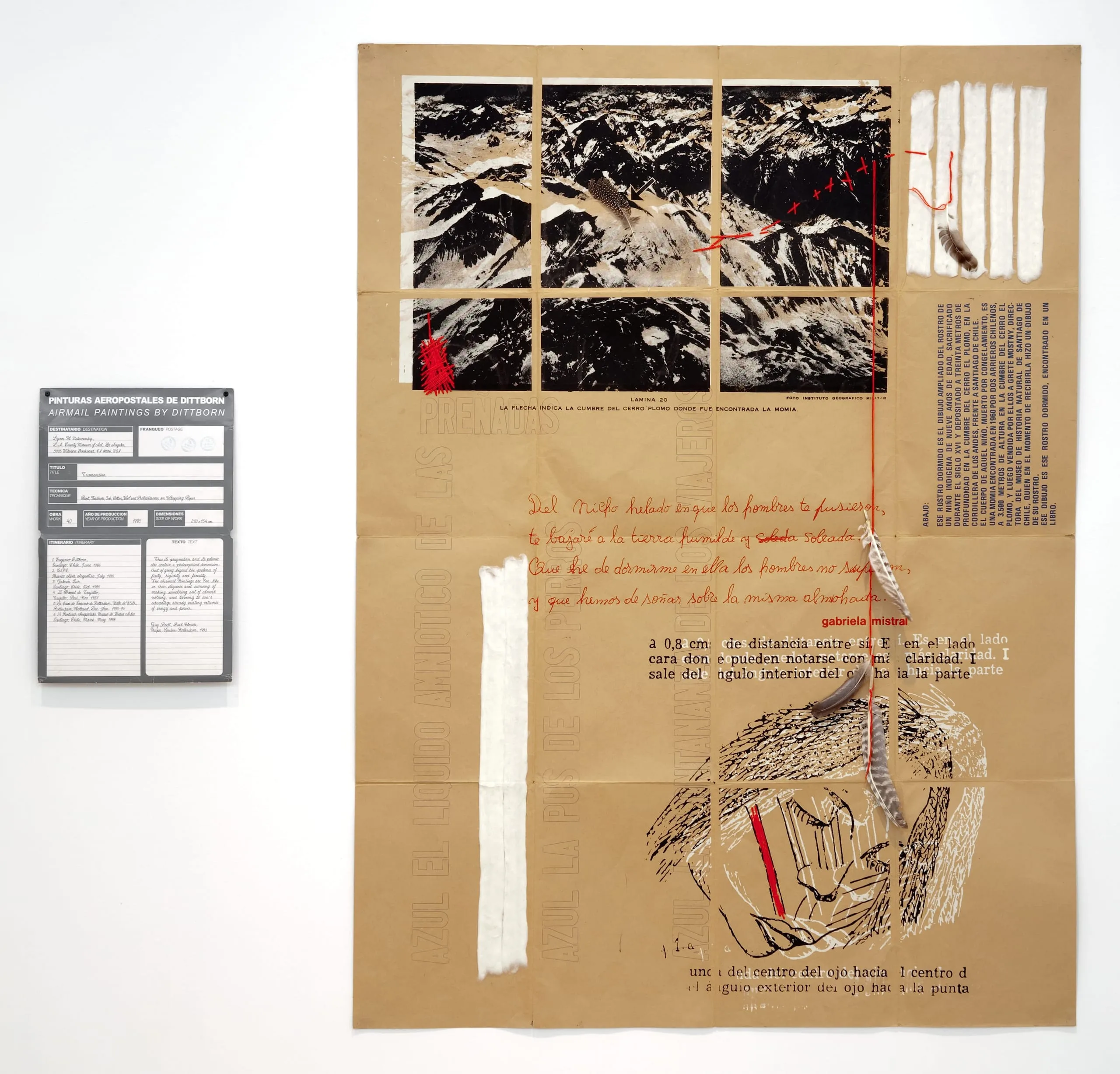 Much of Eugenio Dittborn's practice is defined by his experience of living under the military dictatorship of Augusto Pinochet (1973–90). Originally created on brown wrapping paper, and later on fabric, his dissident Airmail Paintings are mailed to their destinations and displayed with their envelopes to record their traveling and exhibition histories. The works, which include an array of materials, address contemporary issues such as the tragedy of the desaparecidos (disappeared ones), the thousands of people that "disappeared" or were "silenced" by Pinochet's security forces. Ilona Katzew, 2008