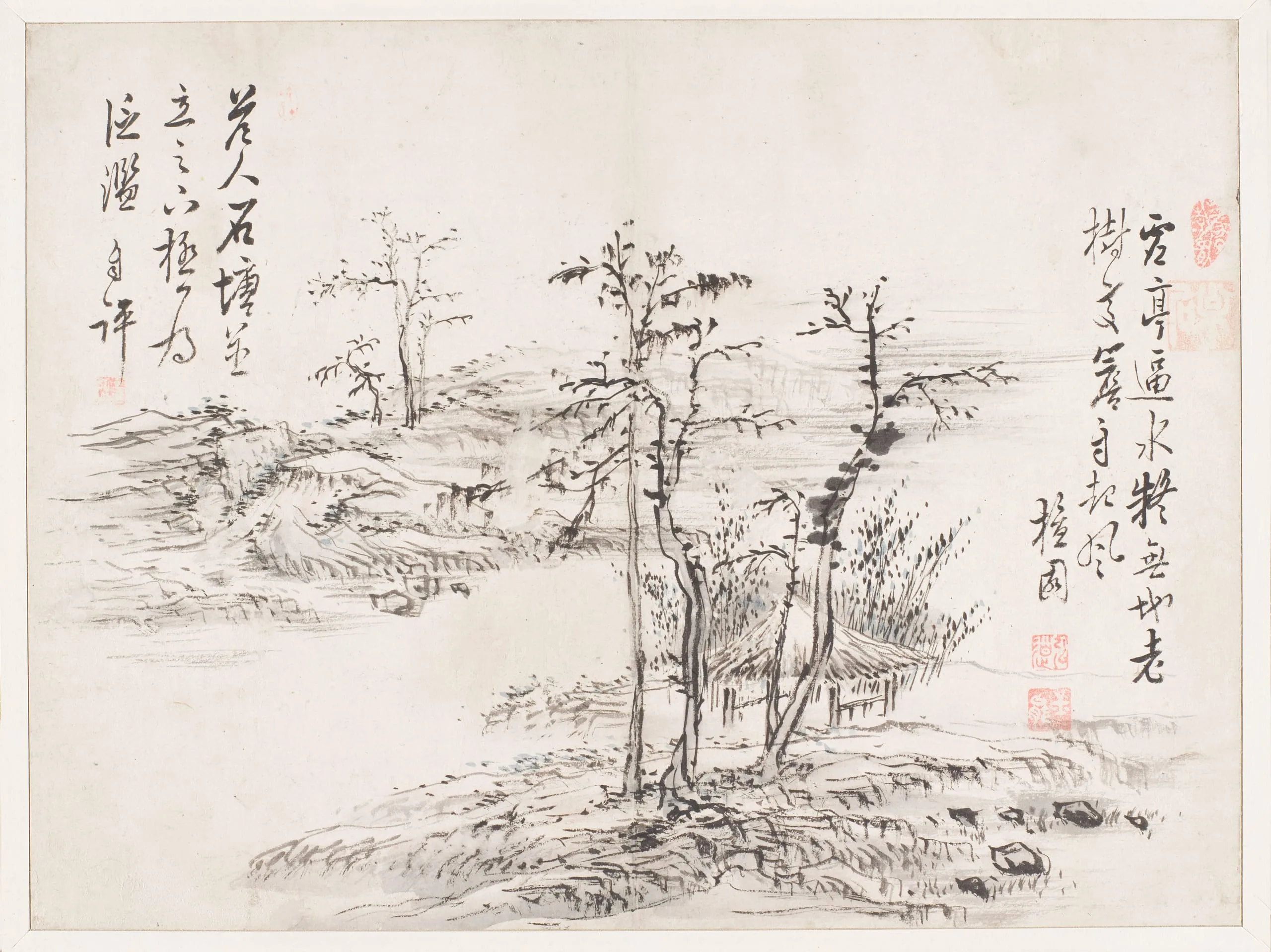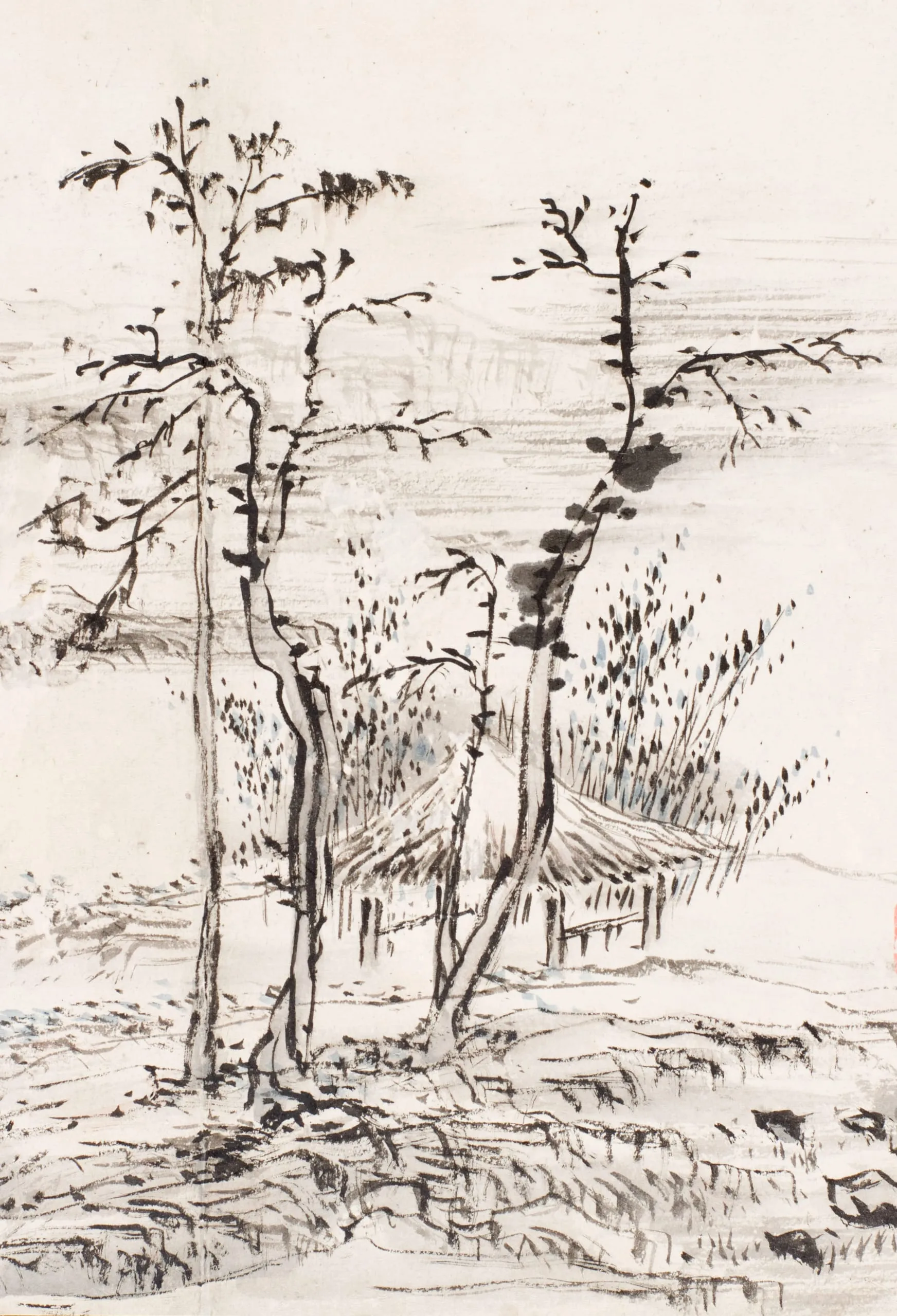 In the genre of landscape painting, Kim has received much attention for his true-view landscapes – realistic depictions of specific geographical locations – which scholars regard as an innovative style that emerged in the eighteenth century. However, Kim also created idealized landscapes, as can be seen in LACMA’s small album leaf. This painting depicting a solitary landscape demonstrates the influence that earlier Chinese landscape painting had on Kim Hongdo. The sparse trees, thatched hut, expansive water, and low, distant hills are elements associated with the paintings of Ni Zan (1301-1371), the influential Yuan dynasty scholar-artist.[3] In addition to the formulaic composition and absence of human figures, Kim used Ni Zan’s trademark painting style of dry, clean brushstrokes.