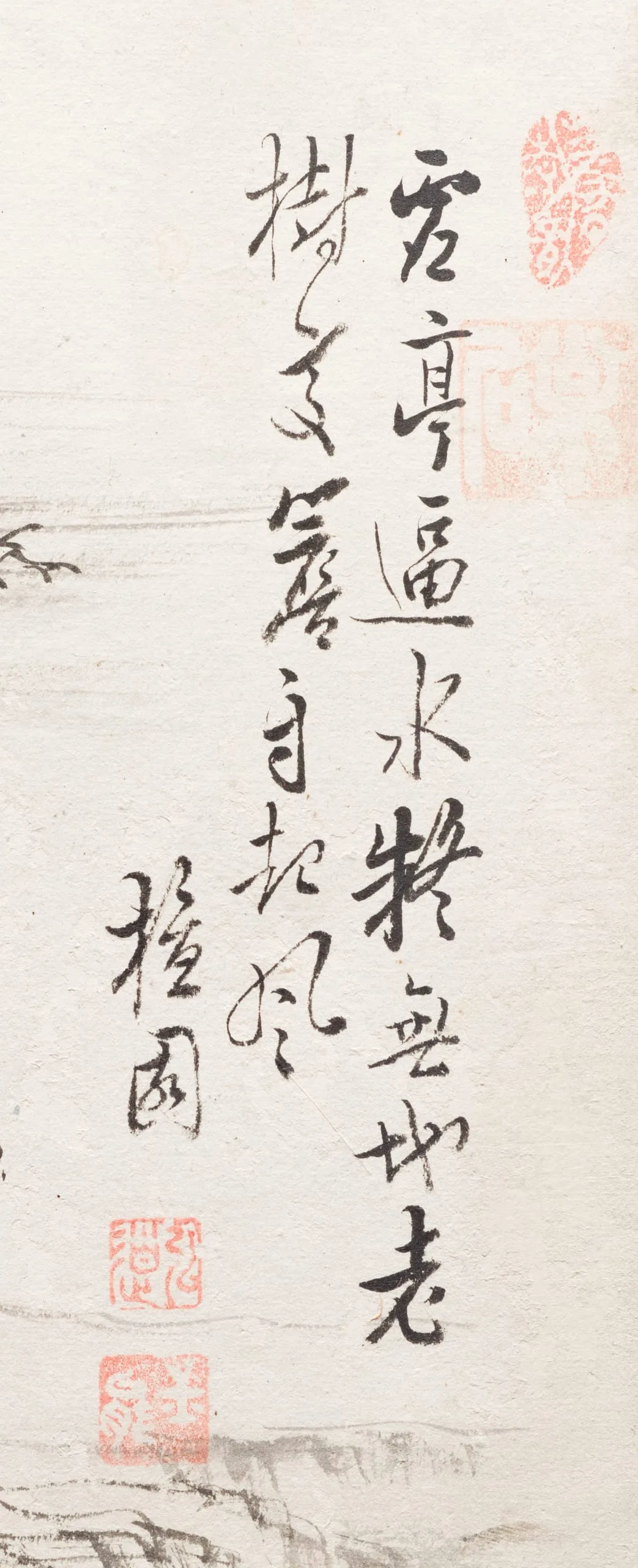 In this painting, however, Kim did not simply copy the style of earlier Chinese masters. Unlike the vast landscapes of Ni Zan, Kim created a rather intimate scene. To complement the painting, Kim inscribed two poems that reflect upon the calmness and loneliness of the landscape. The two seals below the poem on the right are the artist’s (det. 1).