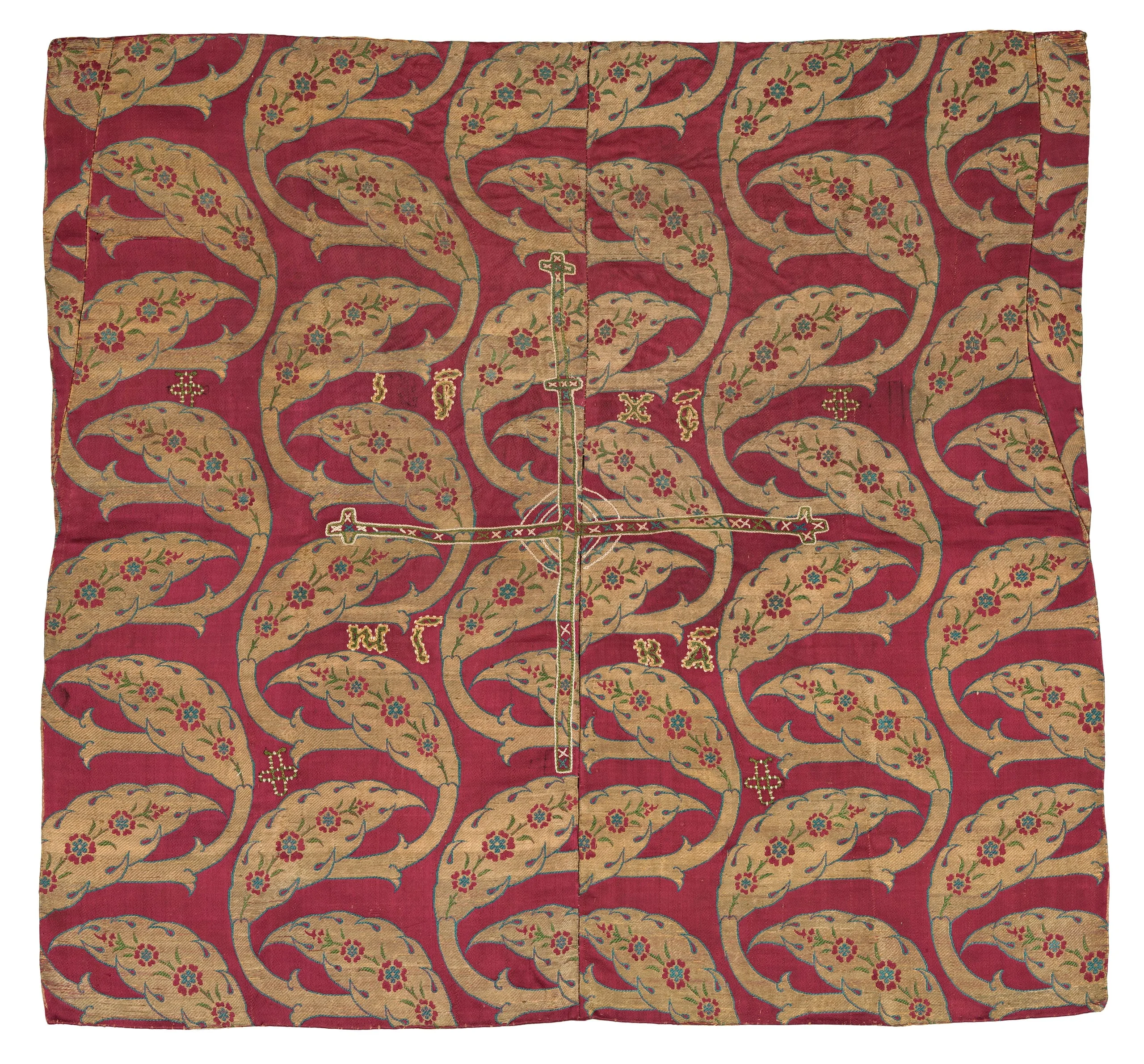 - Silk satin with silk and metallic-thread supplementary-weft patterning bound in twill (lampas or kemha) with silk embroidery