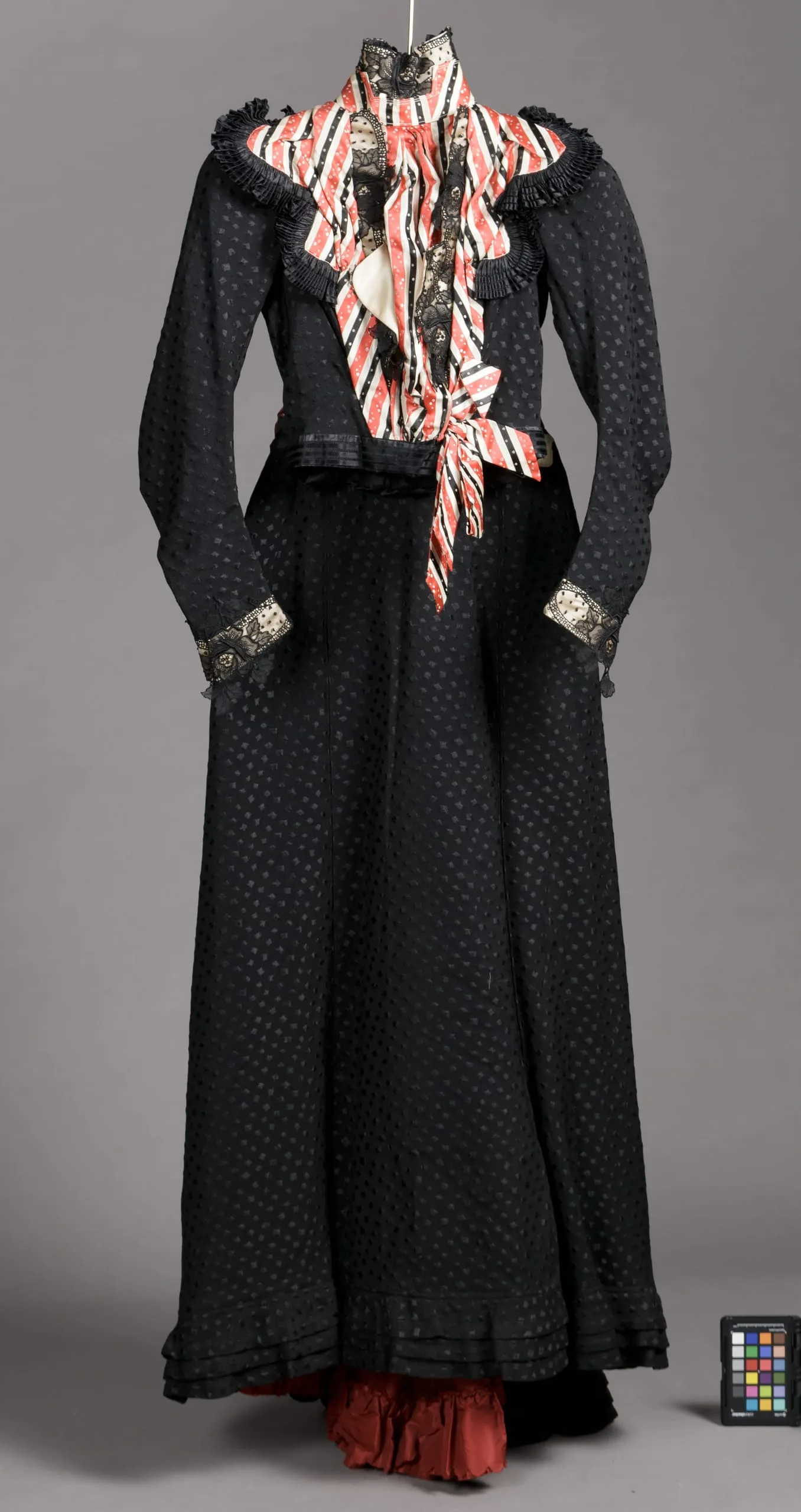 Skirt: wool and silk gauze with silk plain weave patterning (damask)
