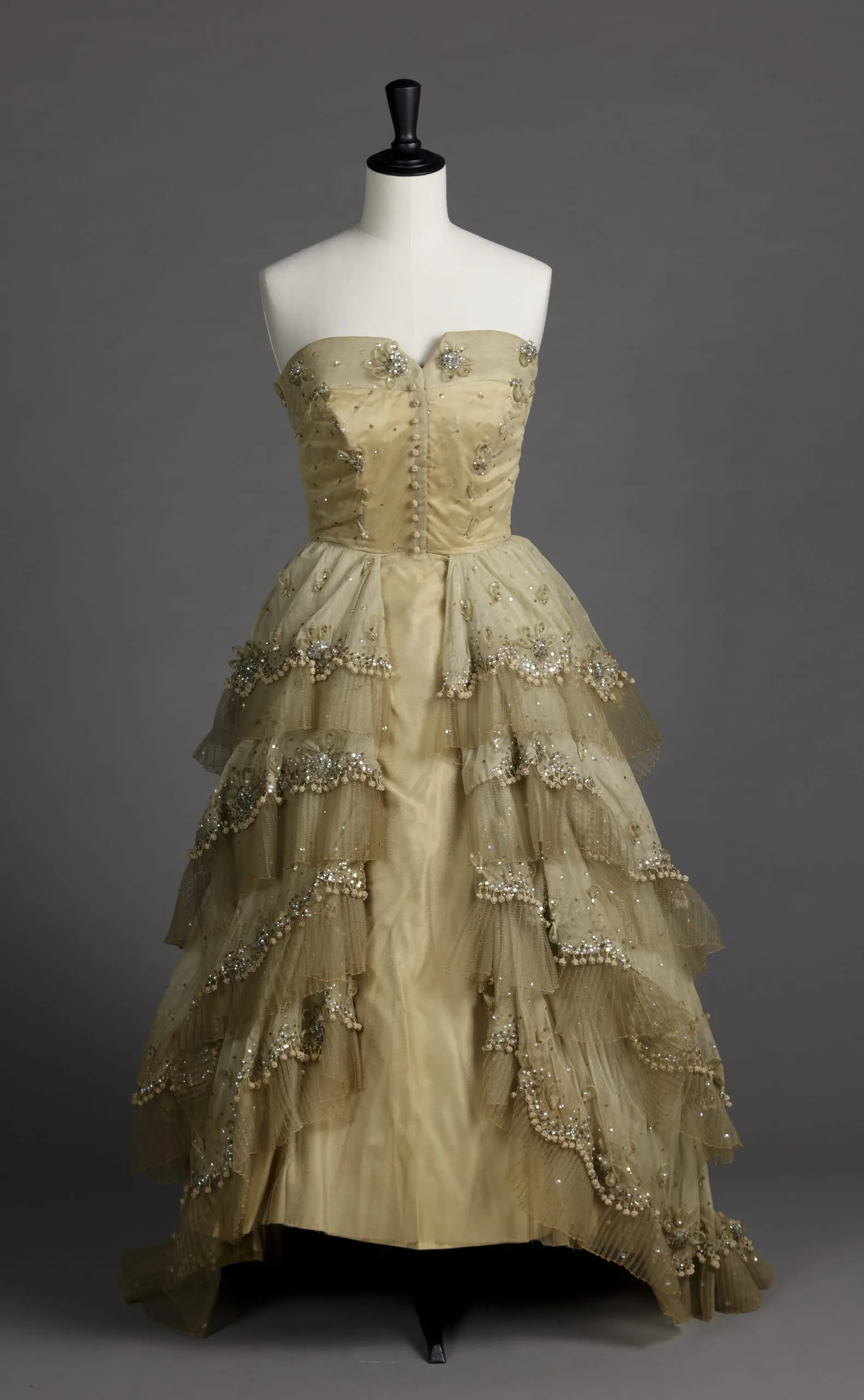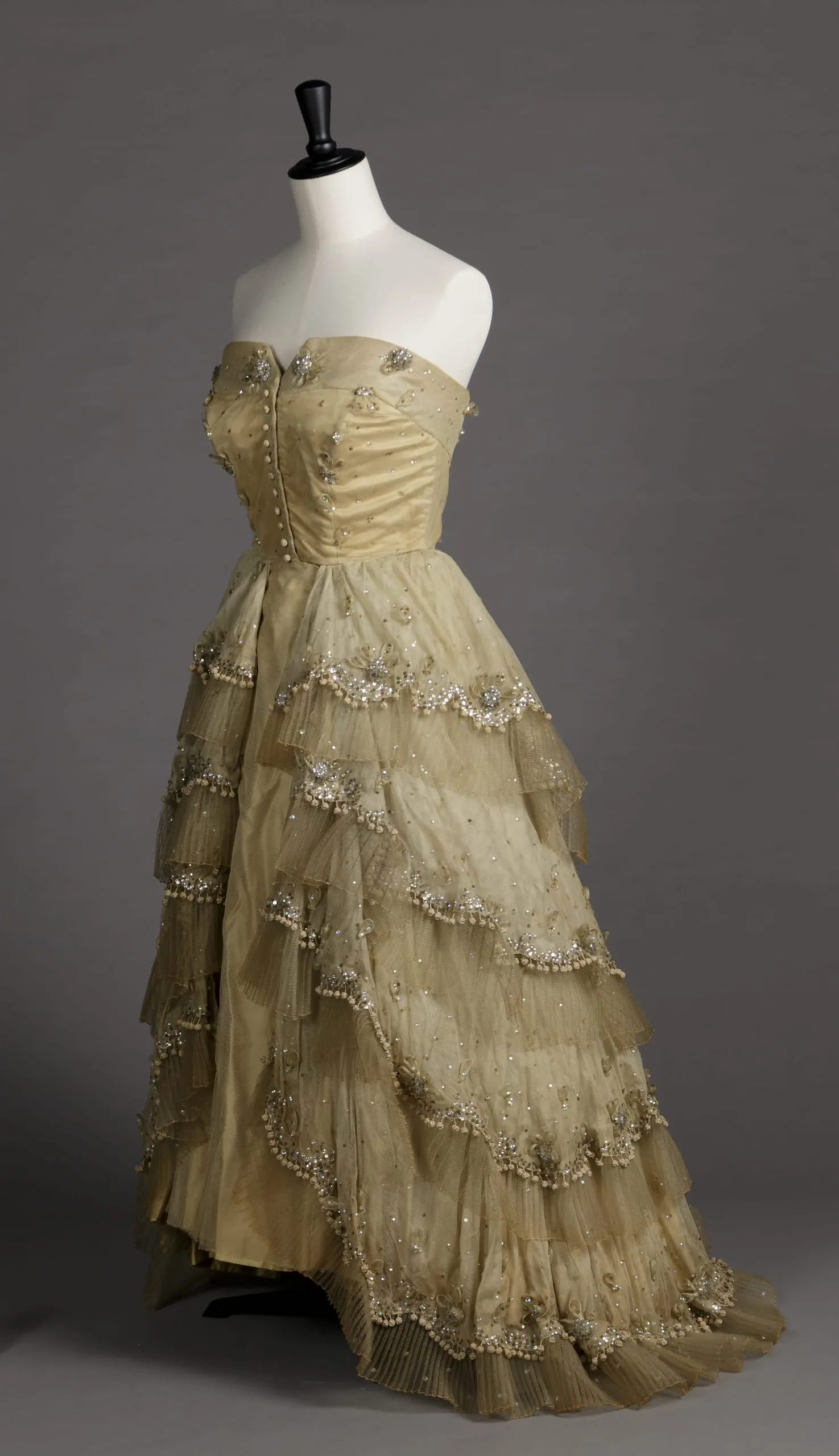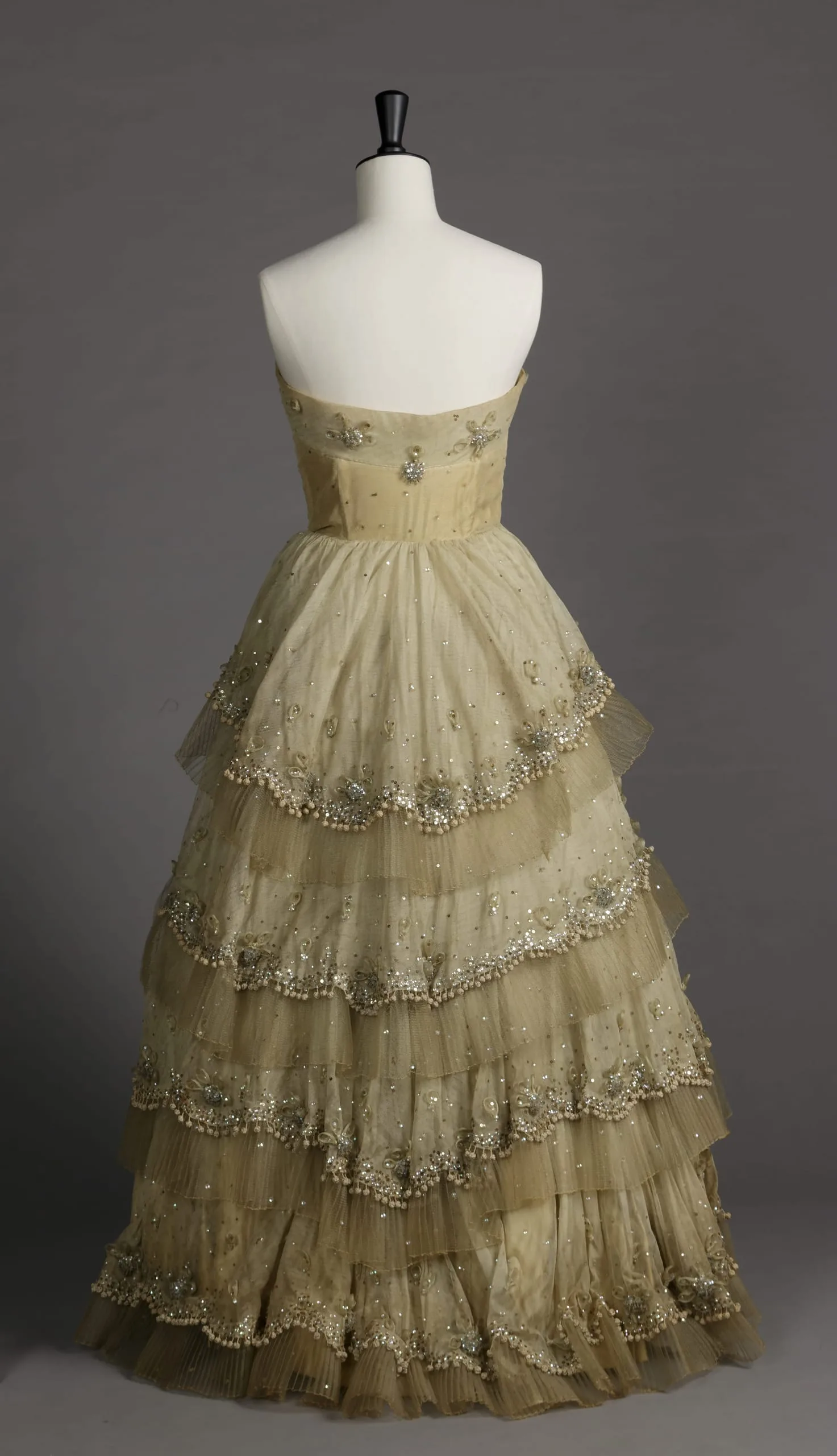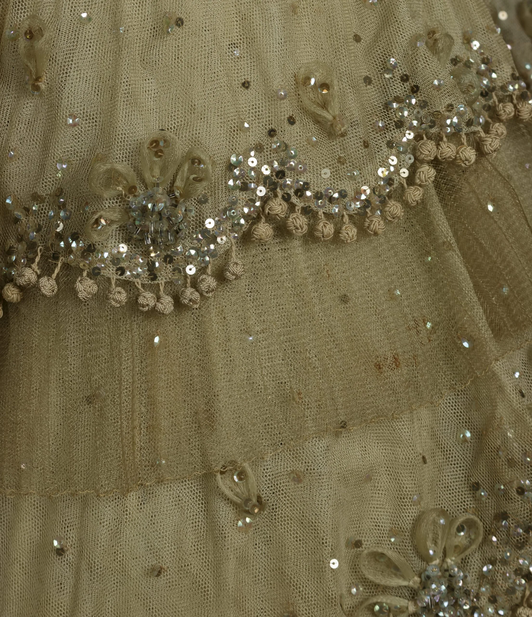 - Silk net with horsehair braid, silk satin, silk knotted passementerie, plastic sequins, metal sequins, and glass beads