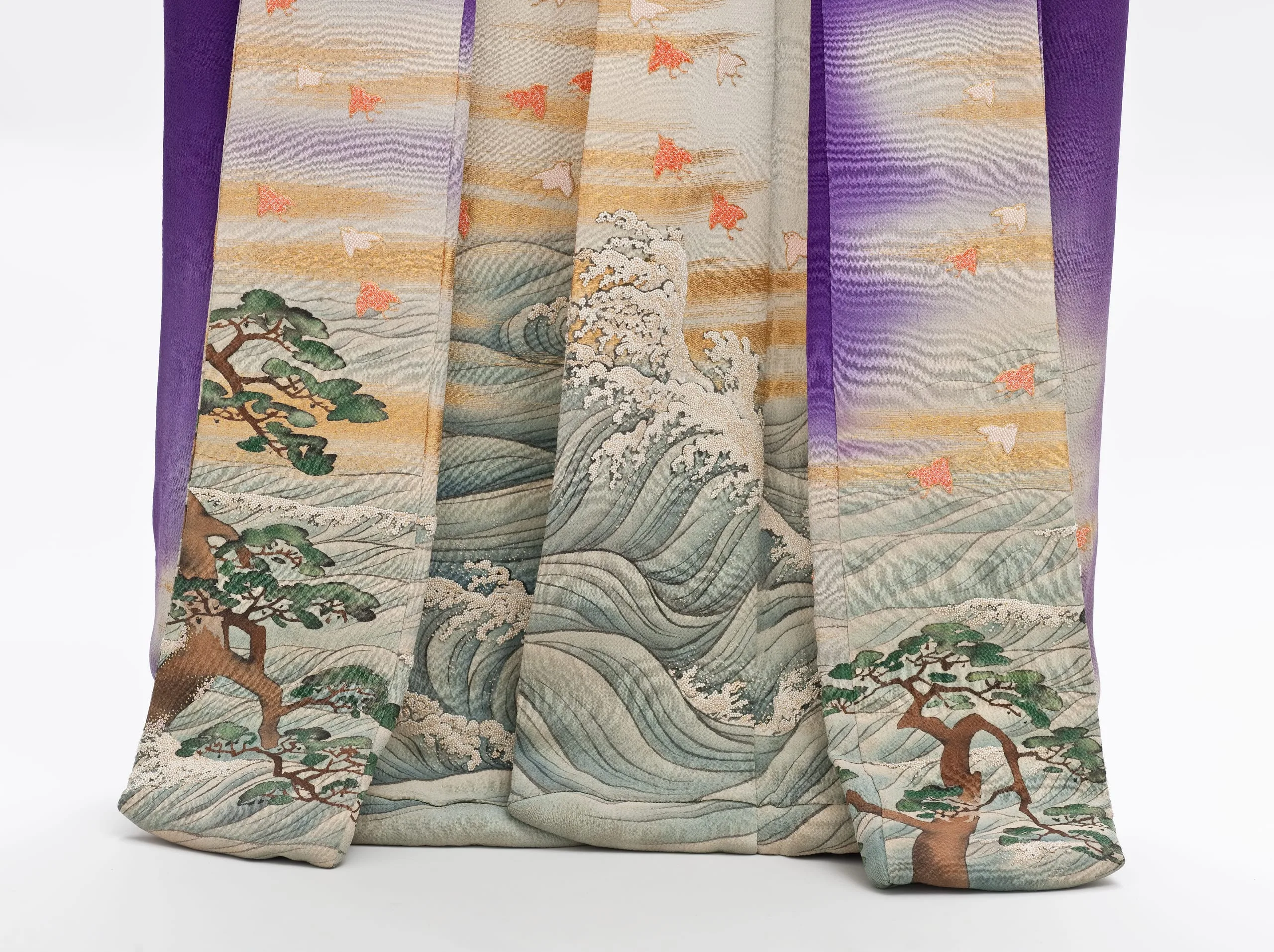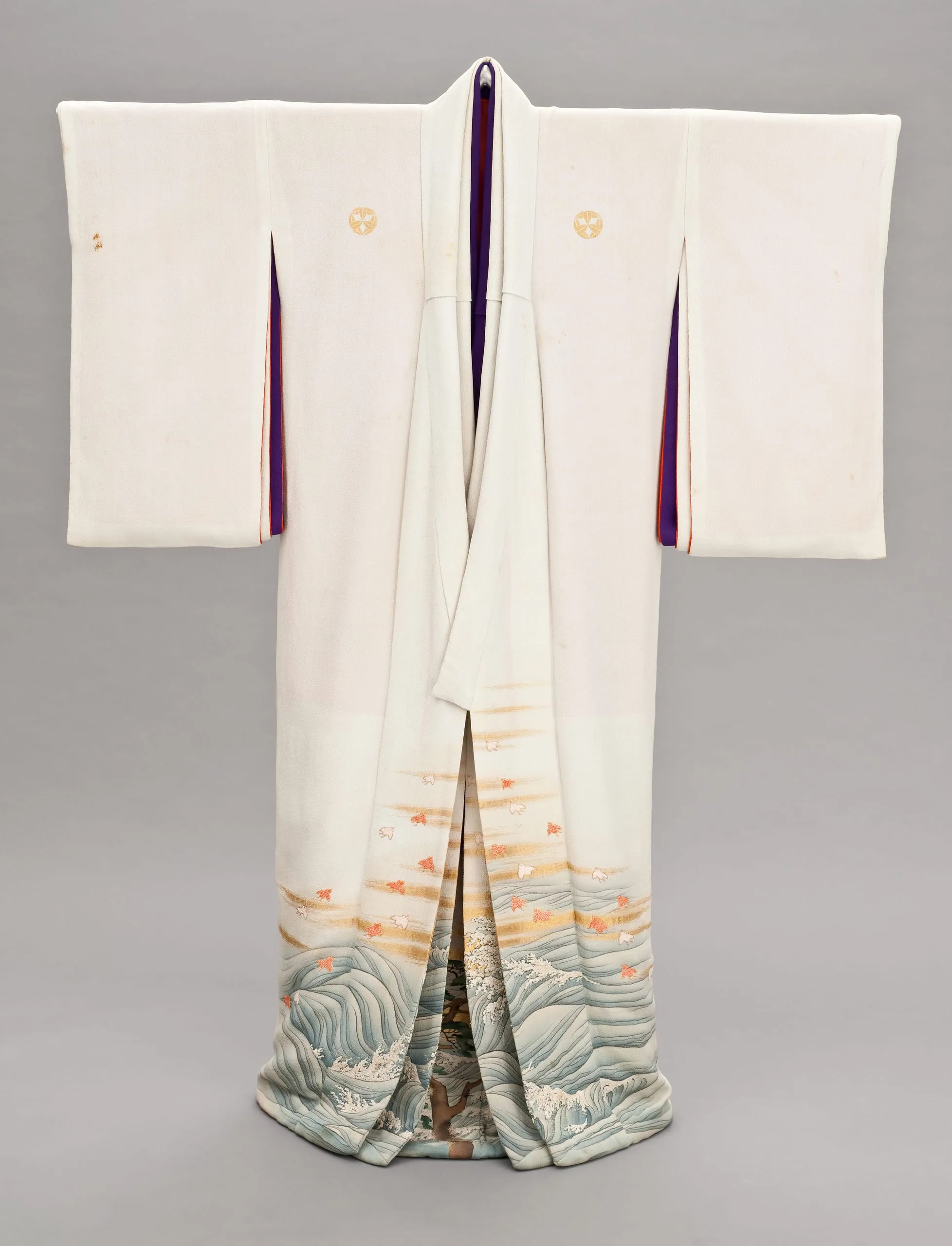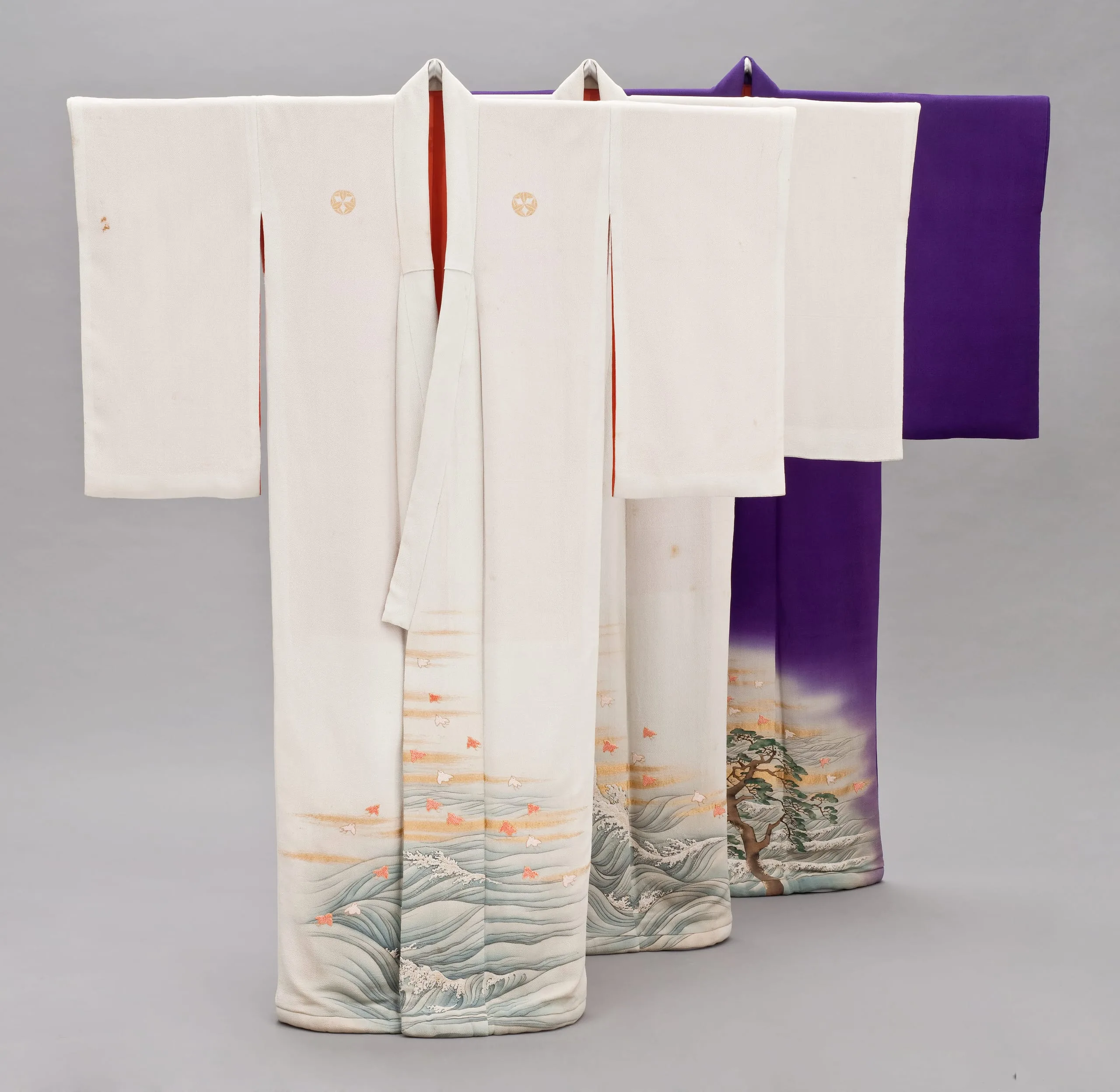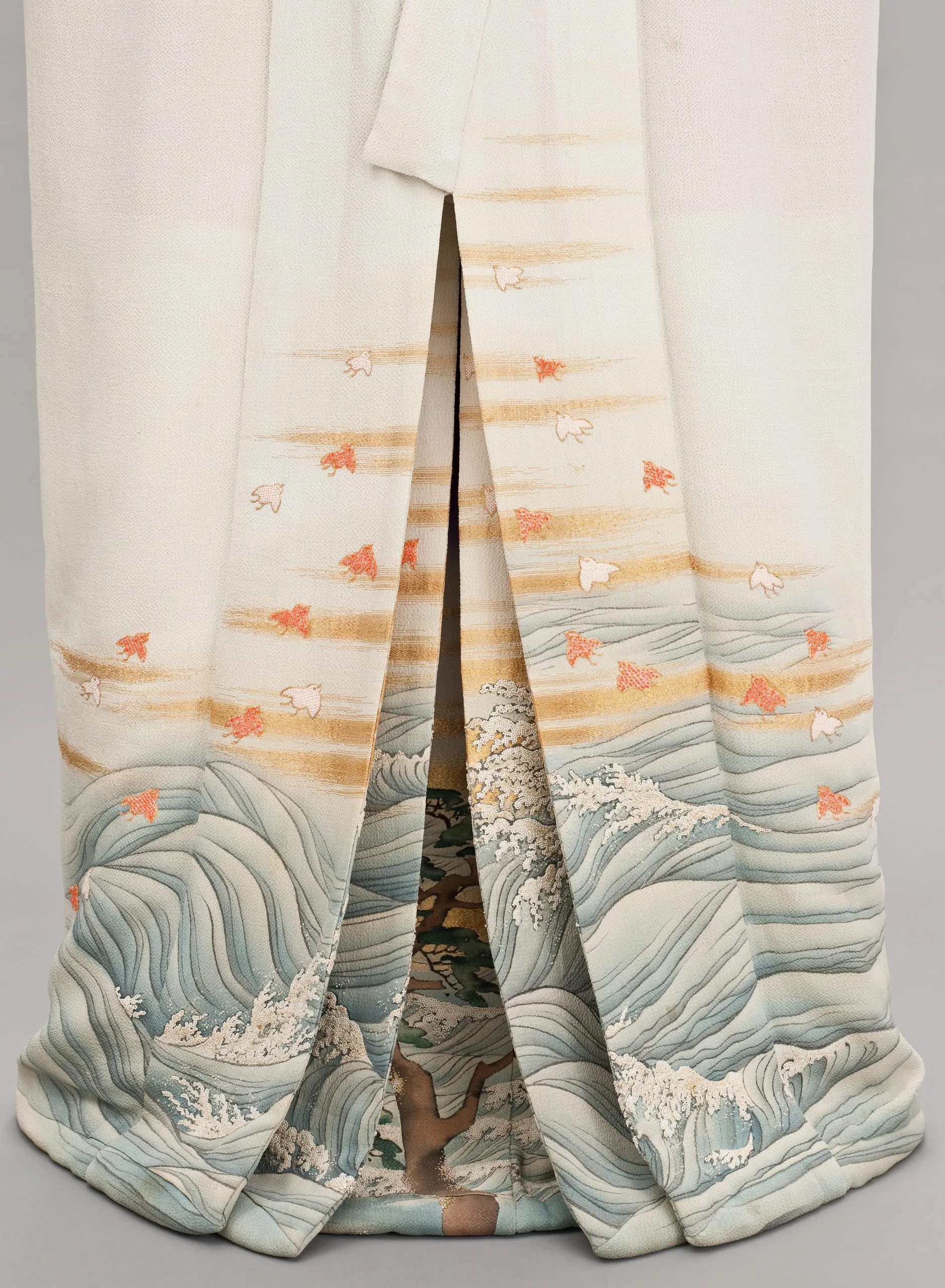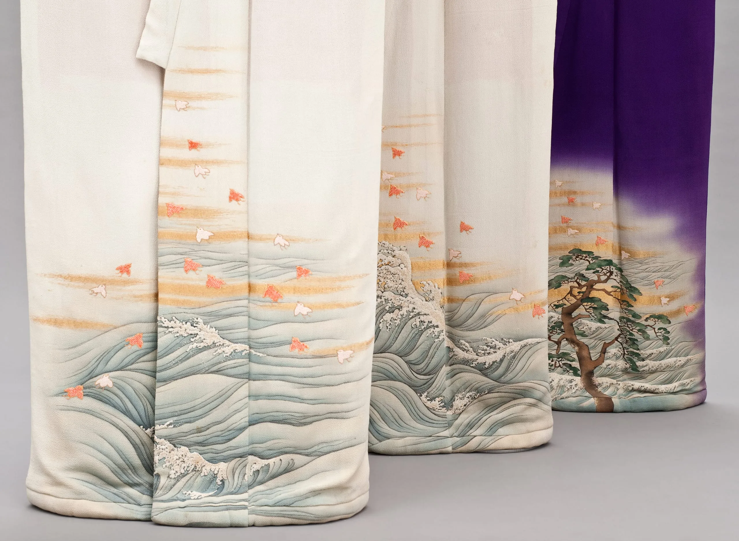 - Innermost Kimono: Silk plain weave (crepe; chirimen) with gilt-paper-wrapped-silk thread supplementary weft patterning, handpainted with ink, pigments and dyes, paste-resist dyed (yuzen), and brush-dyed (hikizome), with silk and gilt-paper-wrapped-silk thread embroidery, seed pearls, and coral beads; Outermost Kimono: Silk plain weave (crepe; chirimen) with gilt-paper-wrapped-silk thread supplementary weft patterning, handpainted with ink and dyes, with silk and gilt-paper-wrapped-silk thread embroidery, seed pearls, and coral beads; Middle Kimono: Silk plain weave (crepe; chirimen) with gilt-paper-wrapped-silk thread supplementary weft patterning, handpainted with ink and dyes, with silk and gilt-paper-wrapped-silk thread embroidery, seed pearls, and coral beads