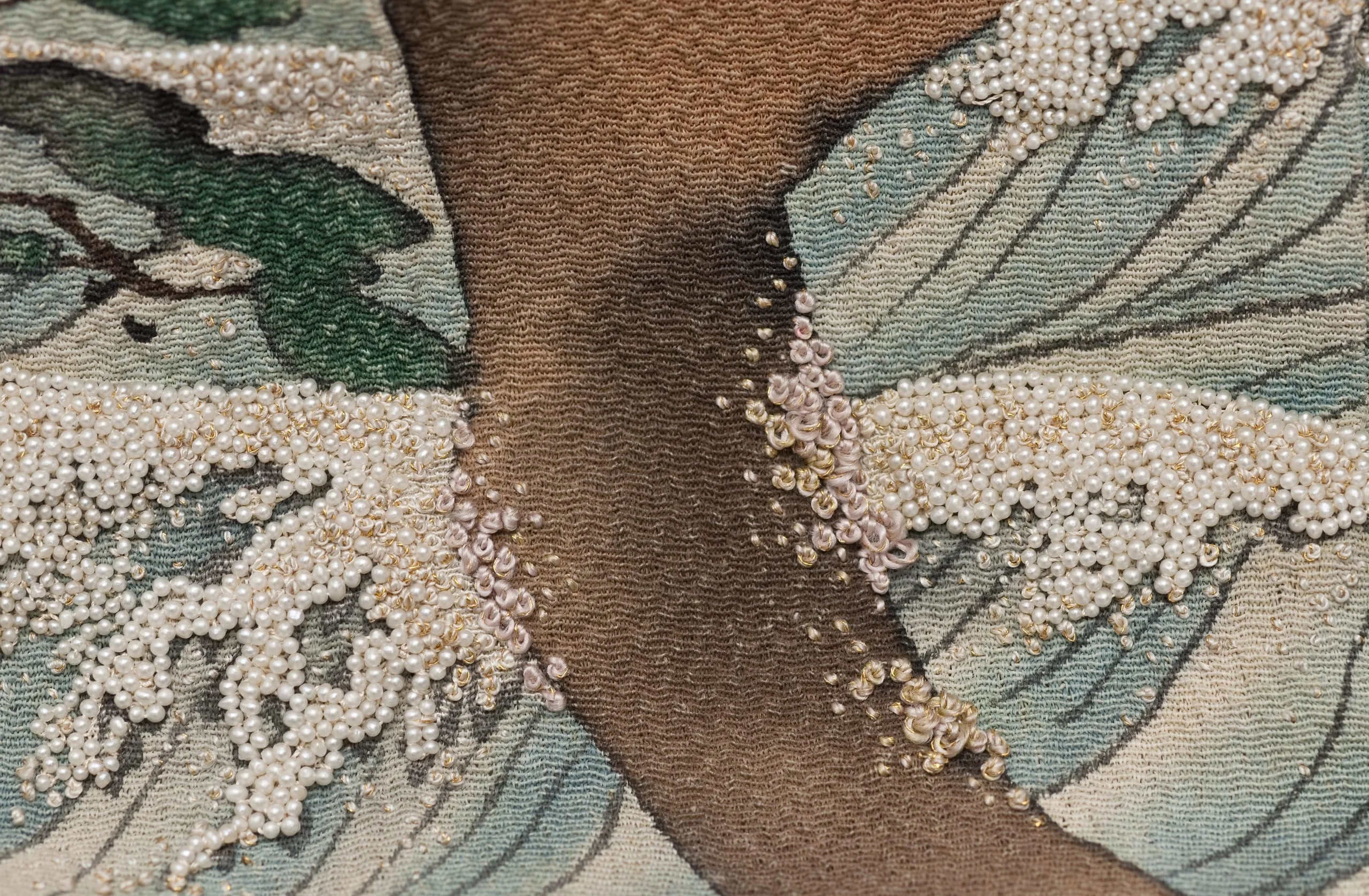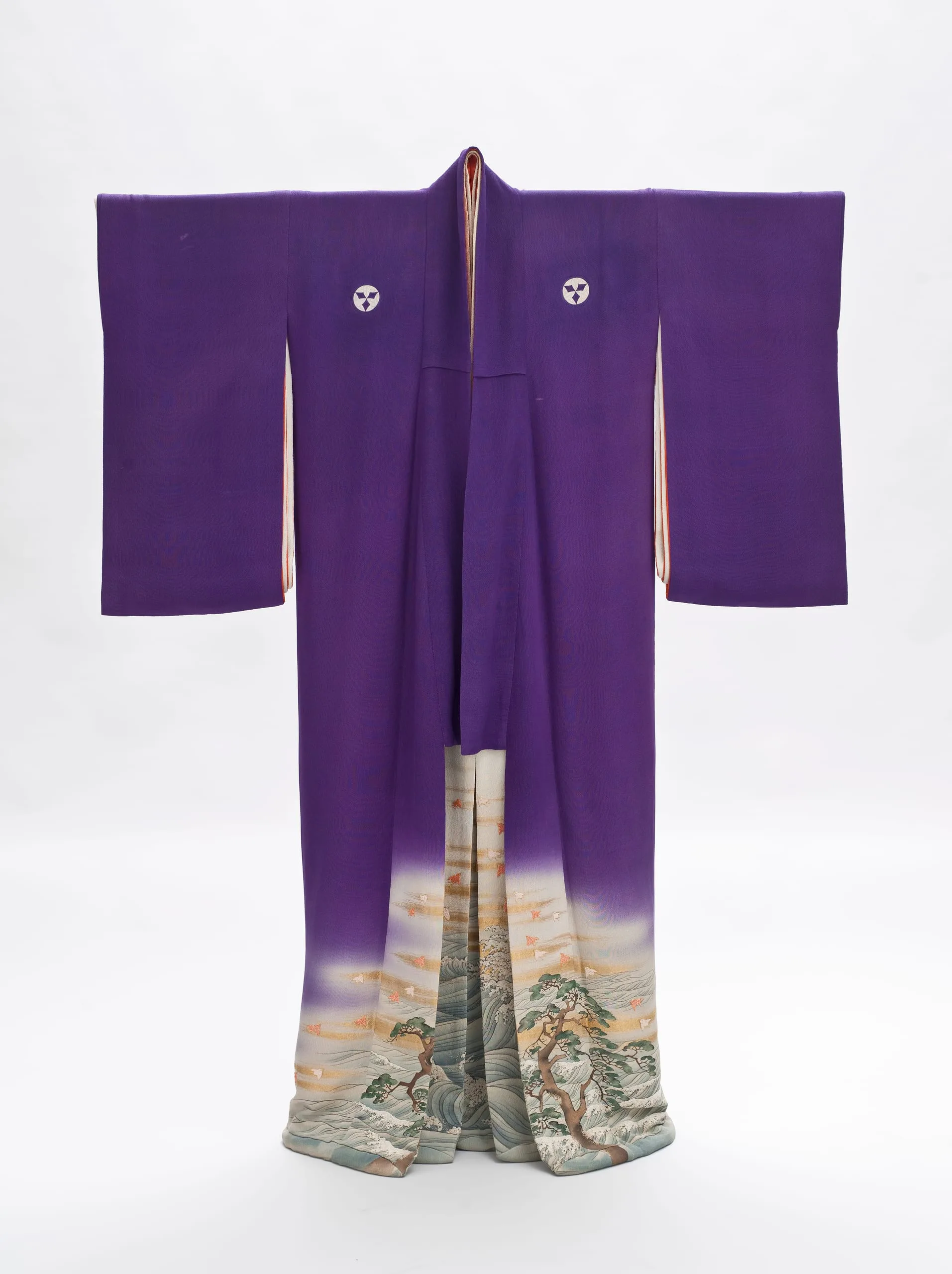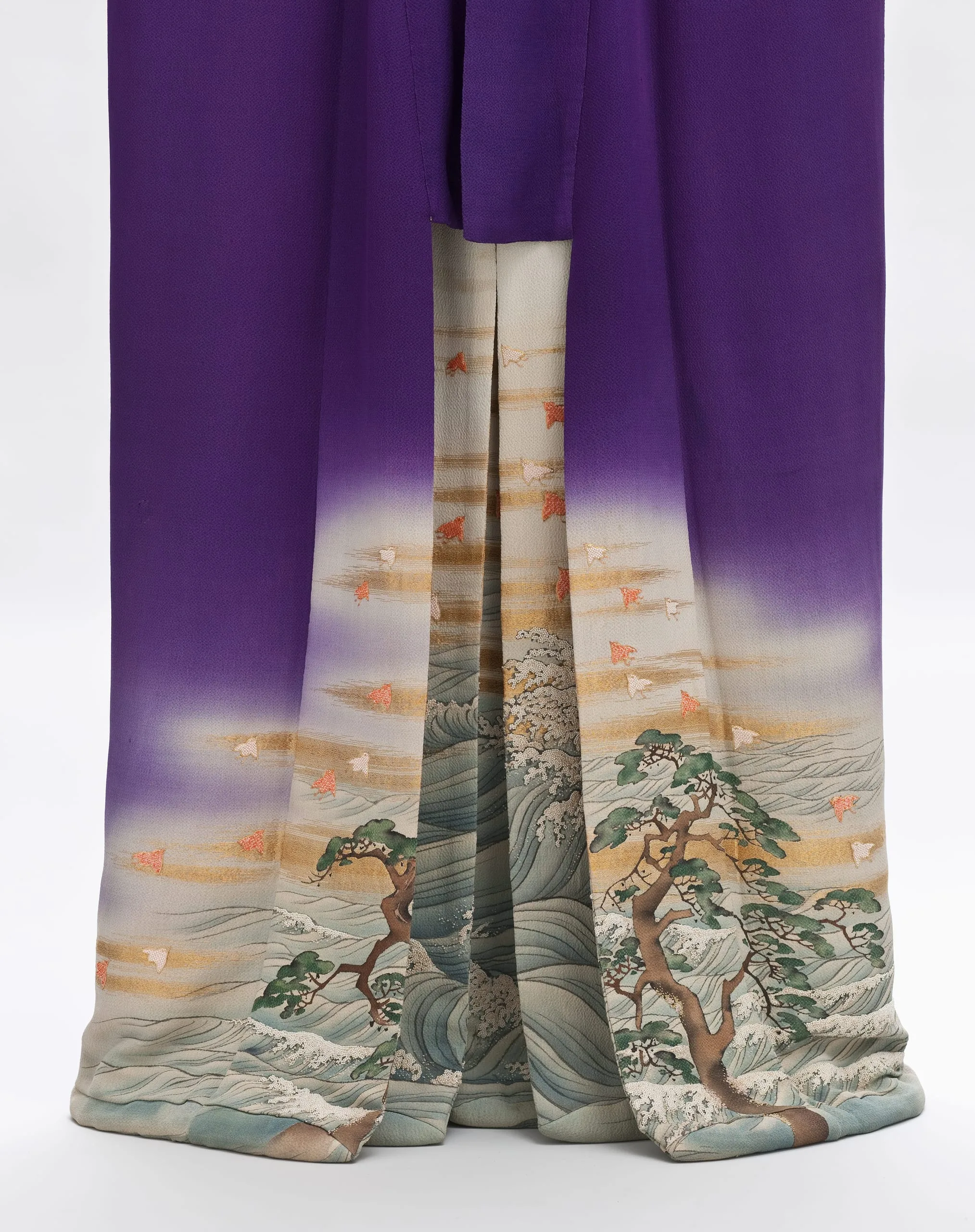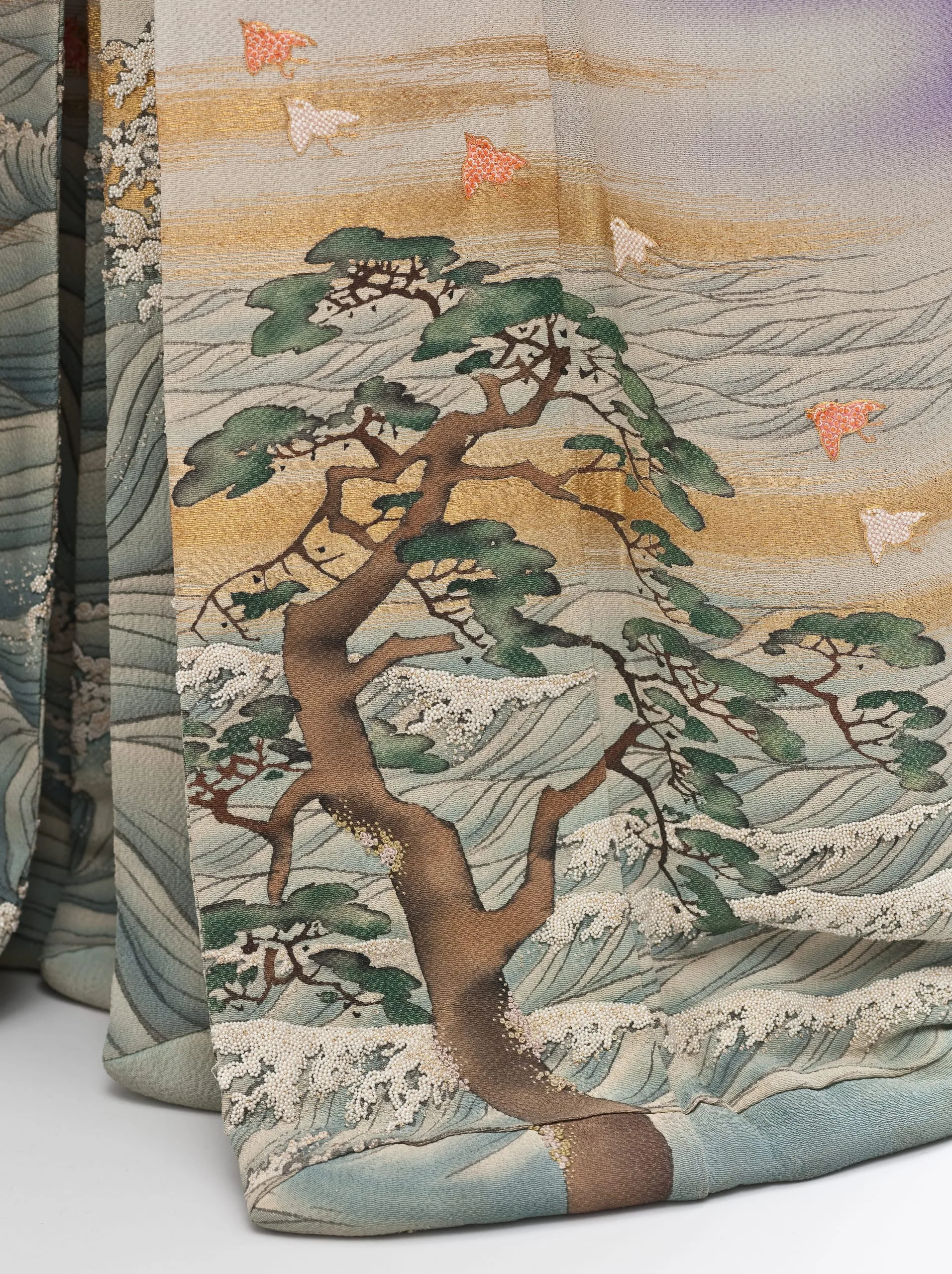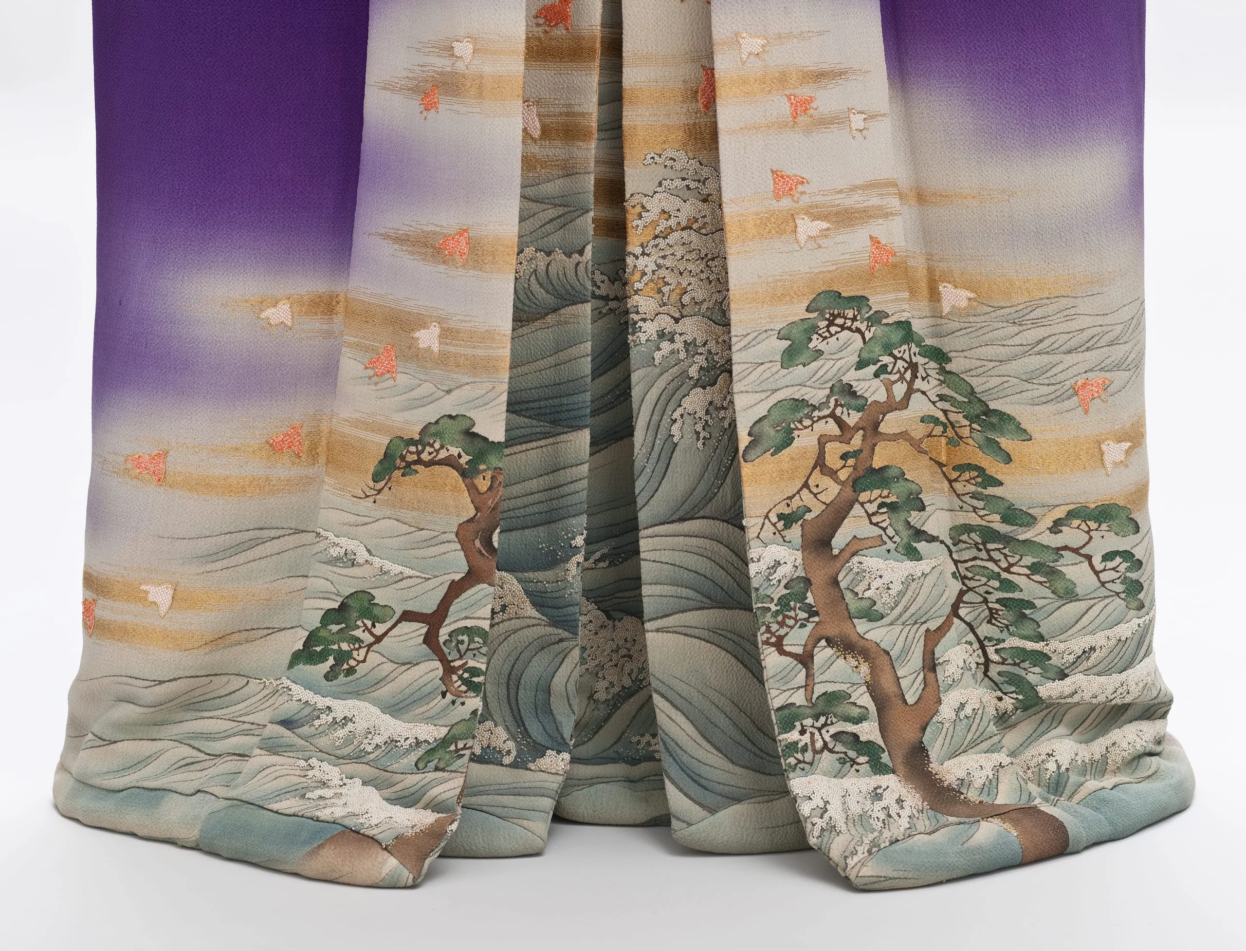 - Innermost Kimono: Silk plain weave (crepe; chirimen) with gilt-paper-wrapped-silk thread supplementary weft patterning, handpainted with ink, pigments and dyes, paste-resist dyed (yuzen), and brush-dyed (hikizome), with silk and gilt-paper-wrapped-silk thread embroidery, seed pearls, and coral beads; Outermost Kimono: Silk plain weave (crepe; chirimen) with gilt-paper-wrapped-silk thread supplementary weft patterning, handpainted with ink and dyes, with silk and gilt-paper-wrapped-silk thread embroidery, seed pearls, and coral beads; Middle Kimono: Silk plain weave (crepe; chirimen) with gilt-paper-wrapped-silk thread supplementary weft patterning, handpainted with ink and dyes, with silk and gilt-paper-wrapped-silk thread embroidery, seed pearls, and coral beads