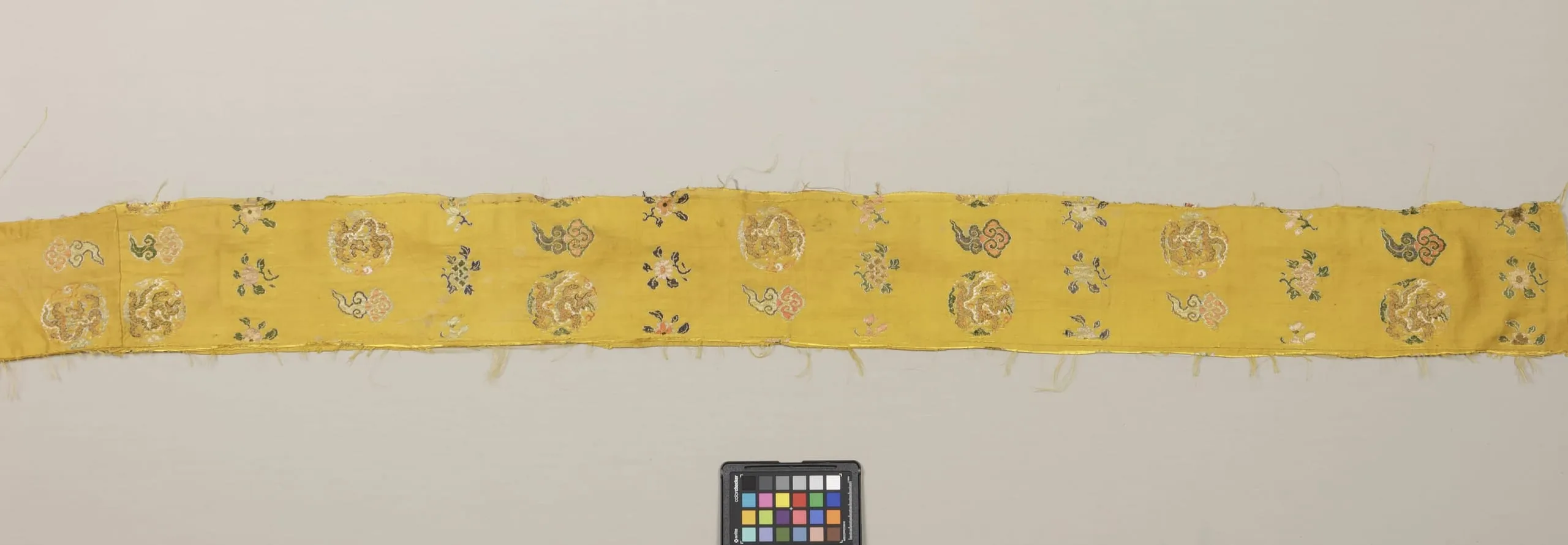 Long horizontal Chinese silk embroidered band with canary-yellow ground, scattered dragon and floral motifs in cream, pink, teal, and green thread, with frayed edges