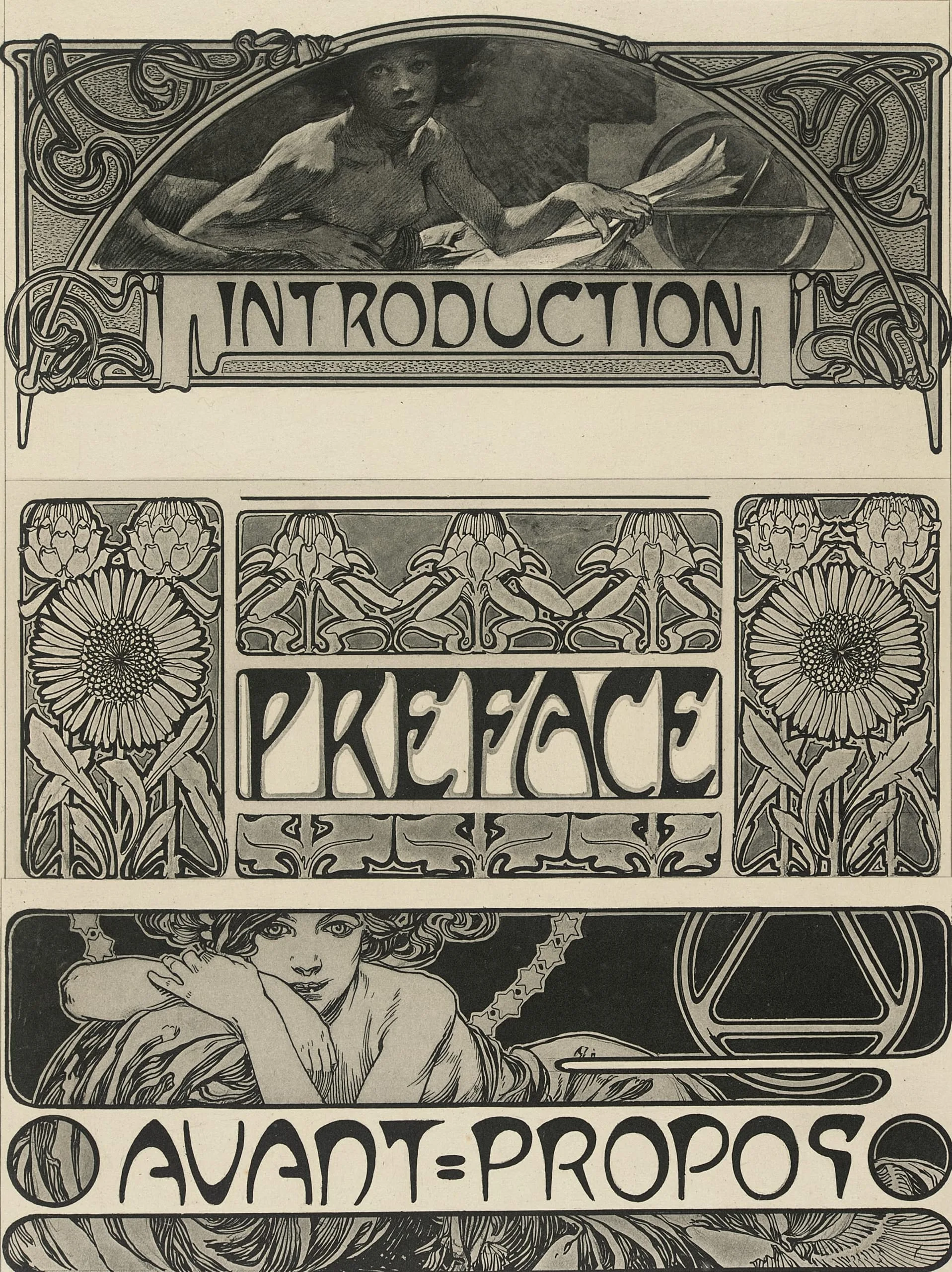 Lithograph with three stacked Art Nouveau decorative panels reading 'Introduction,' 'Preface,' and 'Avant-Propos,' with figural vignettes and floral ornament in black ink on cream paper