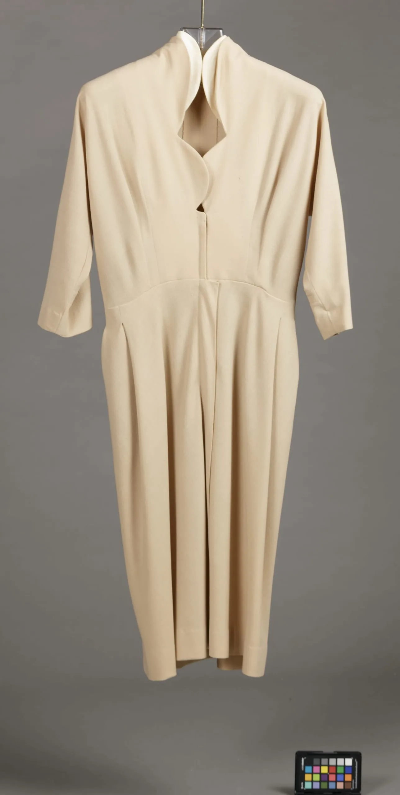 - Dress: Wool plain weave (crepe), cotton doublecloth (pique). Belt: suede leather