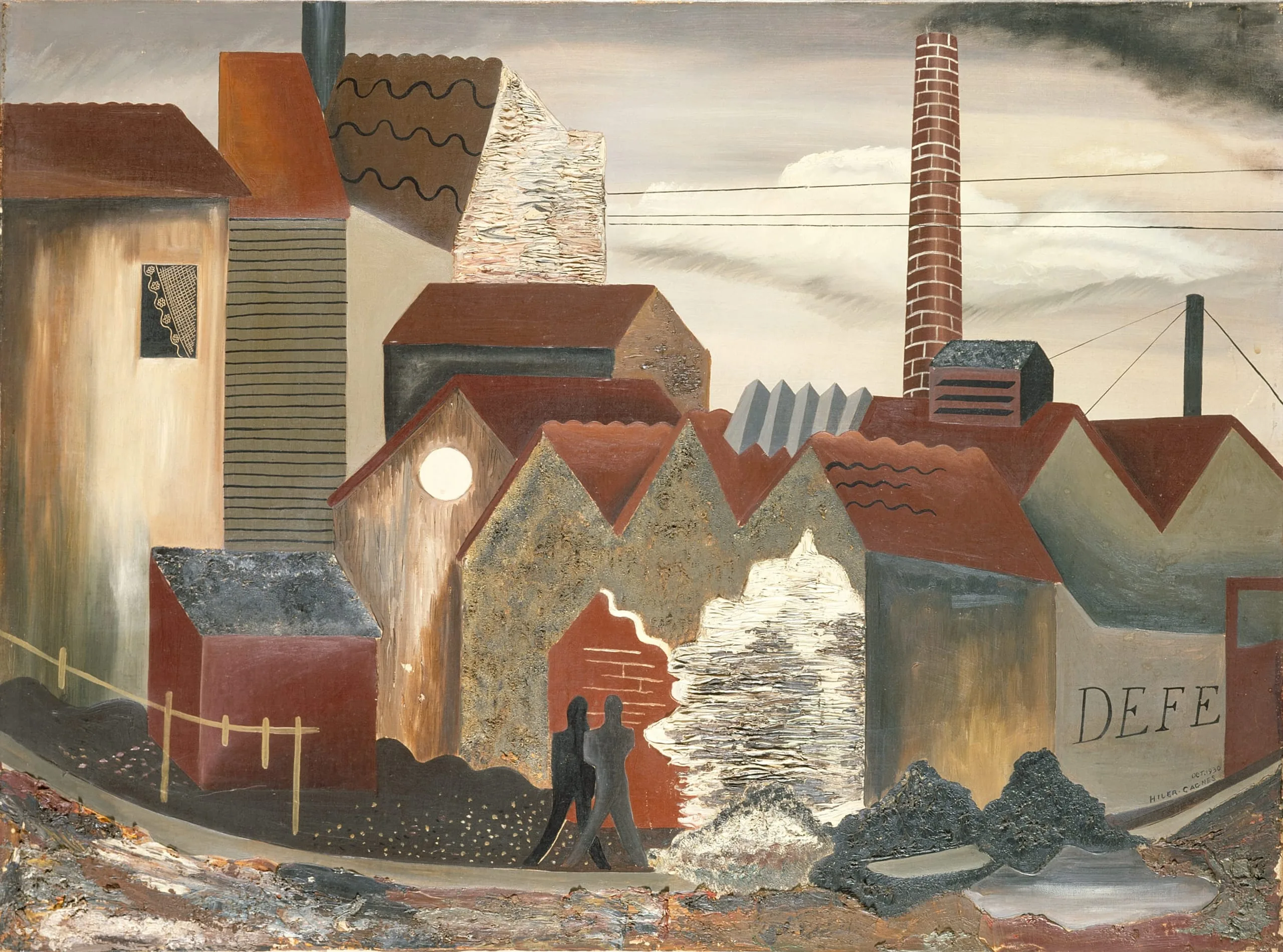 Around 1928 Hiler began to omit the figures from his urban views and focus on the city’s buildings as cubic forms and geometric planes. Eventually, as in Factories at Lyon, he also combined flatly painted surfaces with highly impastoed, striated areas. The textured areas often took on a life of their own, divorced from the overall scene, thereby destroying an already limited sense of painted reality. When Hiler included an occasional figure, he often presented it as a silhouette, as he did here, thereby enhancing the mysterious mood of the scene. Formally, the emphasis on textures relates to synthetic cubism while the flat, planar emphasis of the painting bears a resemblance to some of the precisionist images painted in New York in the 1920s. Not surprisingly, Hiler was a close friend of the artist Niles Spencer (1893-1952). They met in New York around 1917, and when both lived in Paris during the early 1920s they spent many hours discussing artistic issues of subject matter and geometry. However, Hiler’s own abstracted paintings demonstrate a concept invented by him, which Ezra Pound dubbed "neonaturism." As the artist explained in his book Why Abstract?, neonaturism was his attempt to combine design with representation, something which he thought was essential. Hiler felt that for a painting to be successful it had to demonstrate the "physiological appeal satisfying to man’s geometrical instinct through the use of strictly mathematical composition" ("Hiler’s Neo-Naturism in Philadelphia Show," Art Digest 8 [November 1, 1933]: 14).