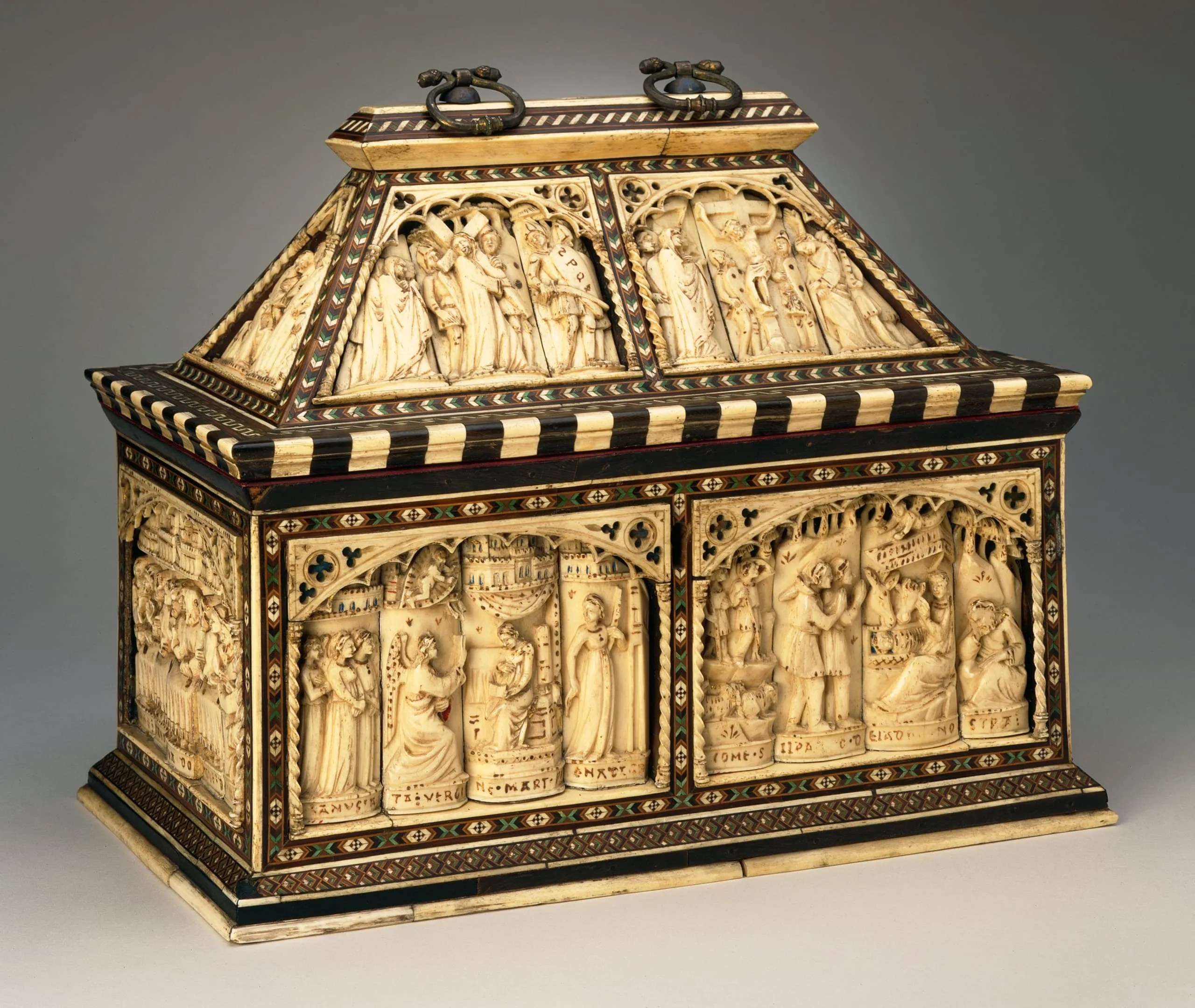 - Carved bone, stained horn, wood, pigment, gilt metal