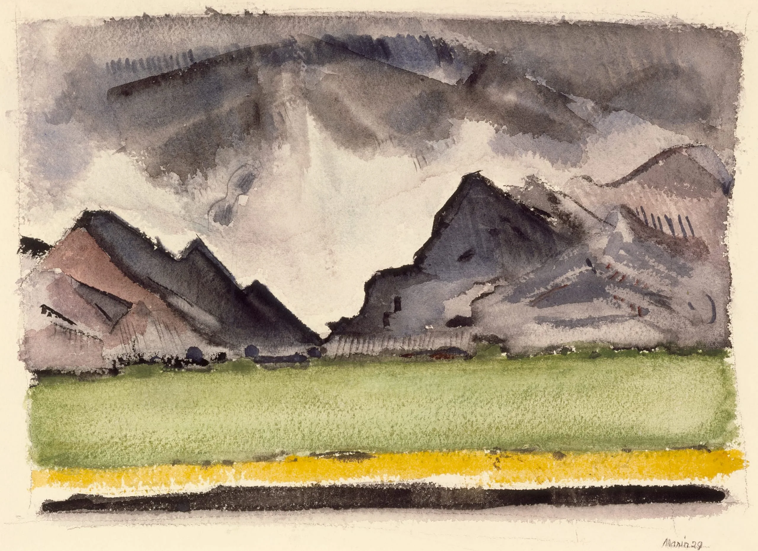 With horizontal stripes of gray, black, brilliant yellow, and bright green he succinctly summarized the flat, open spaces of the plateau. In few New Mexican watercolors of 1929 was Marin so extreme in his synthesis of visual elements, for he usually delineated the sagebrush more literally with swirling brushwork. Marin contrasts the angularity and grayness of the stormy sky and mountains with the plains, creating a visual tension analogous to the sensation felt as a storm approaches.