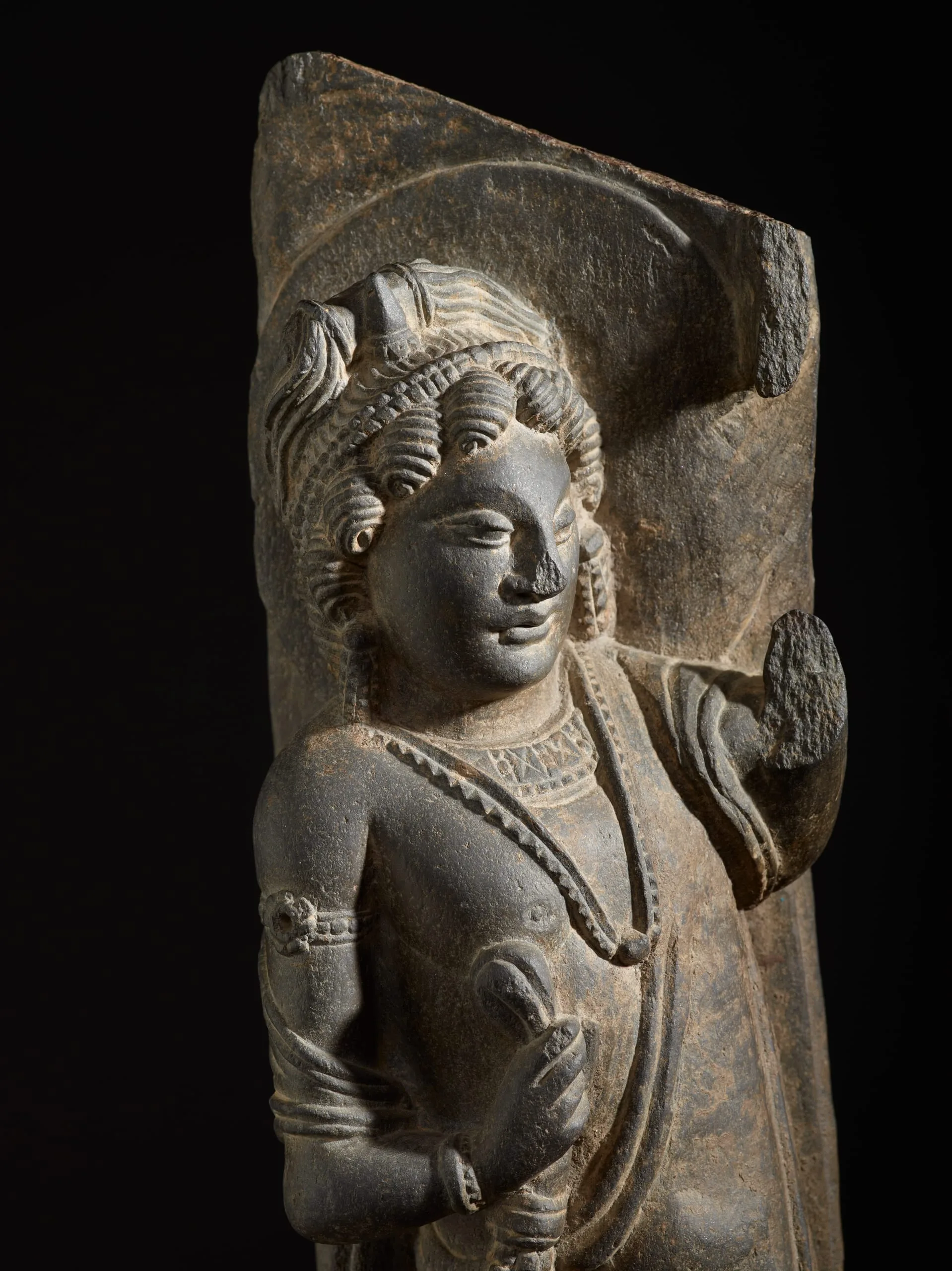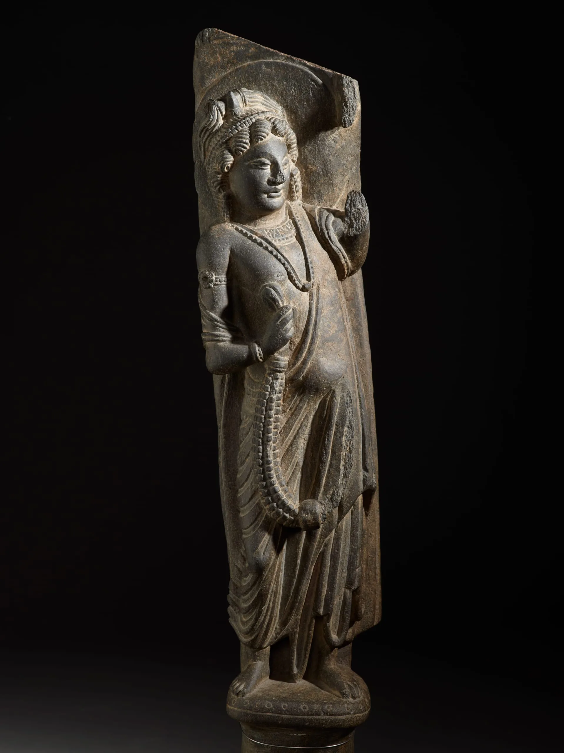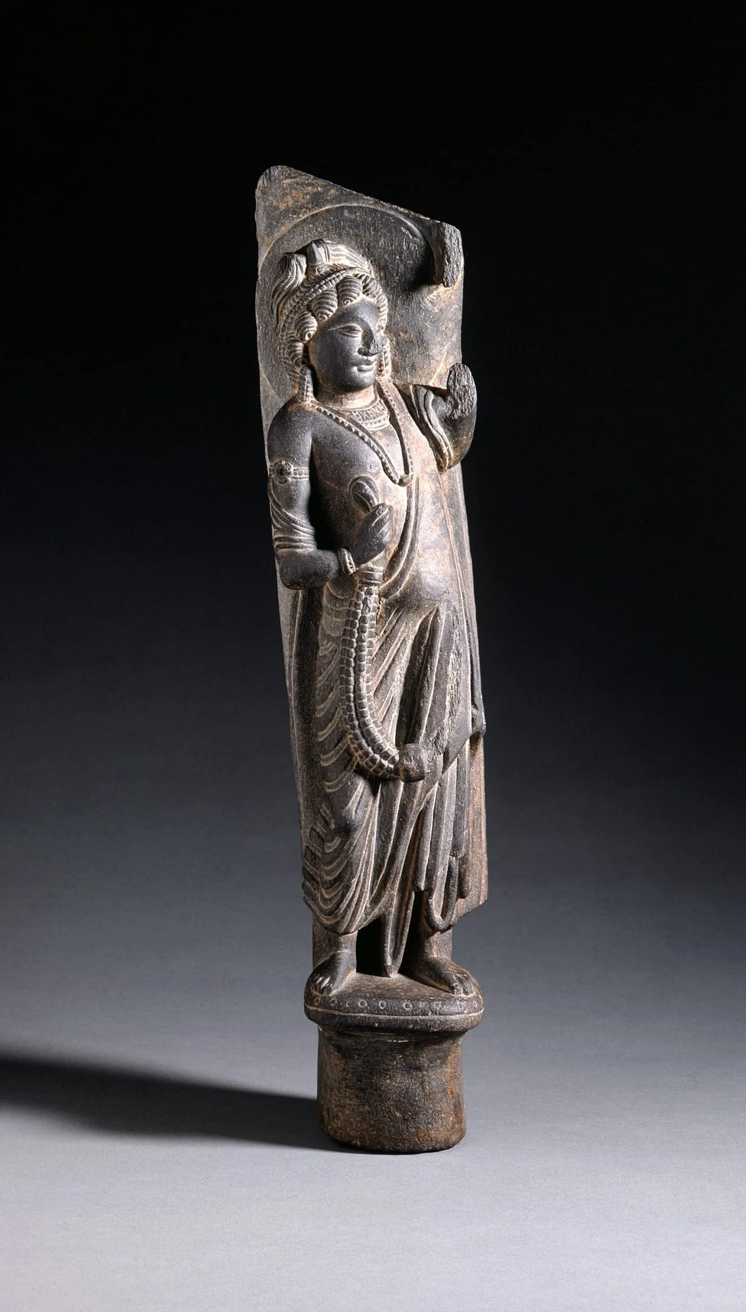 This svelte portrayal of a divine garland bearer (maladhari) symbolically conveyed the bestowing of great spiritual honor. He is turned to his left and, thus, likely originally flanked an image of the Buddha Shakyamuni in an iconic representation or narrative frieze. The youthful figure is nimbate indicating his divinity. He has an elegant coiffure, wears fine jewelry, and stands barefoot on a lotus calyx atop a columnar tang. In his right hand, he holds the end of a long jeweled garland that once continued across his dhoti.