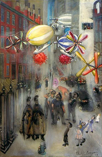 He depicted a narrow city street, typical of the area where he lived in lower Manhattan. During 1946 the house in which he lived was the scene of a murder and drug dealings, events that heightened his general state of anxiety. In the painting the pedestrians’ attention is drawn toward the fantastic objects floating in the sky. The image of a sky chaotically filled with strange objects or birds was typical of Evergood’s postwar paintings. The appearance of the colorful, striped flying machines at first seems innocent enough; their shape, however, recalls the airships that crowded the skies of Europe during the war. The other floating objects resemble underwater mines. The onlookers’ expressions range from wonder and excitement to apprehension, suggesting that the ordinary citizen did not fully comprehend the ramifications of these war machines. Another ominous note to this bizarre scene is the sinister presence of the fat twins in the foreground, whose hats and cloaks may be military uniforms.