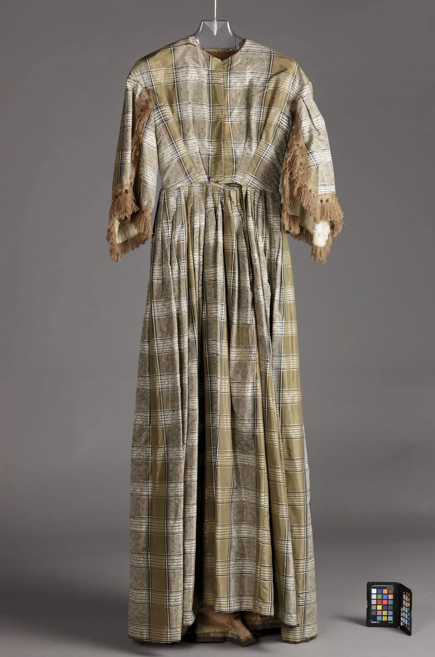 - Silk plain weave, warp printed (chiné taffeta), with silk supplementary-weft patterning and silk passementerie