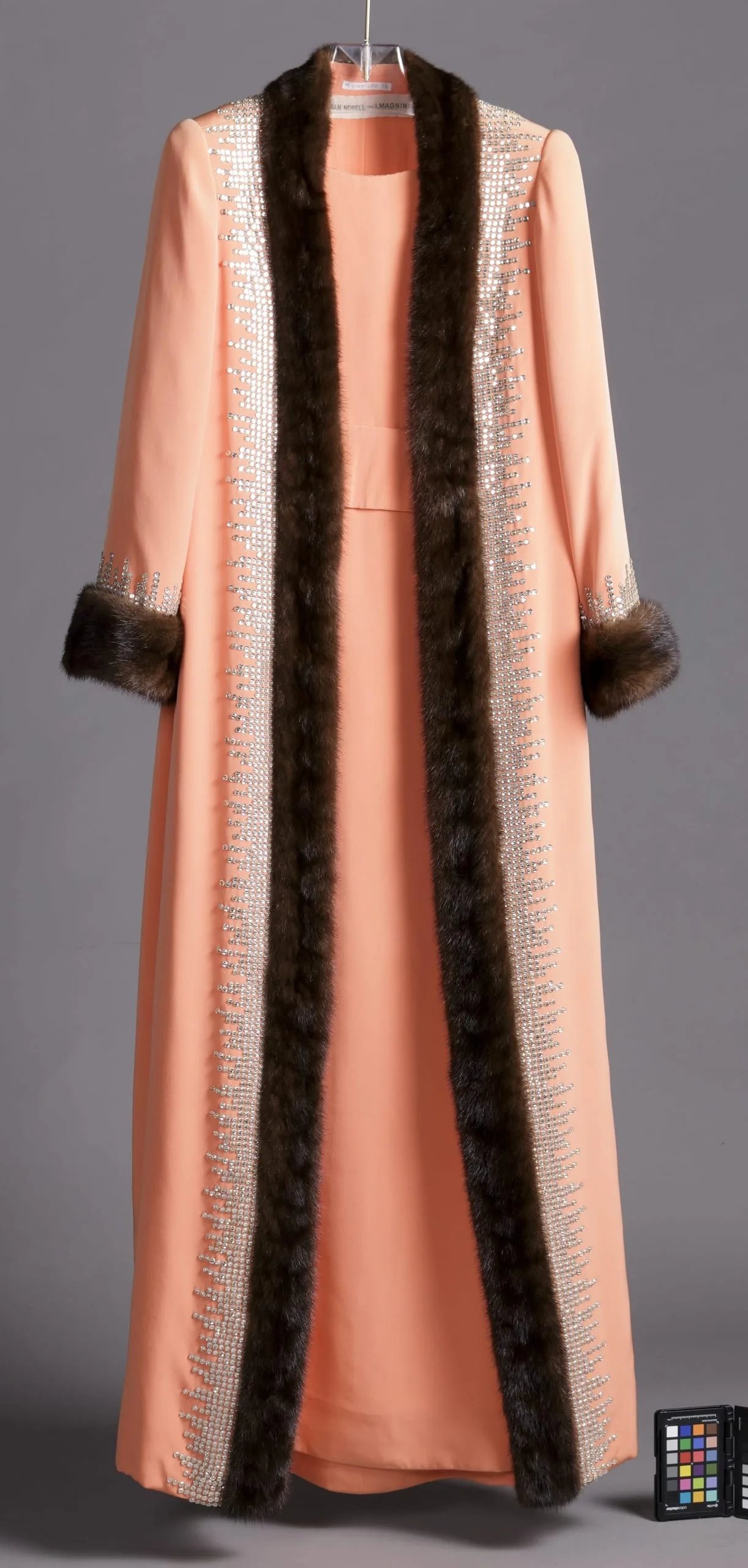 - Dress: Silk plain weave (crepe); Coat: silk plain weave (crepe) with mink fur and crystals