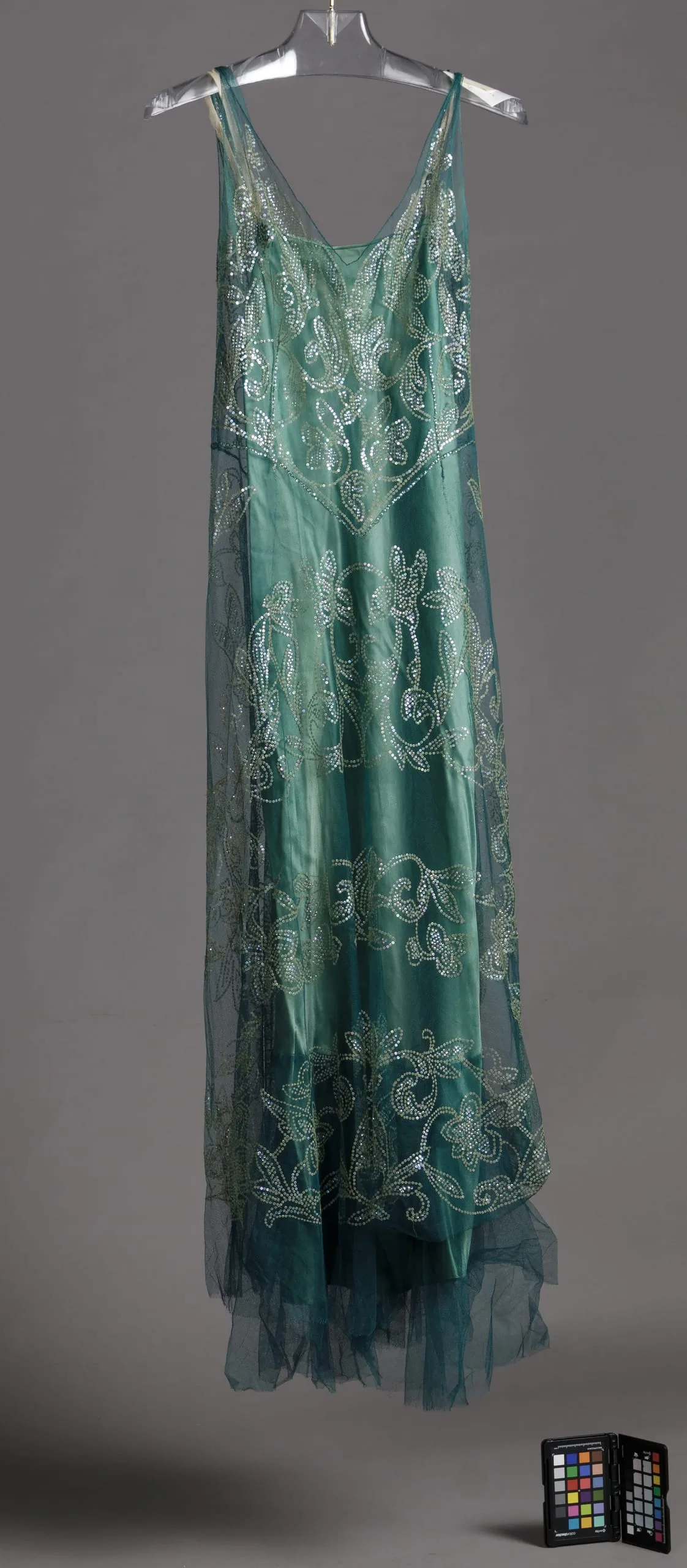 - Dress: silk net with celluloid sequins; Slip: silk satin with silk net
