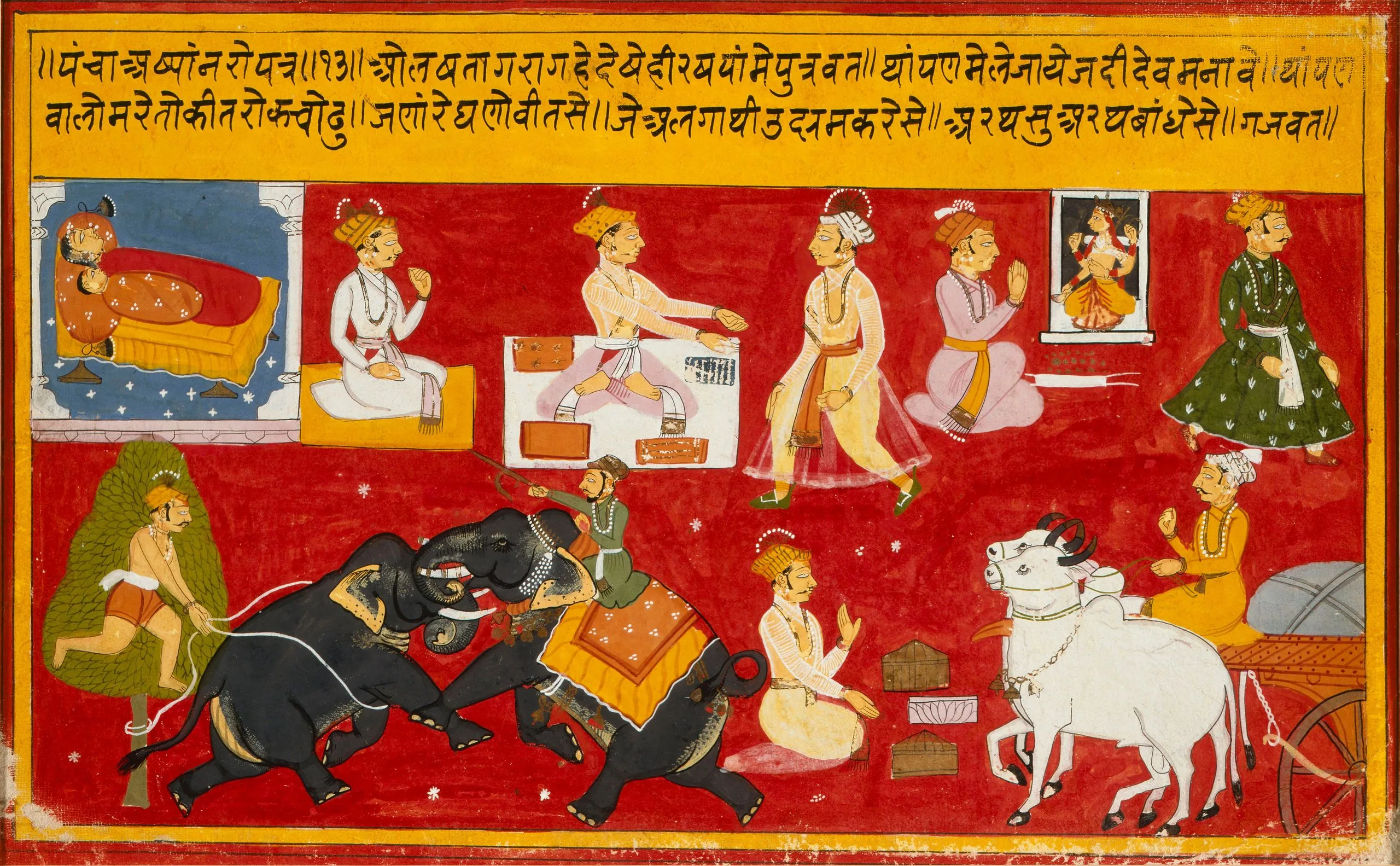 This painting is folio no. 13 from a dispersed series of the Panchakhyana (a Jain recension of the Panchatantra). The Panchatantra (Five Treatises) is an ancient compendium of interwoven allegorical and moralistic fables, many involving anthropomorphized animals with human virtues and vices. The original Sanskrit text is indecisively ascribed to Vishnu Sharma and likely dates from 300-200 BCE, but the animal tales are presumably incorporated from a much earlier oral folklore tradition. The Panchatantra tales form one of the bases of Aesop’s Fables and numerous other renditions of the animal stories in myriad languages worldwide. The Panchakhyana, the Jain recension of the Panchatantra edited by the Jain monk Purnabhadra in 1199 CE, was particularly popular in western and central India. Here, although the descriptive text in the header has yet to be translated, the story appears to illustrate in what is likely continuous narration a merchant engaged in various commercial activities, a sleeping mother and child, an offering being made to an image of the goddess Durga, and an elephant battle. See also M.90.160.2.