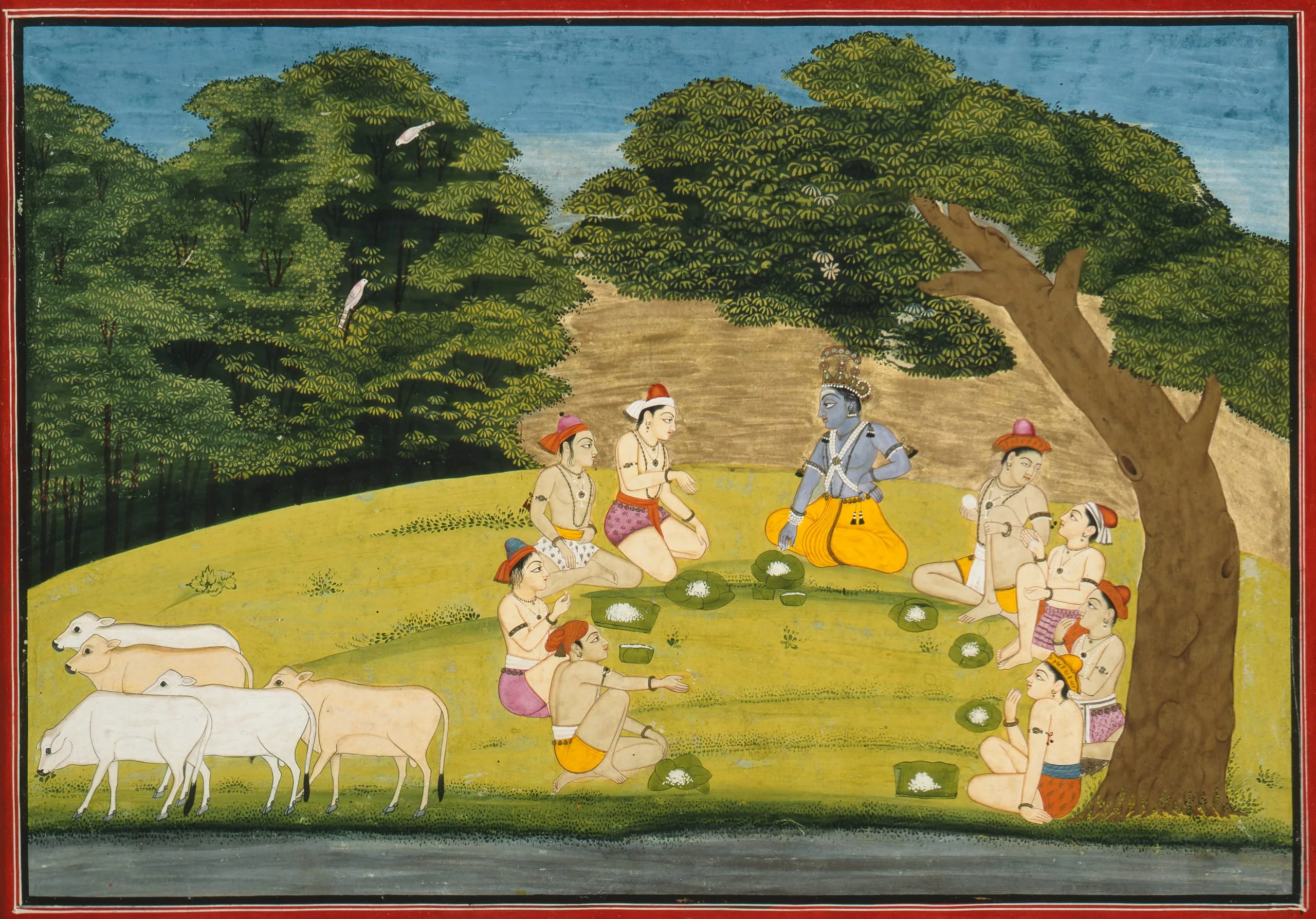 Krishna is an incarnation of Vishnu, the preserver of the universe. Krishna’s childhood in pastoral Vrindavan was marked by bucolic bliss, miraculous events, and his frequent triumph over demonic forces. In this folio from a dispersed Bhagavata Purana (Ancient Stories of the Lord), Krishna and the cowherds are shown sitting under the shade of a tree eating rice on banana leaf plates. The amiable lunch is described in the Sanskrit verses inscribed on the folio’s reverse (Bhagavata Purana 10:13:8-11):