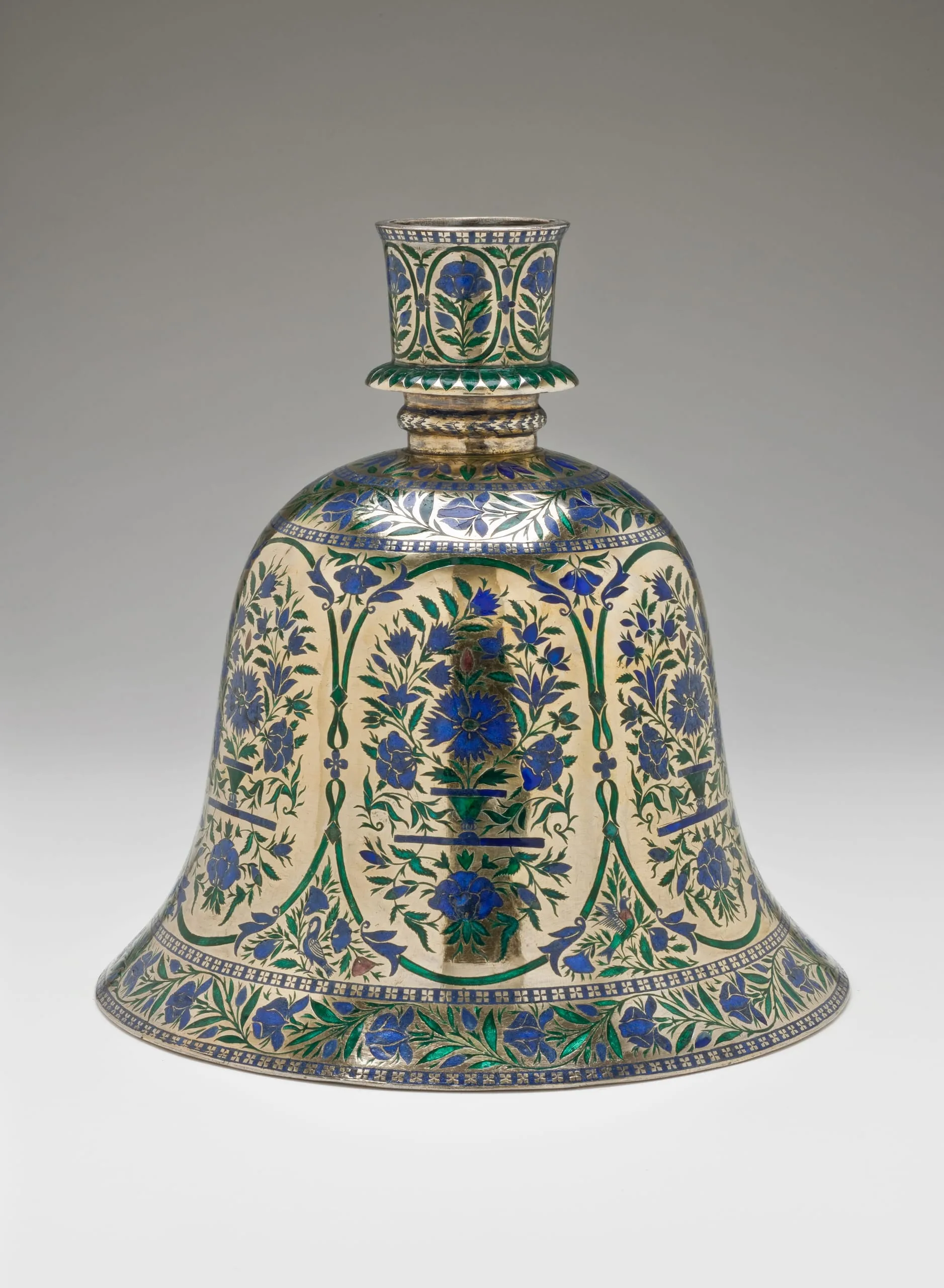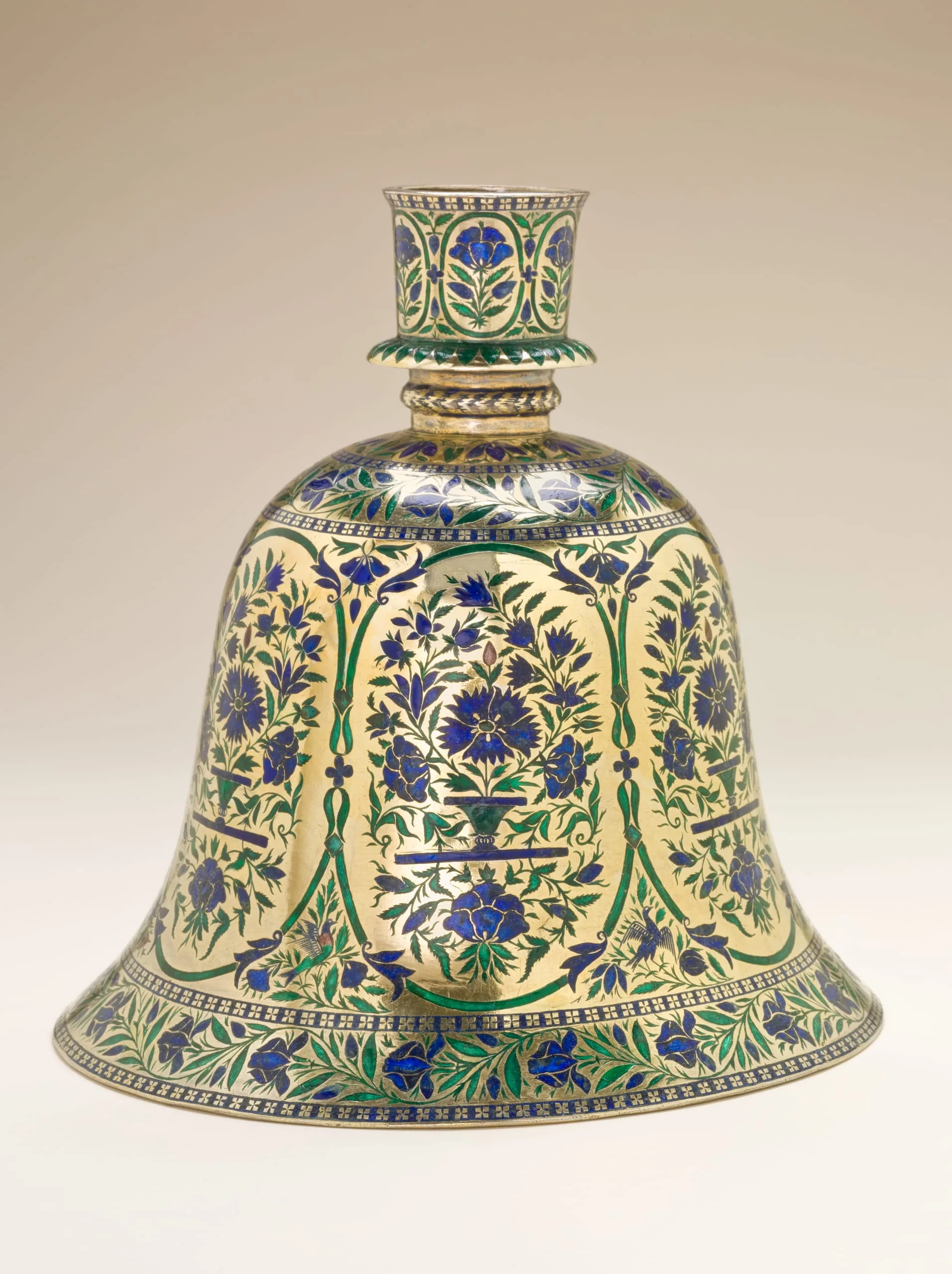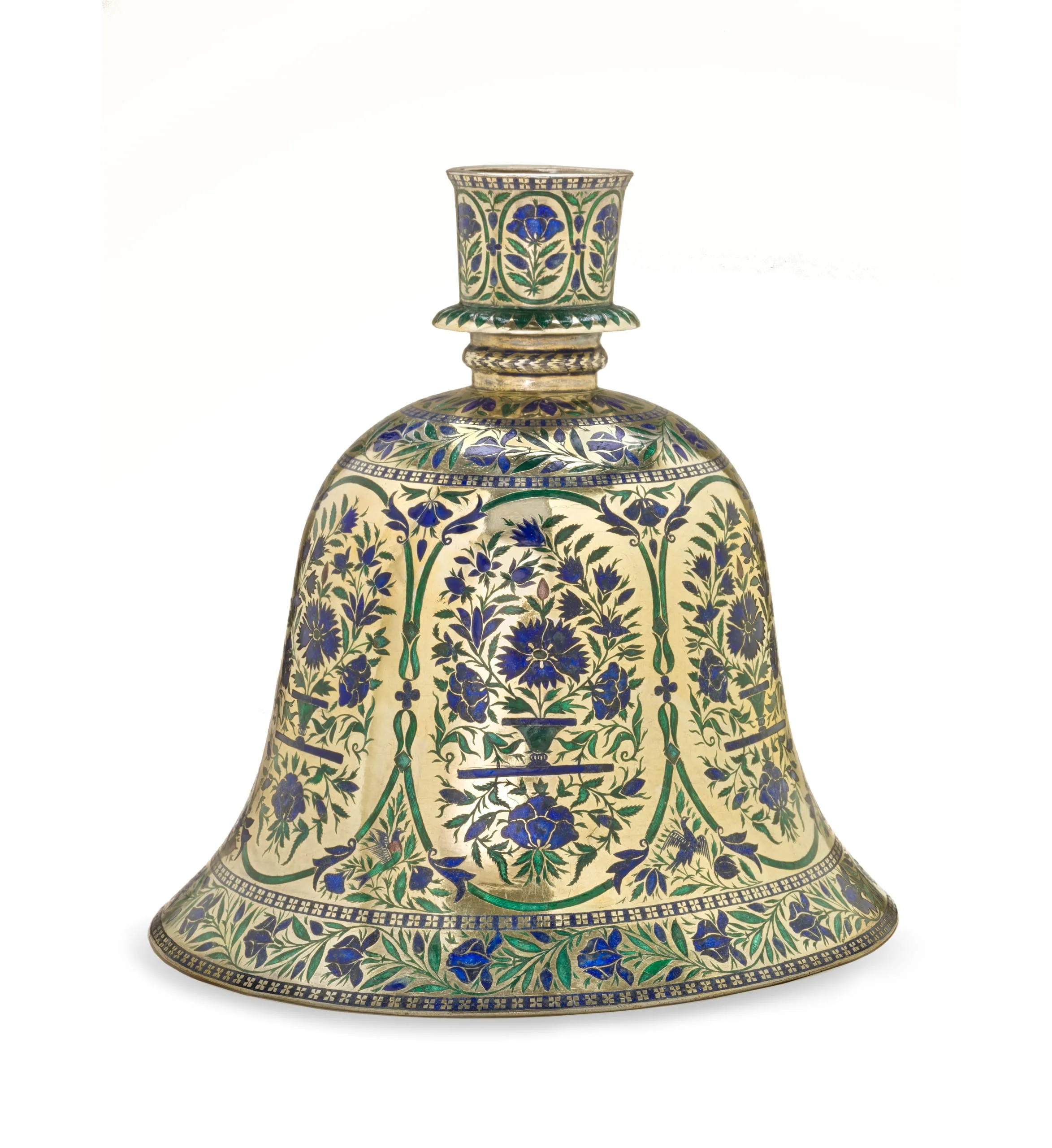 Comparable Lucknow enameled hookah bases are in the Metropolitan Museum of Art, New York (2015.500.4.15) and Victoria and Albert Museum, London (IS.122-1886).