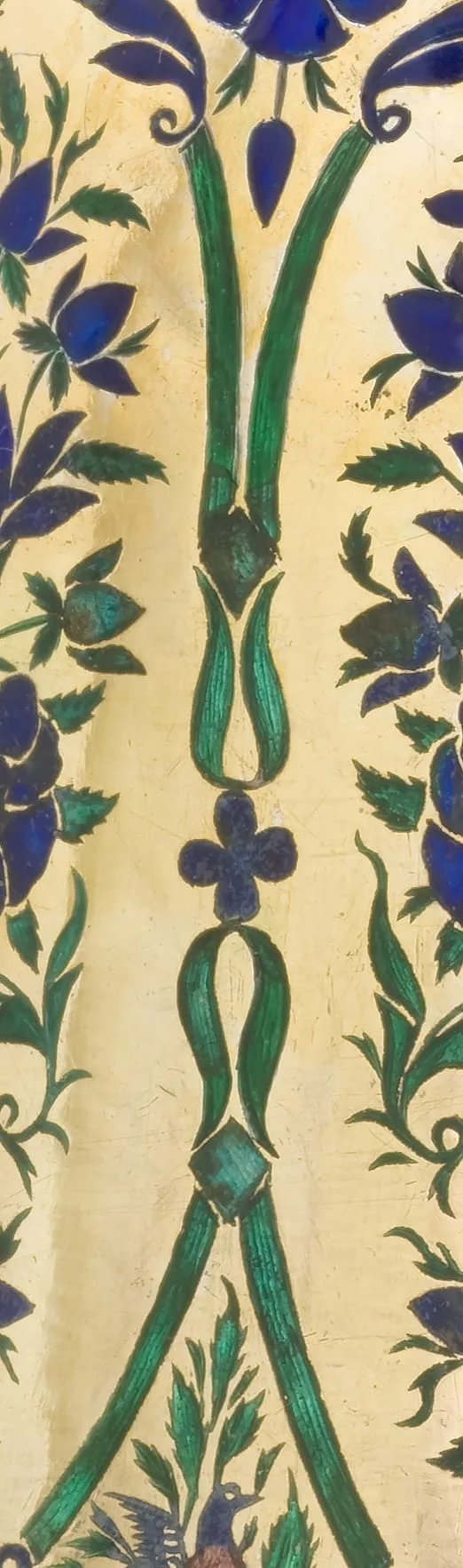 The bell-shaped hookah base is made of gilded silver with elegant floral and avian designs in translucent blue, green, and aubergine enamel. Beneath the slightly flaring mouth is an arcade with six cartouches, each containing an identical poppy (Papaver somniferum). The vessel’s shoulder and splayed foot are each decorated with a meandering iris scroll. The vessel body has six cartouches, each with an identical hybrid flowering plant with a central blossom inspired by a dianthus or carnation. It is flanked by poppies, lilies, and lotuses or tulips growing unrealistically from the same two stalks. A small bud in translucent aubergine accentuates the vertical axis, and this same color is used, occasionally and inconsistently, to highlight small areas of the flora and fauna decoration in the spandrels. The poppy plants emerge from a translucent green footed vase that has a prominent ring molding with vertical ribs.