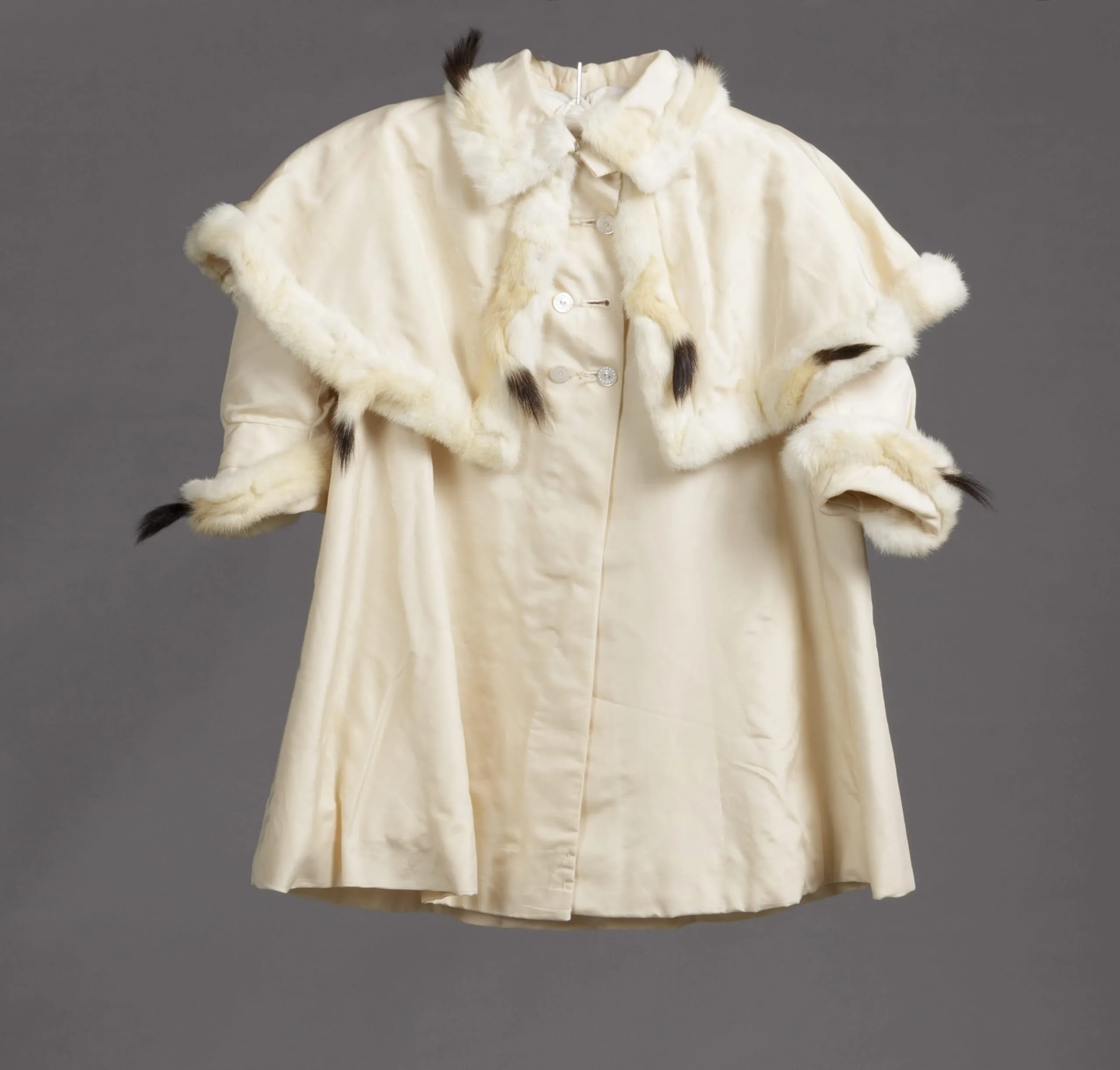 - a) silk plain weave (faille), ermine fur trim, and mother of pearl buttons