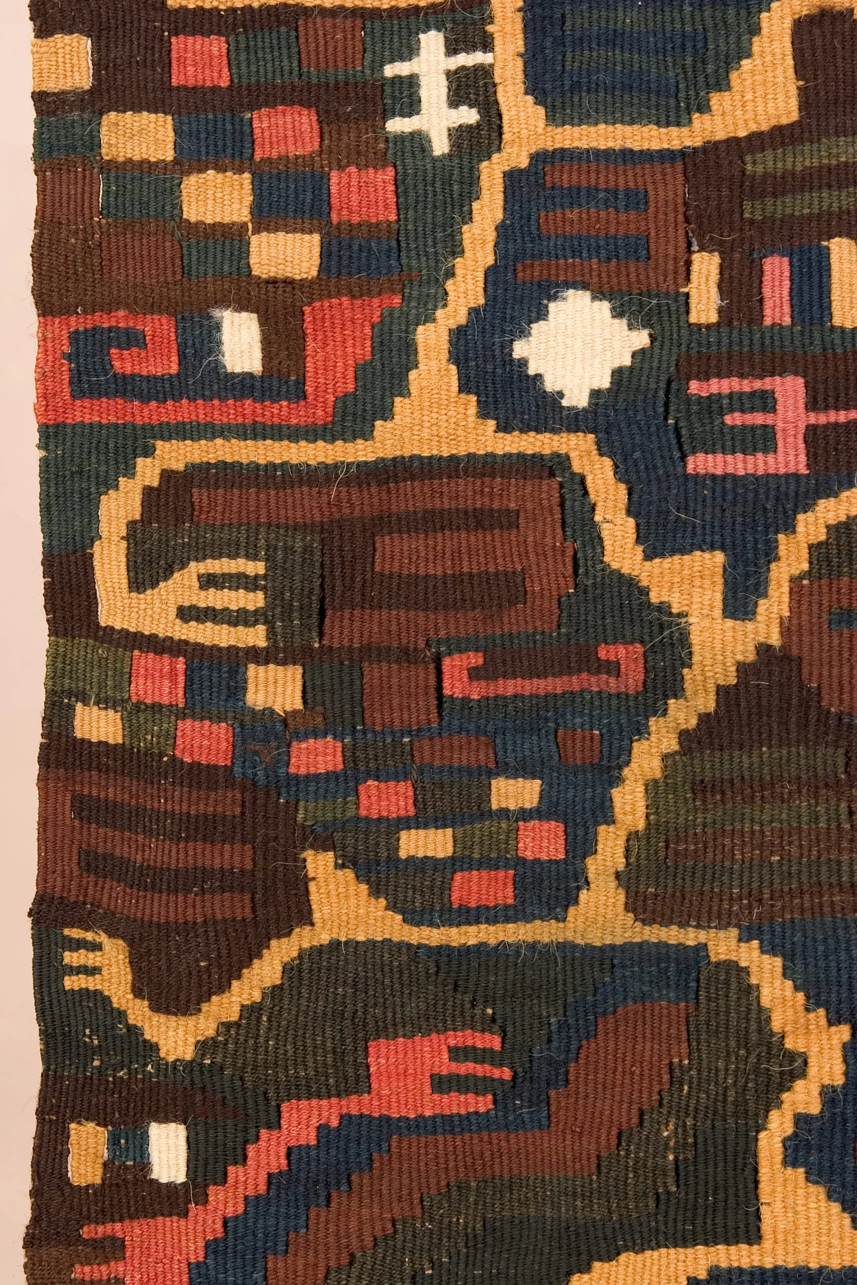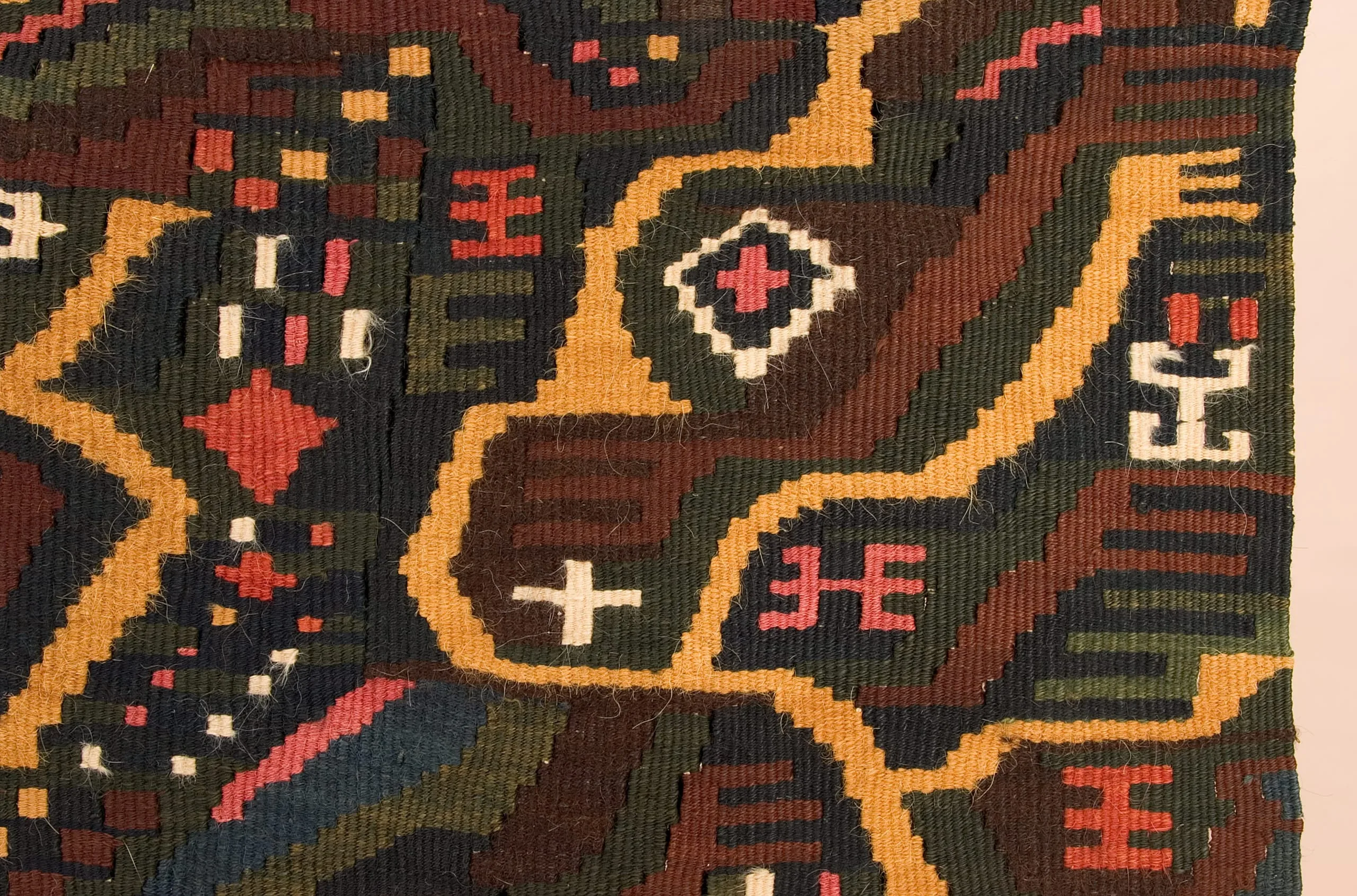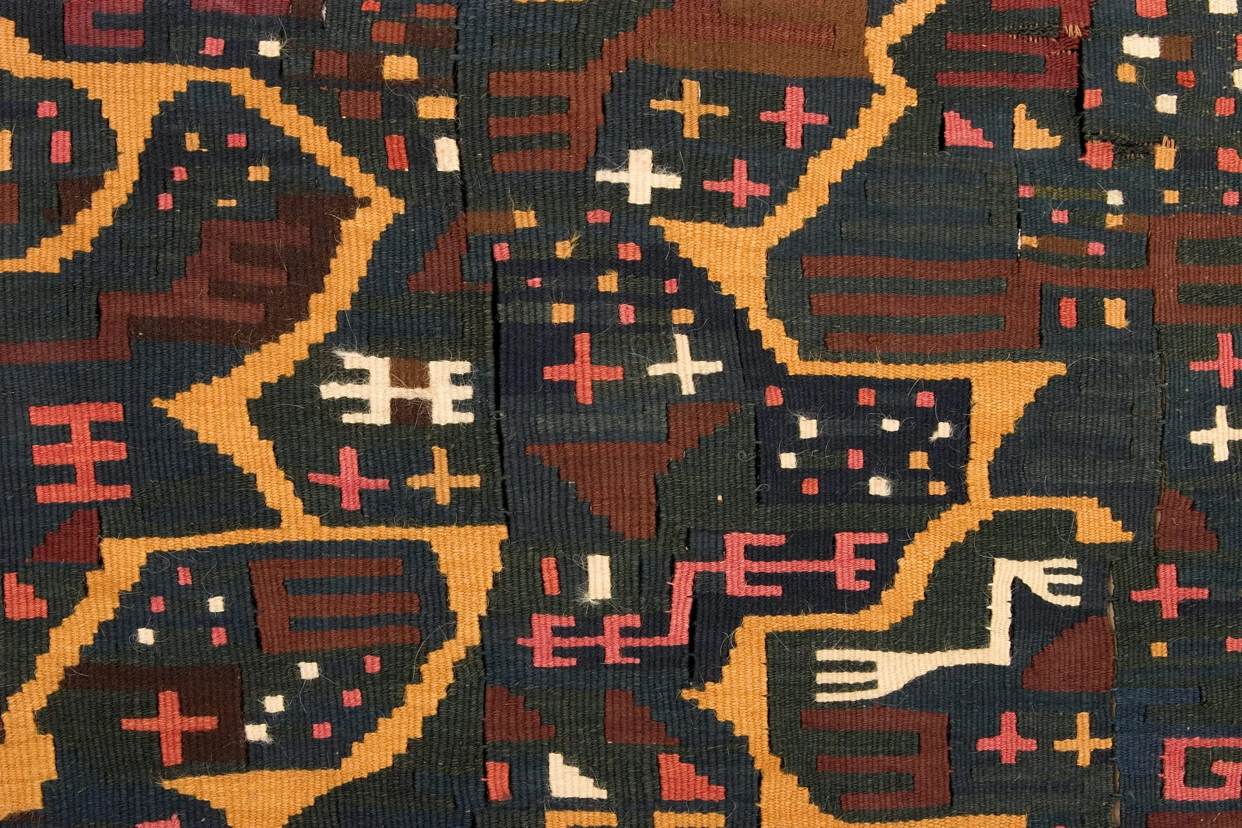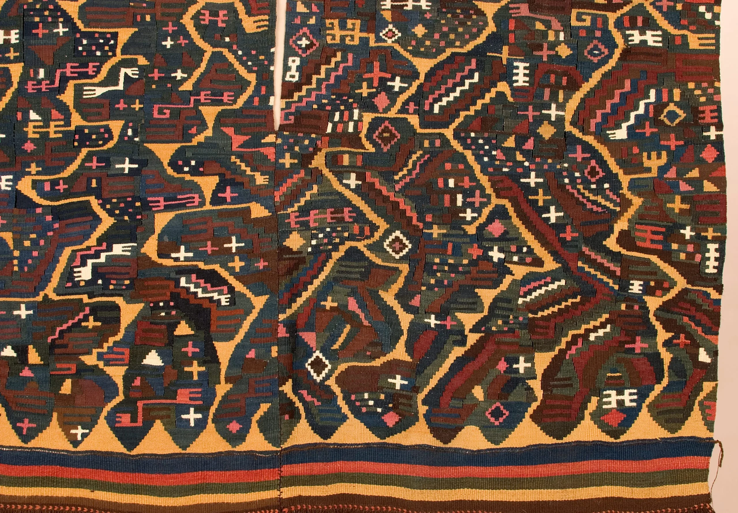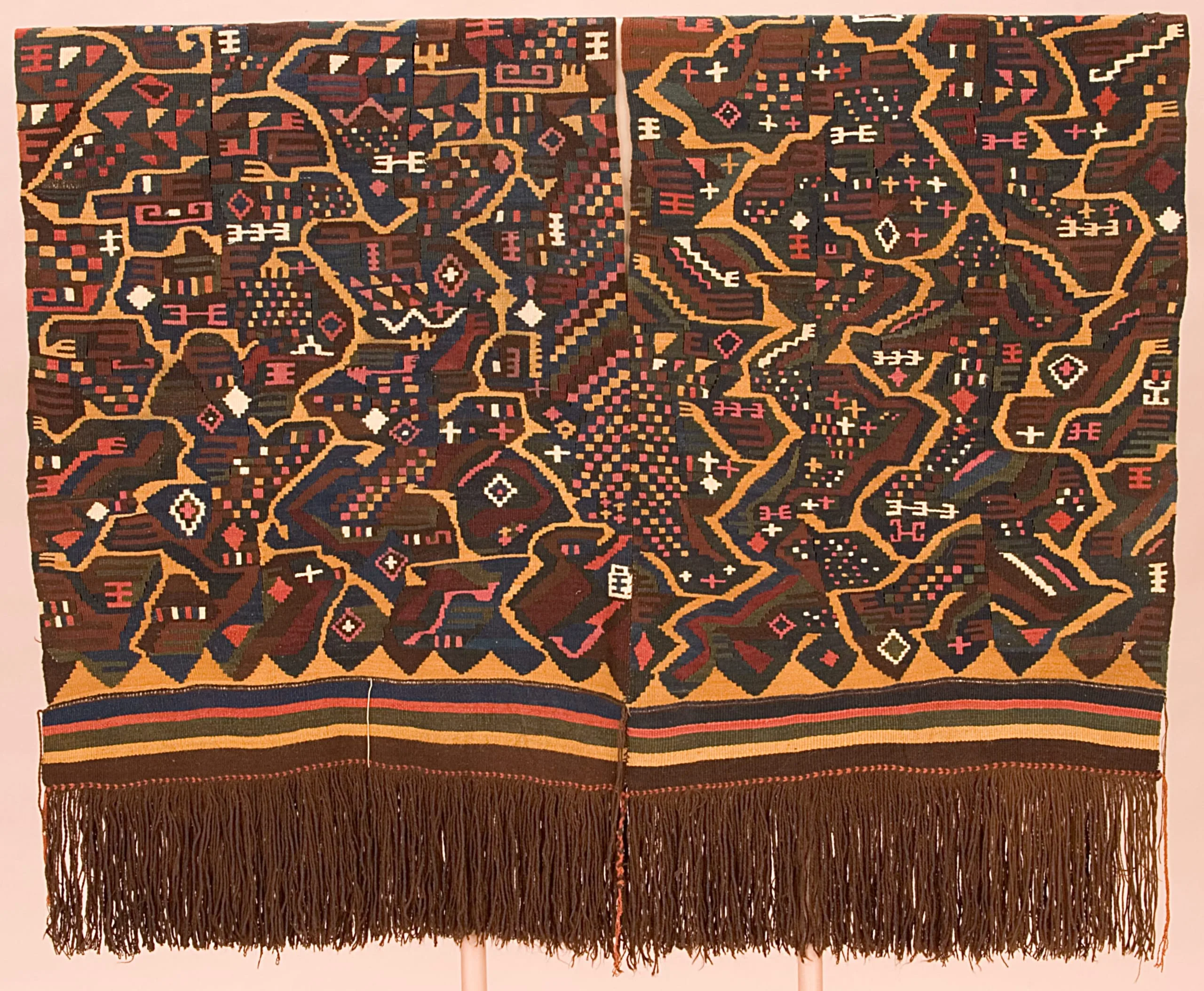 The tunic's most significant pattern, a three-pronged trident or pitchfork-like form, might be an emblem for Nasca underground water canals, but is more likely an abstraction of the clawed paw of the feline-an enduring totem in Pre-Columbian iconography. Symbolizing nature's raw predatory force, the feline recurs frequently in the Peruvian textile vocabulary. The "paw" tracks back and forth in a dynamic gold zigzag, traversing fields of iconic designs traditional to all Nasca textiles. But behind the bright colors, creating a stable support for the chaotic brilliance of gold, pink and white, is a matrix of interlocking "paws" woven in a remarkably subtle combination of rich and somber hues. The repetition of this religious symbol in multiple chromatic layers connects the wearer of this monumental garment to his universe.