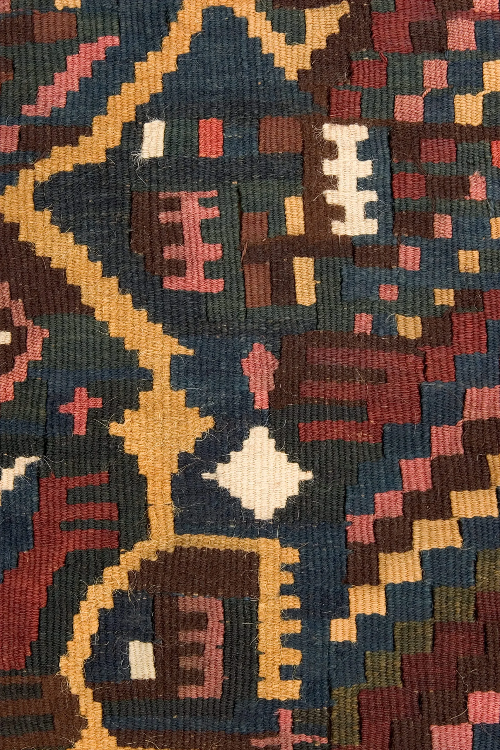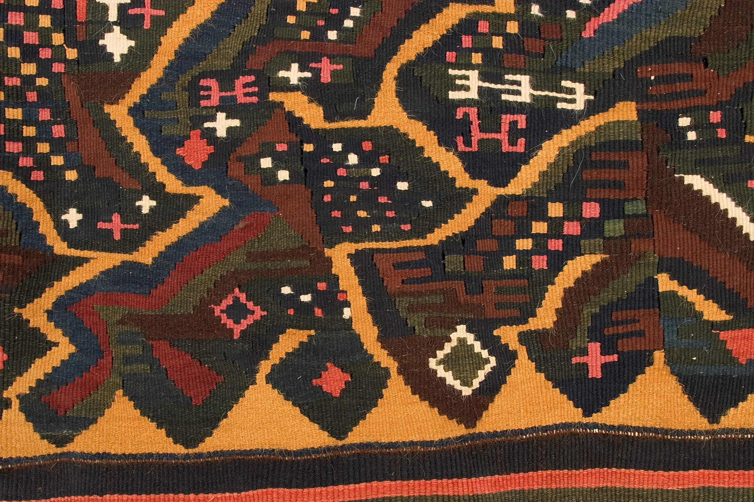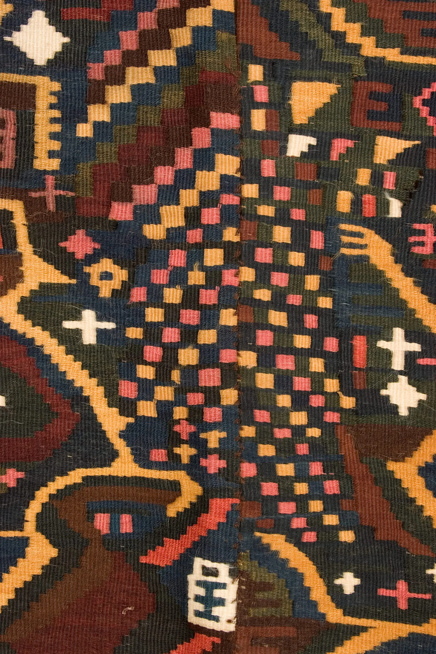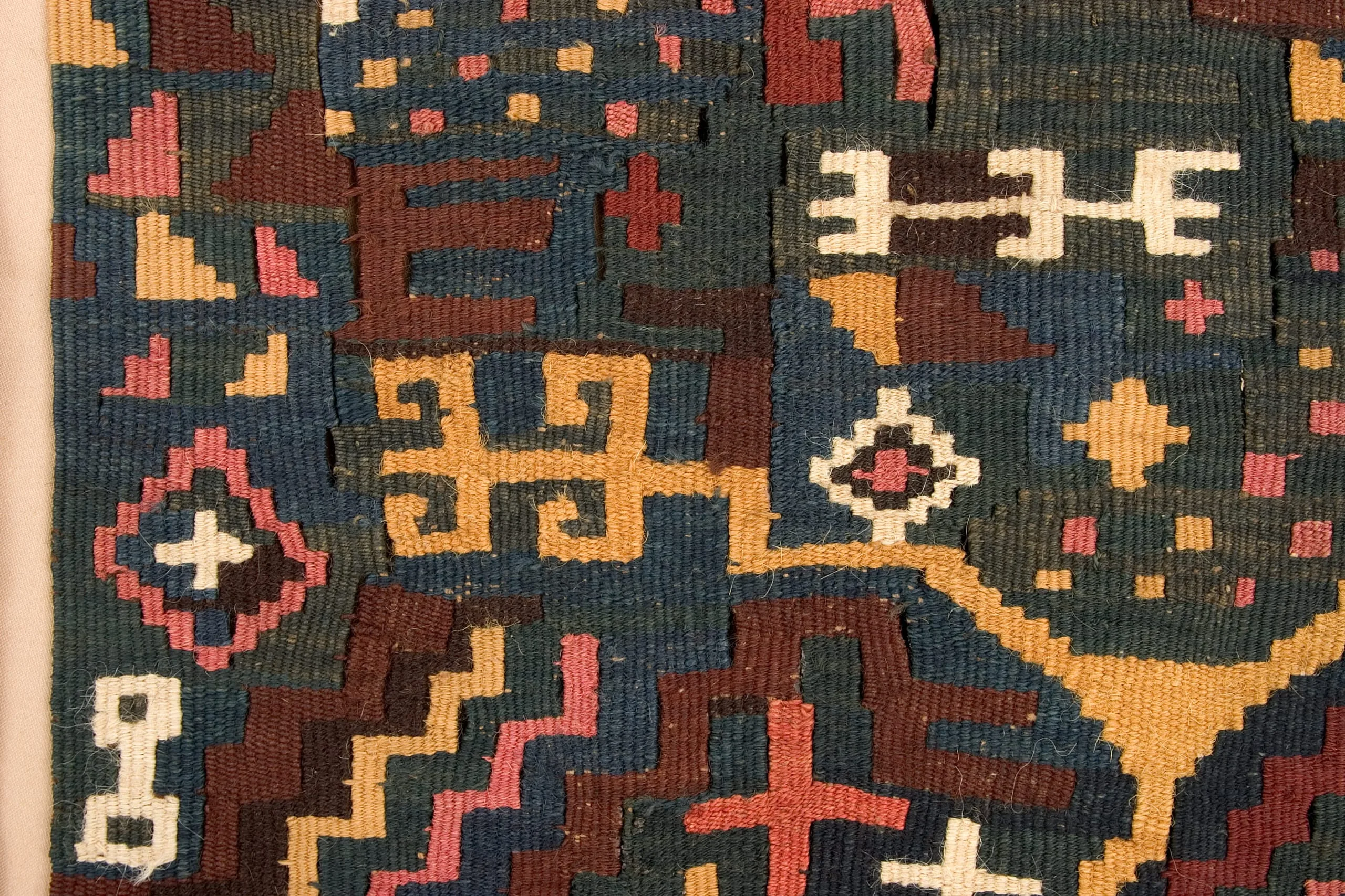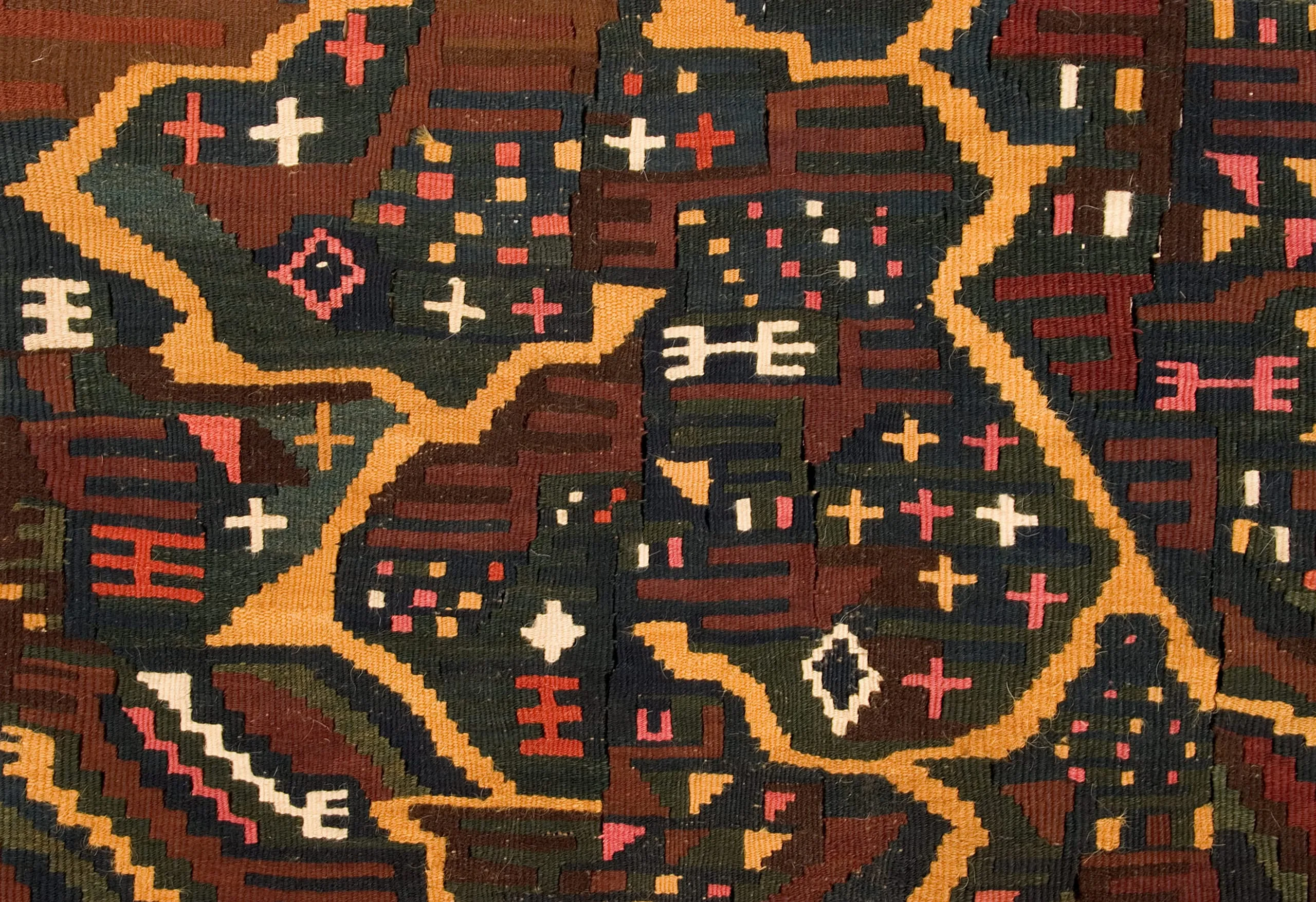 The tunic's most significant pattern, a three-pronged trident or pitchfork-like form, might be an emblem for Nasca underground water canals, but is more likely an abstraction of the clawed paw of the feline-an enduring totem in Pre-Columbian iconography. Symbolizing nature's raw predatory force, the feline recurs frequently in the Peruvian textile vocabulary. The "paw" tracks back and forth in a dynamic gold zigzag, traversing fields of iconic designs traditional to all Nasca textiles. But behind the bright colors, creating a stable support for the chaotic brilliance of gold, pink and white, is a matrix of interlocking "paws" woven in a remarkably subtle combination of rich and somber hues. The repetition of this religious symbol in multiple chromatic layers connects the wearer of this monumental garment to his universe.